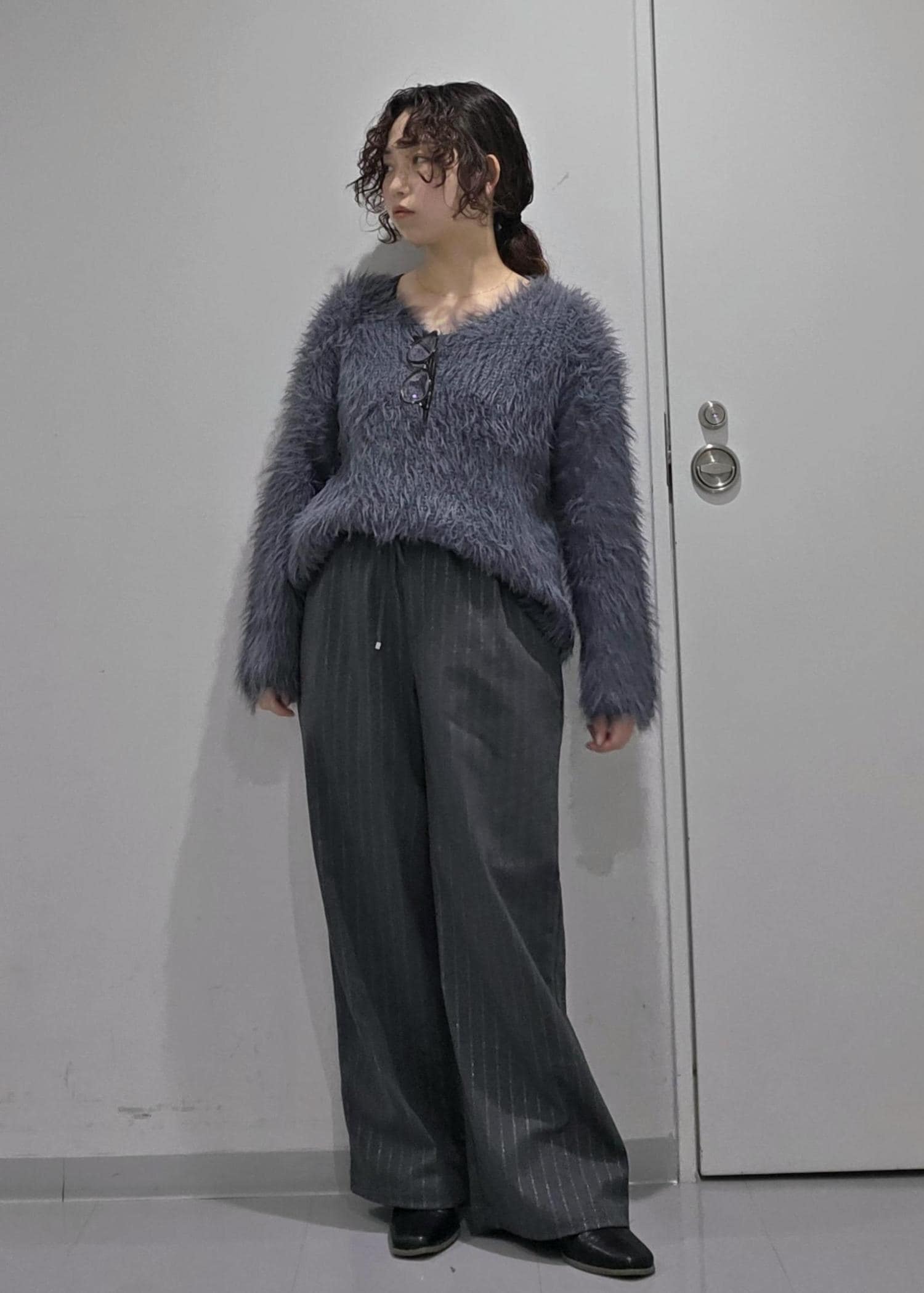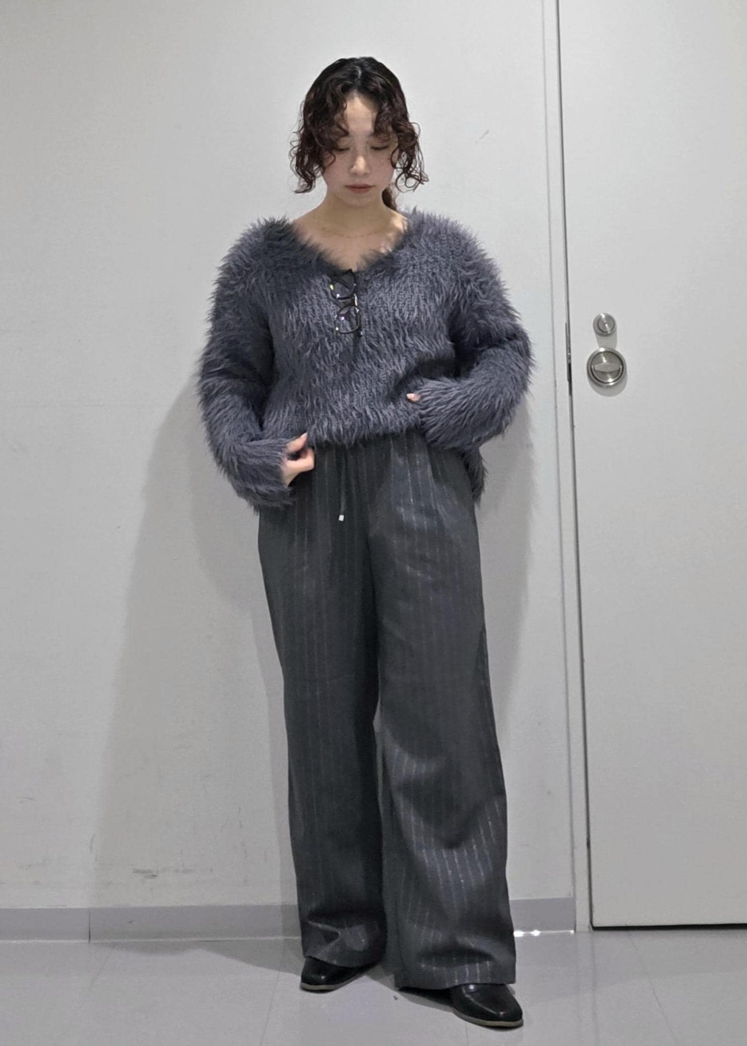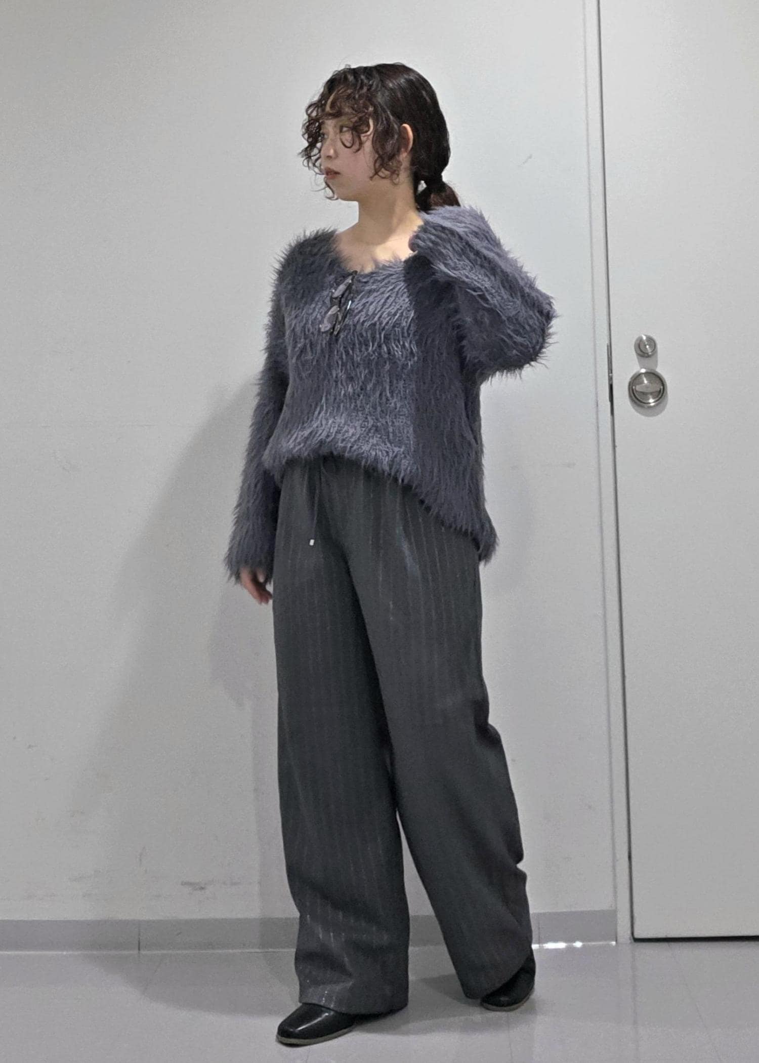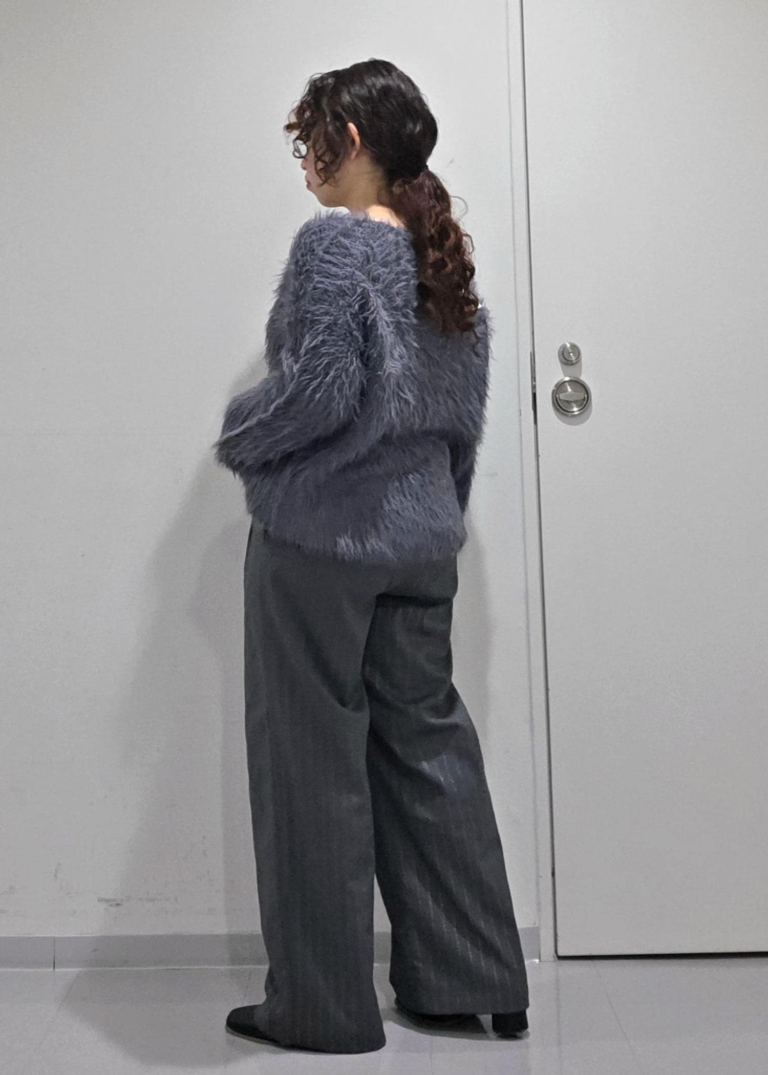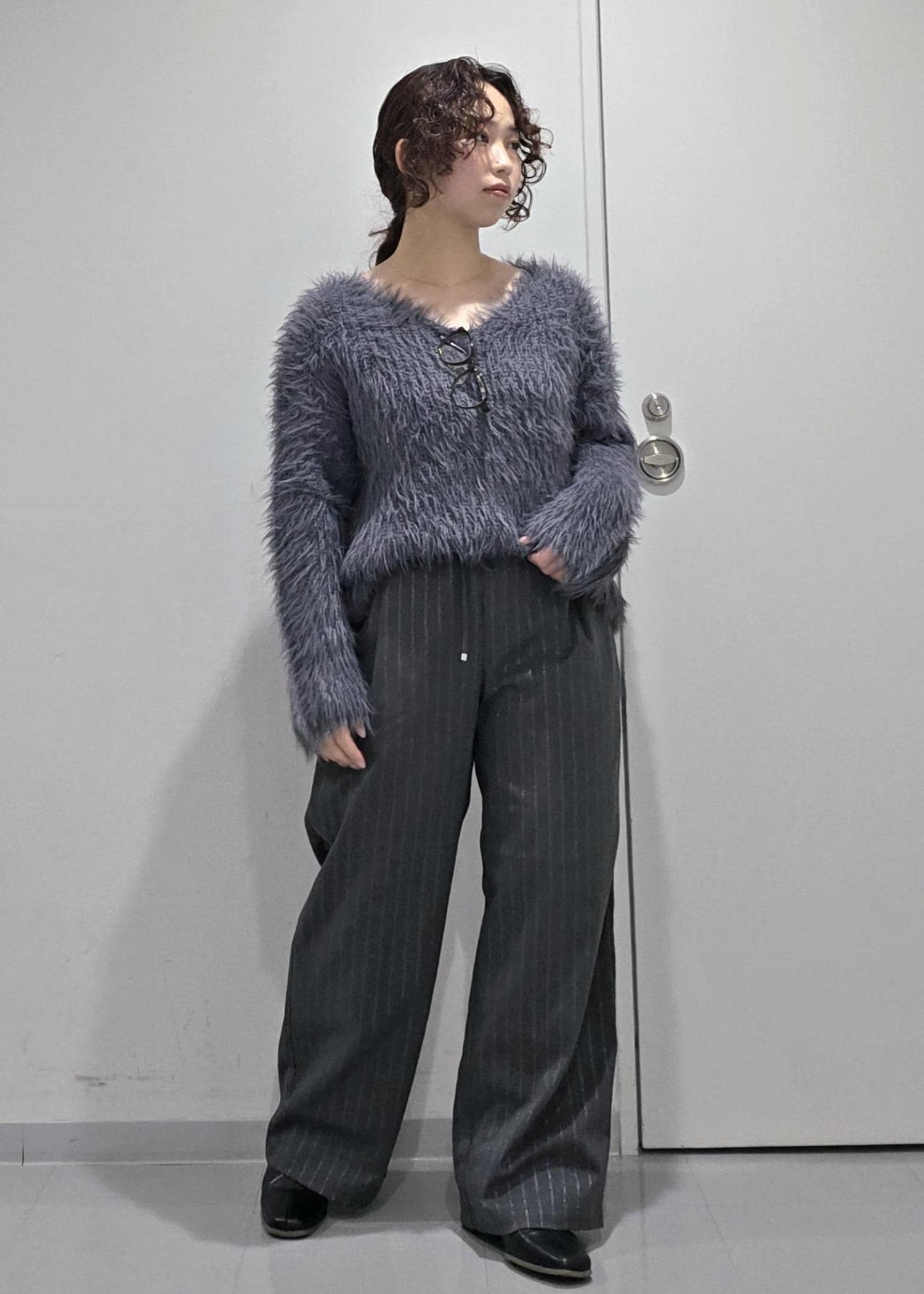 ややボリュームのあるトップスなので、スタイルアップするようストライプのパンツをセレクト。