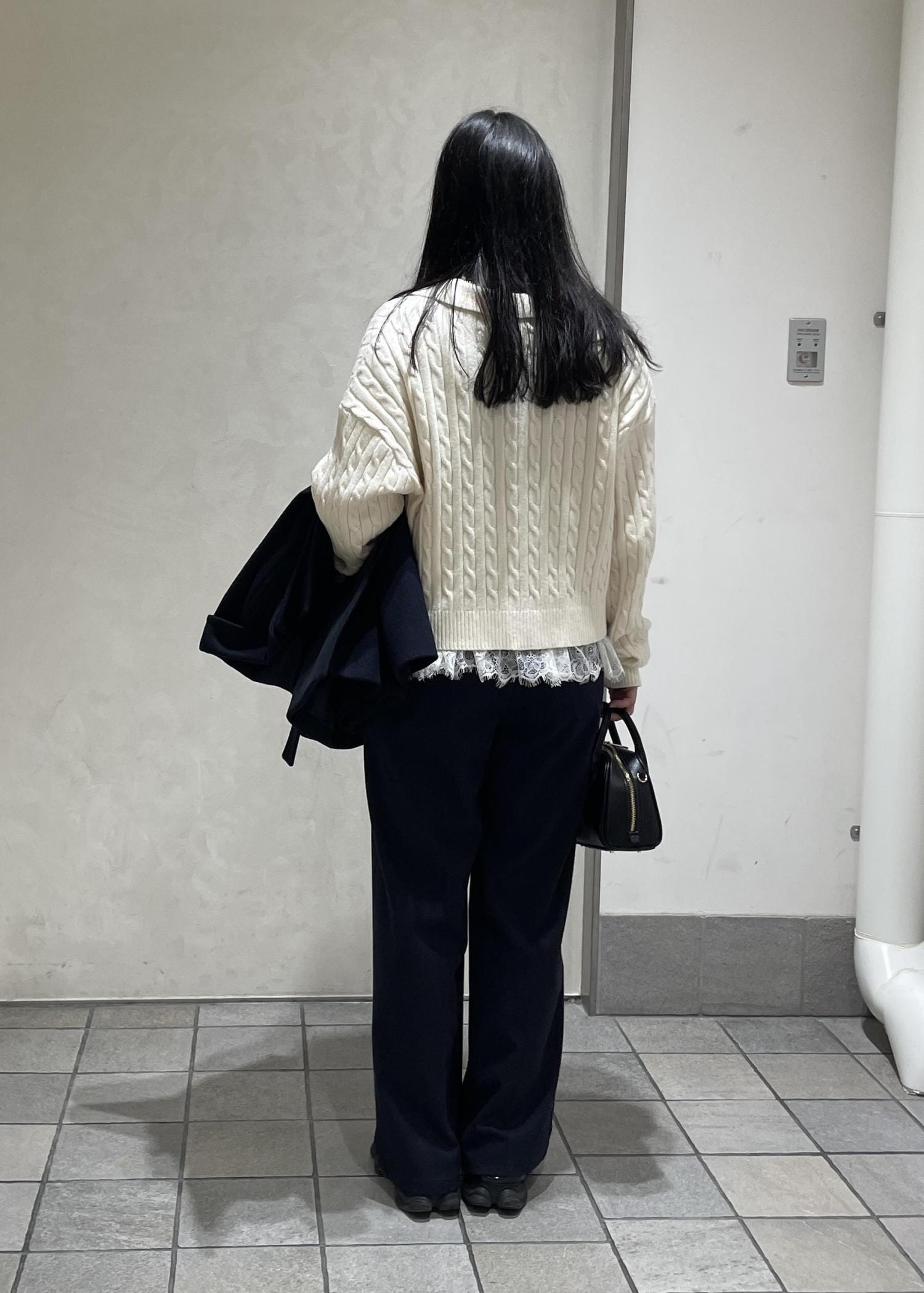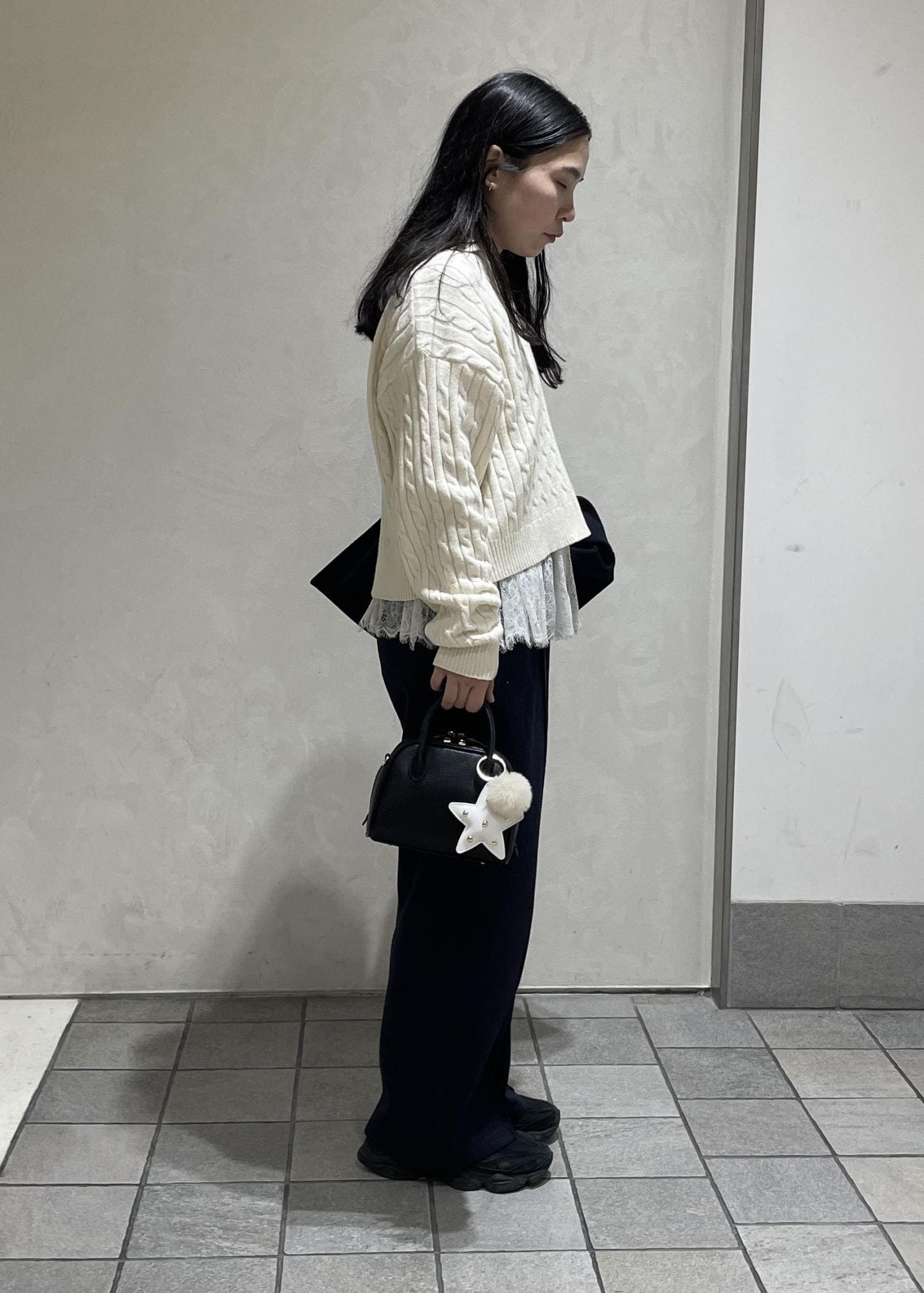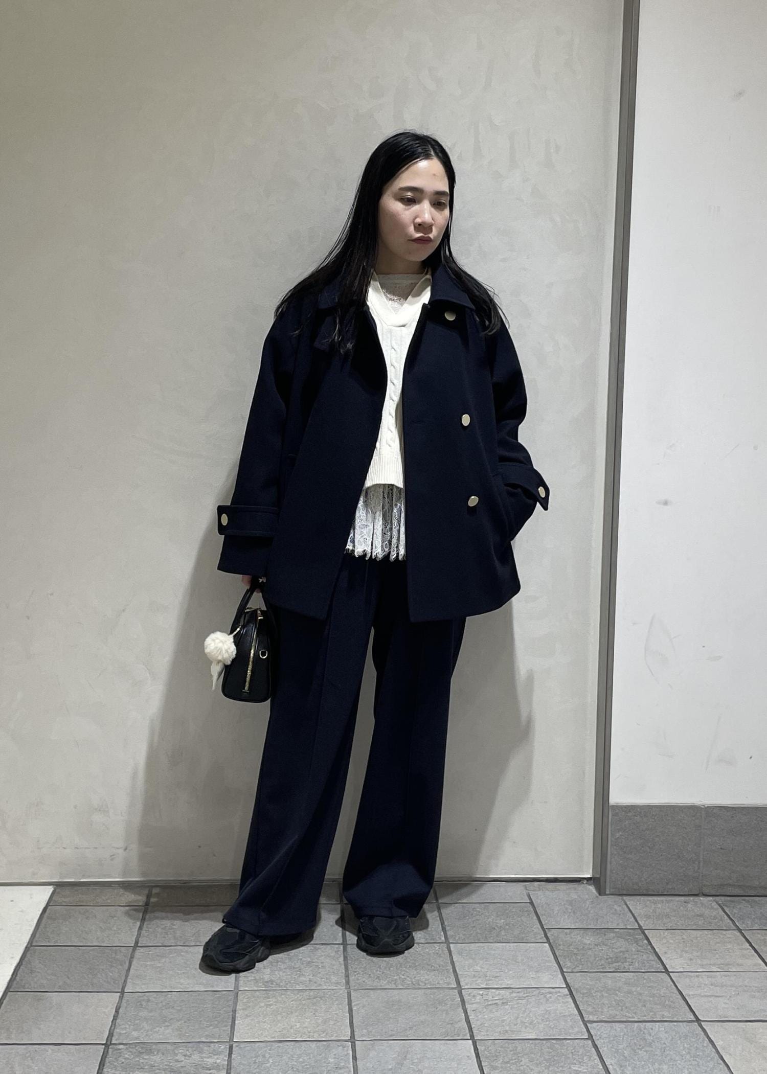丈が短めなので、レースビスチェとレイヤードして女性らしい雰囲気にアウターや小物は暗めのトーンにして甘すぎないスタイリングにしました。