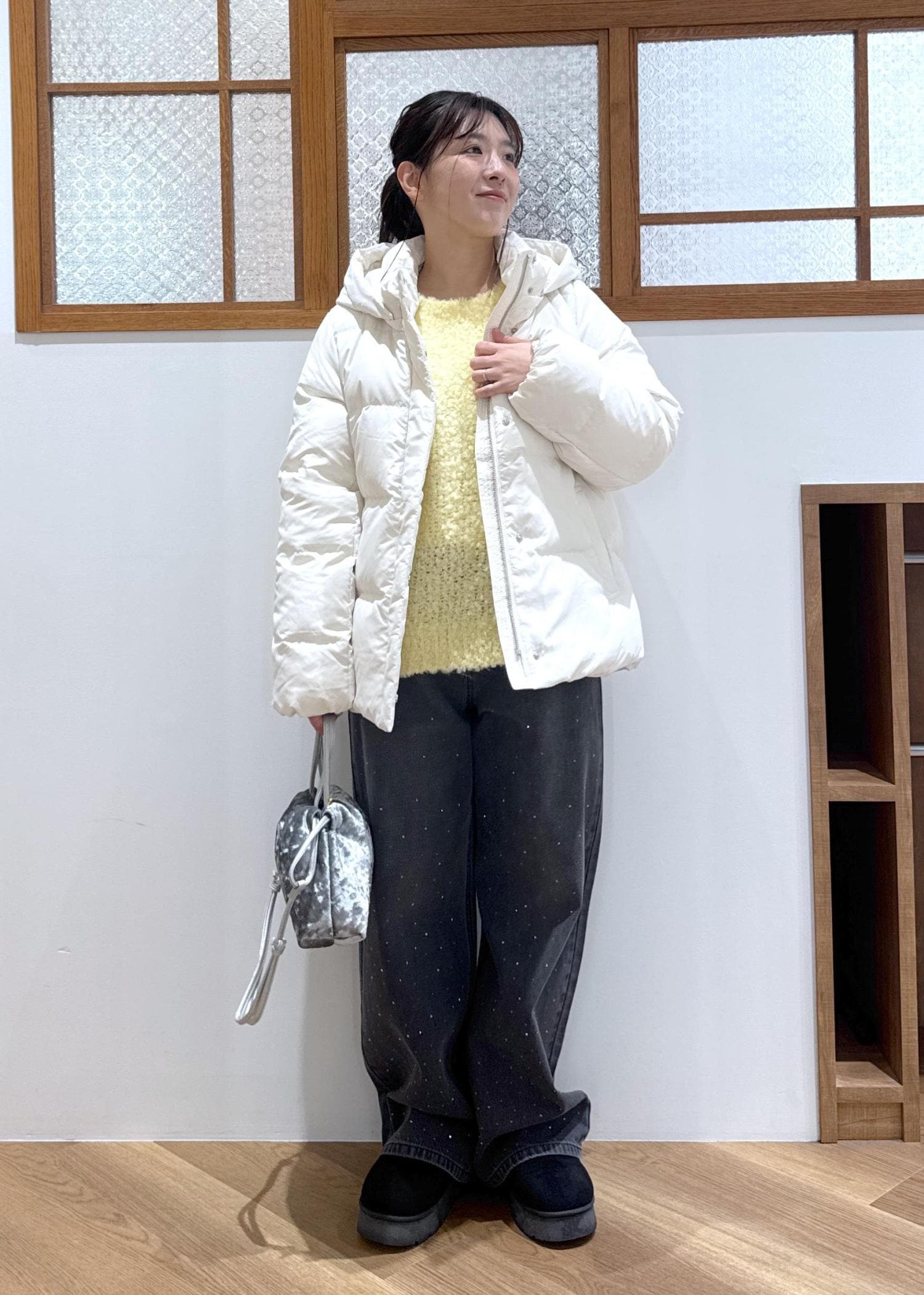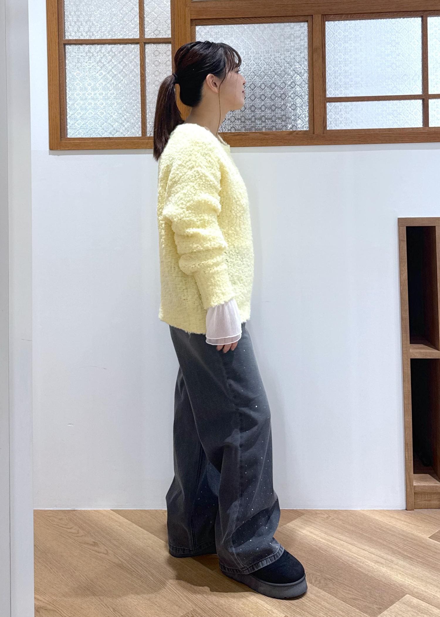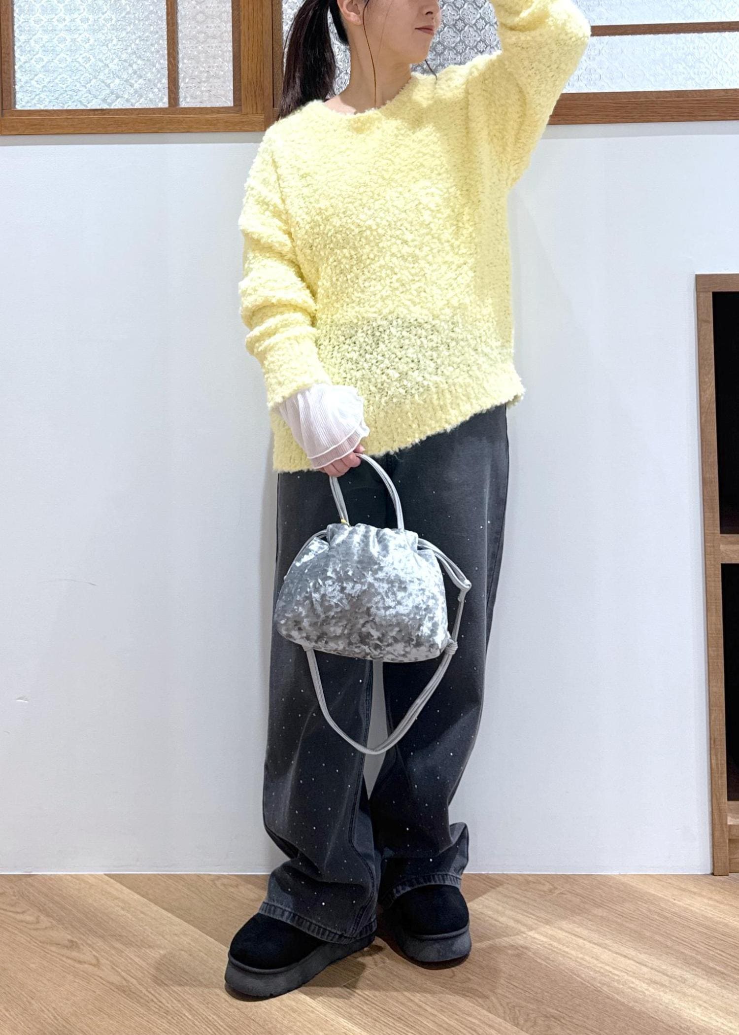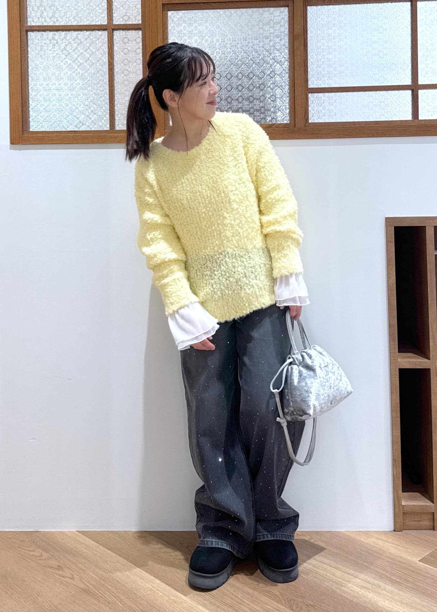 冬のダークカラーにも、スノーホワイトなカラーにも相性のいいイエローニットに一目惚れです♡