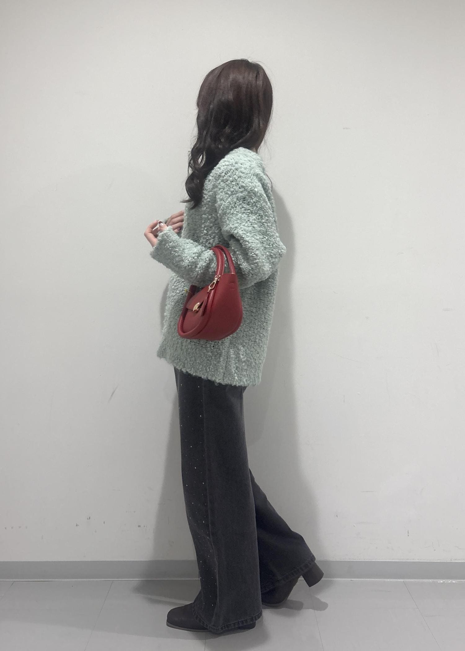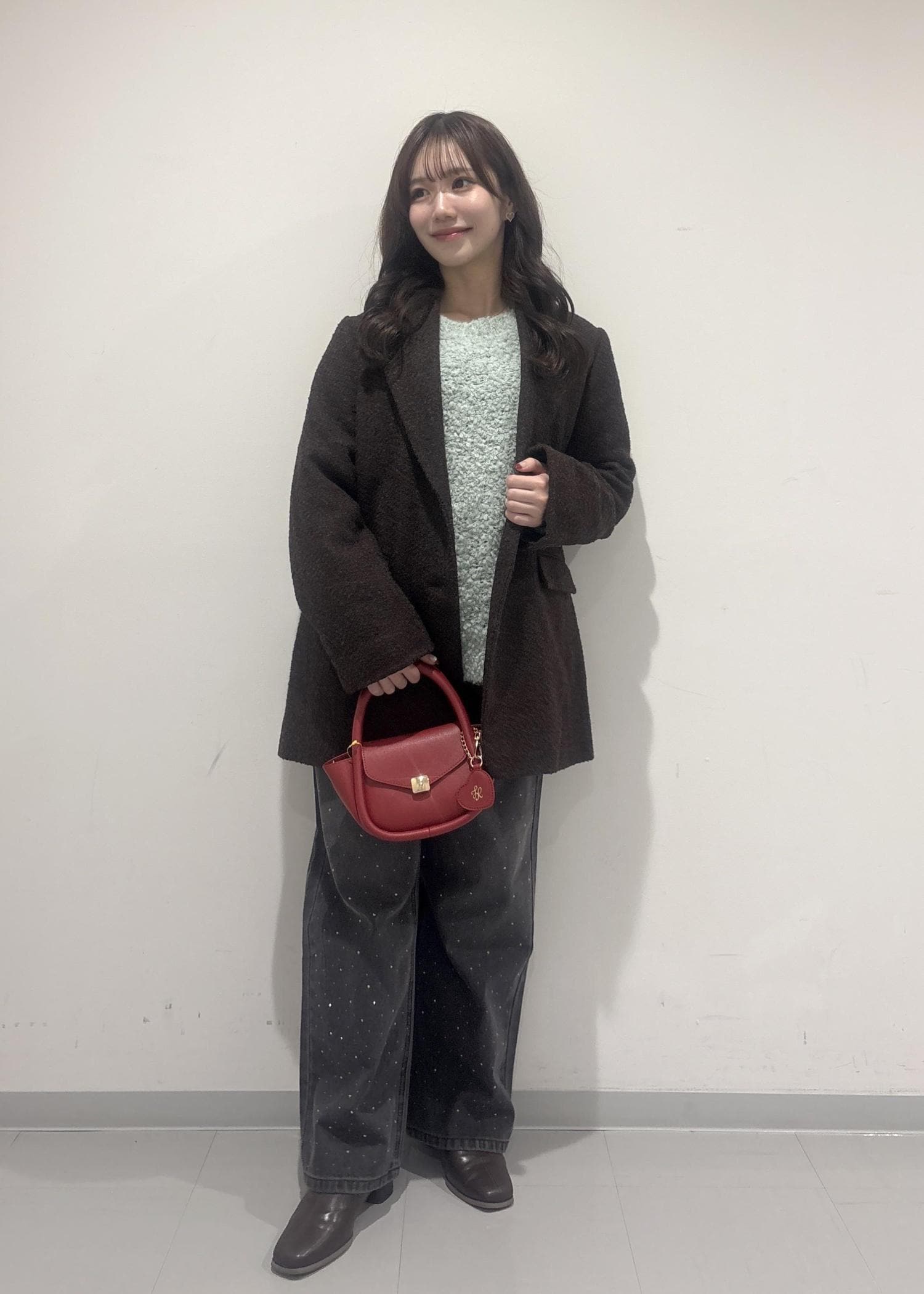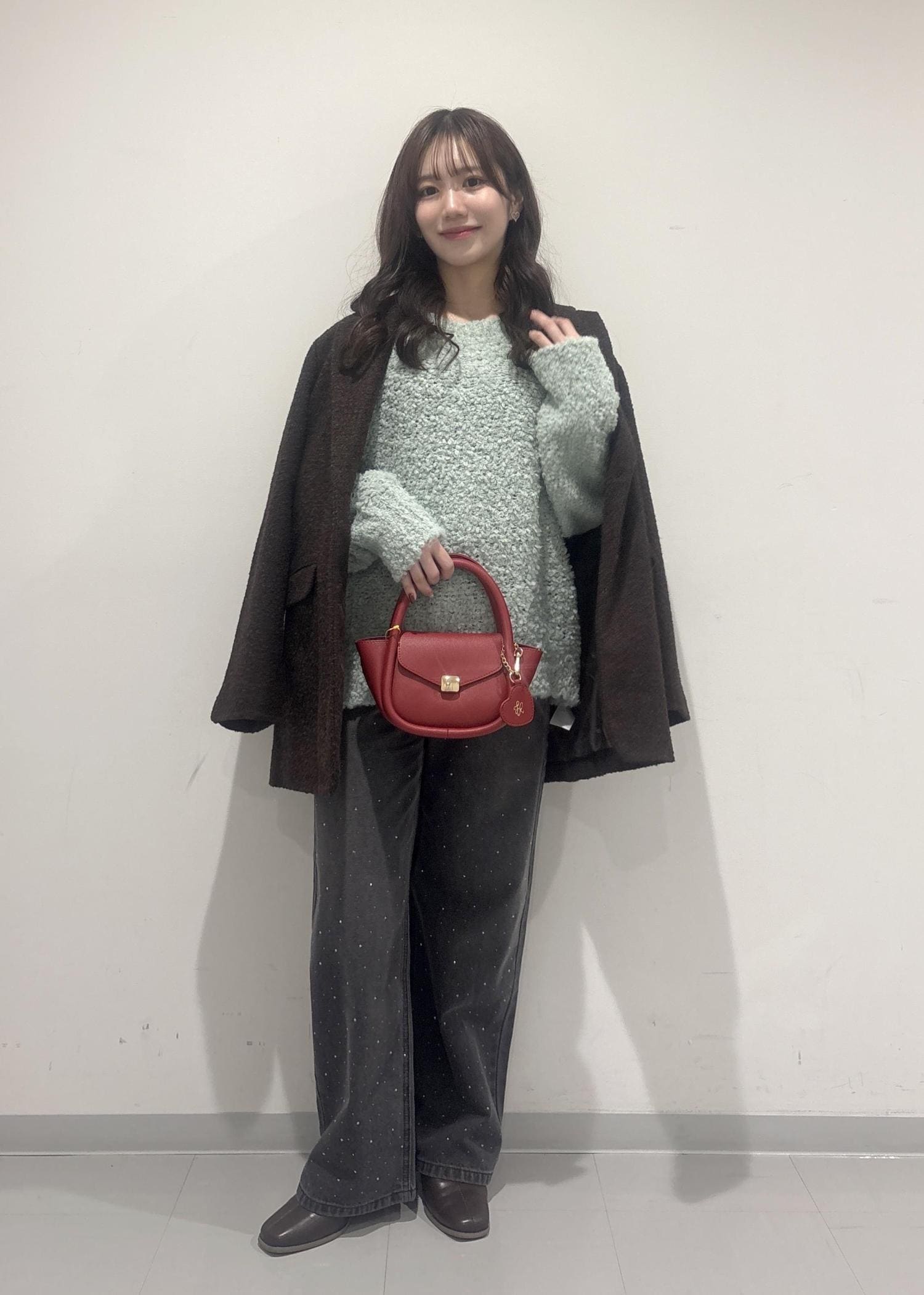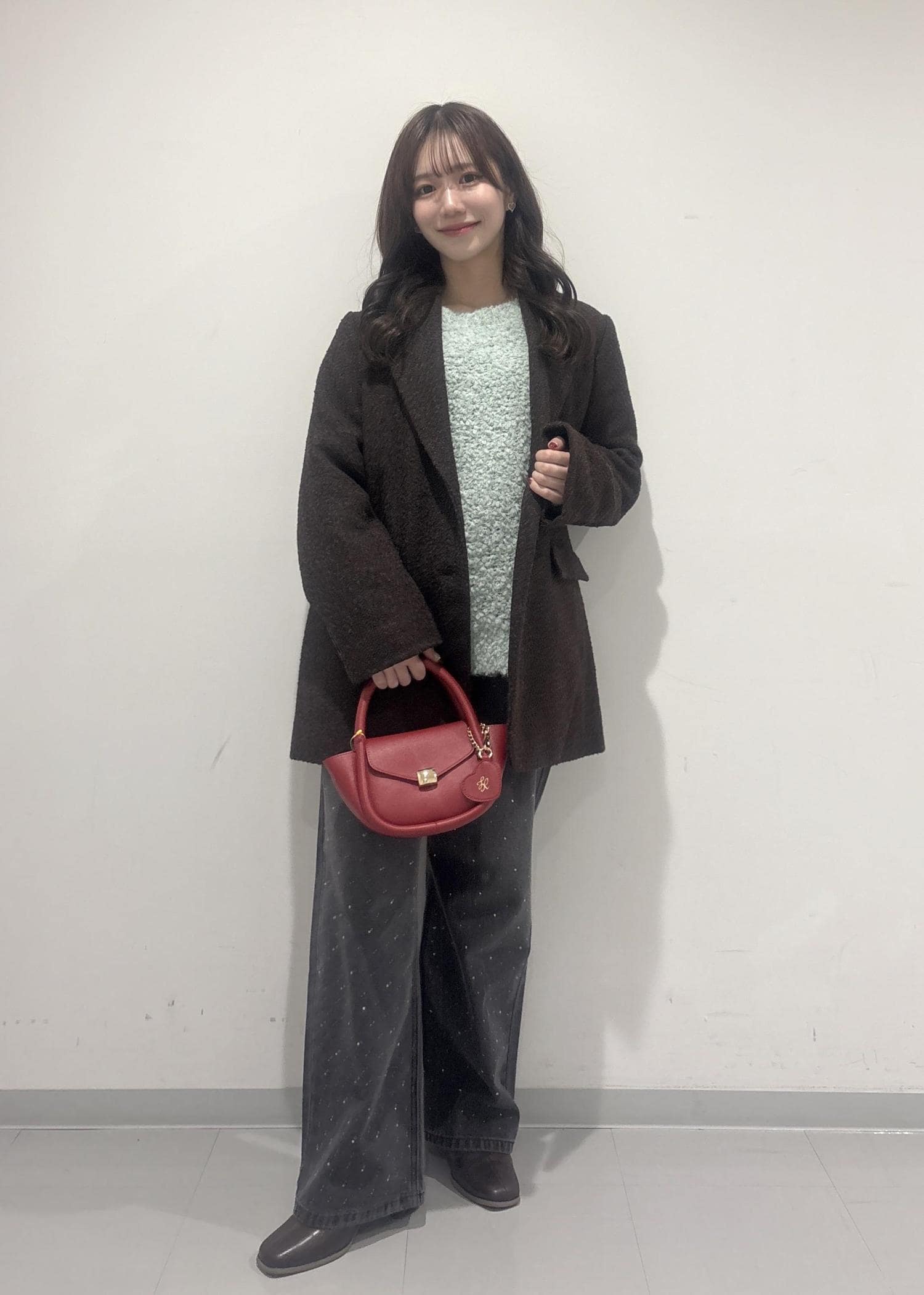 こちらのコーデのポイントは、ダークブラウンのコートにライトグリーンのニットです!コートは深みのある色なので大人ぽく綺麗な印象にしてみて、ライトグリーンのニットでカジュアルっぽく甘さもあるバランスの良いコーデにしてみました!