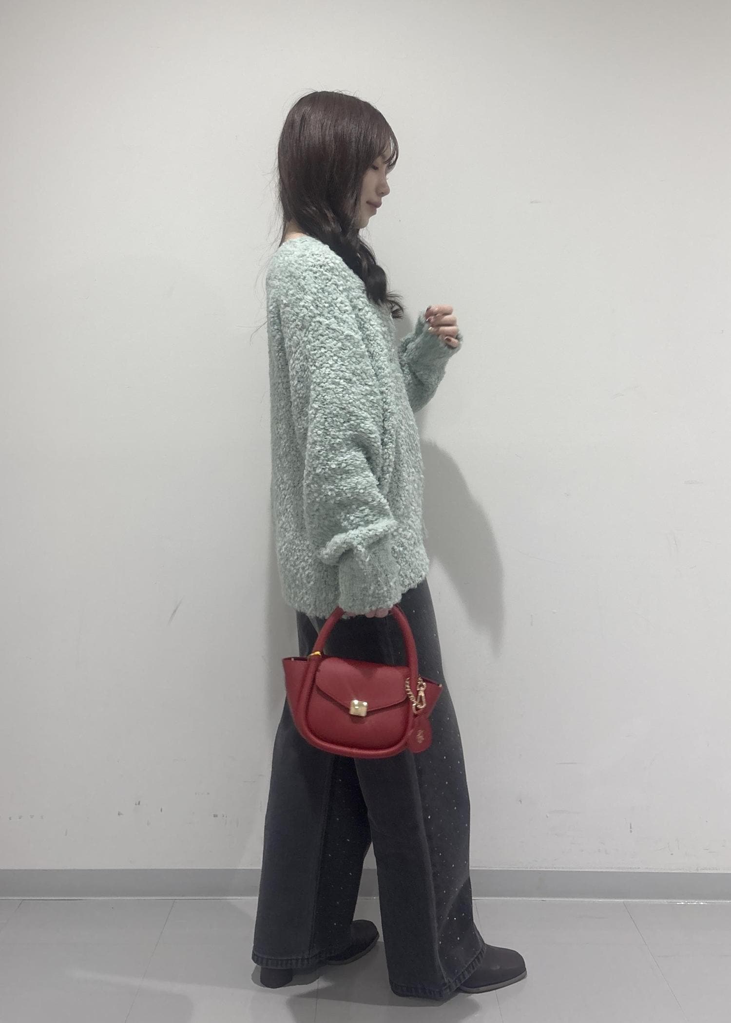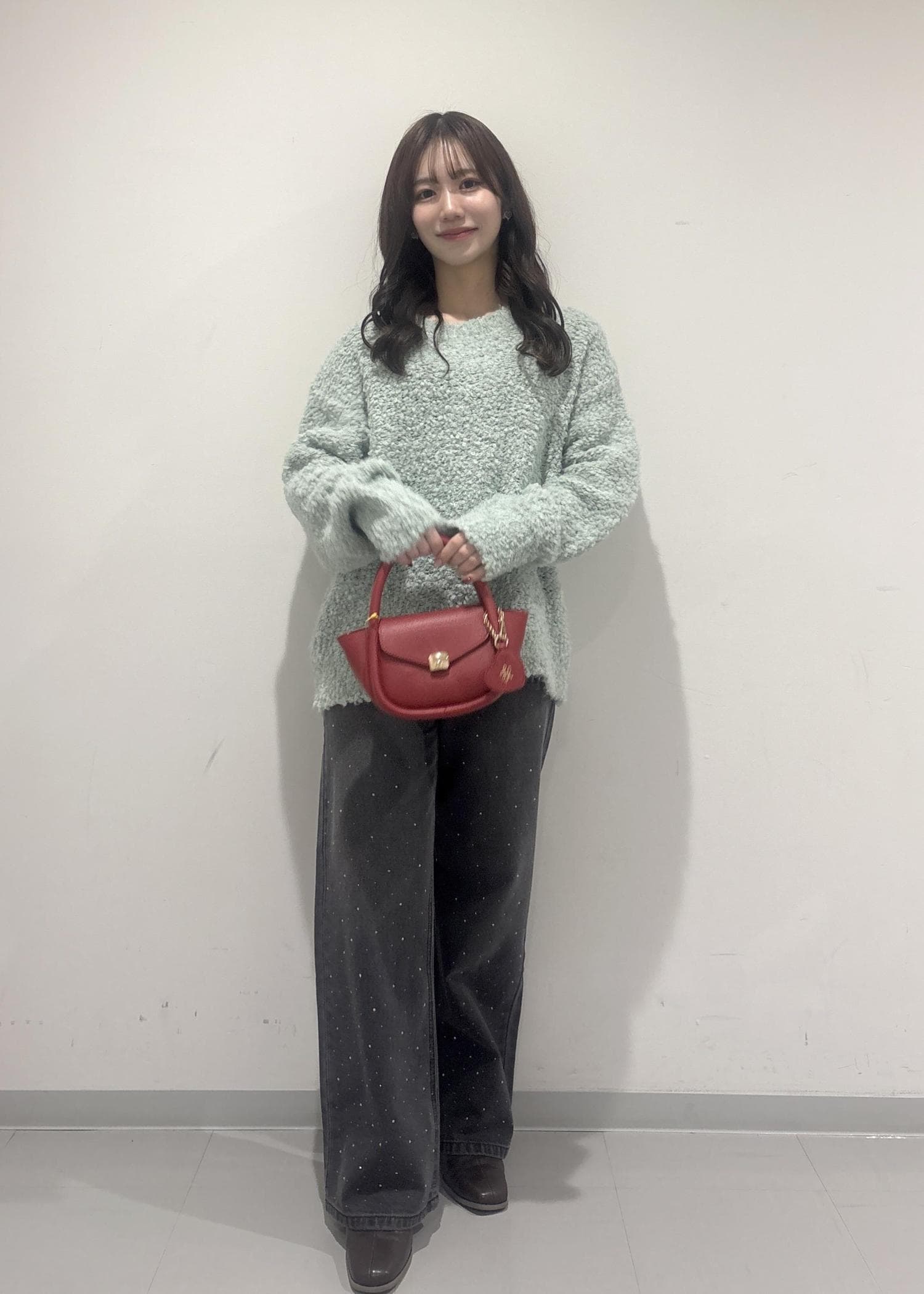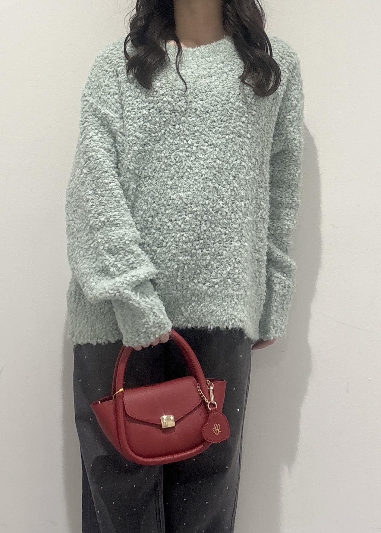赤色のバッグには、ハートのチャームが付いてるのもポイントです!