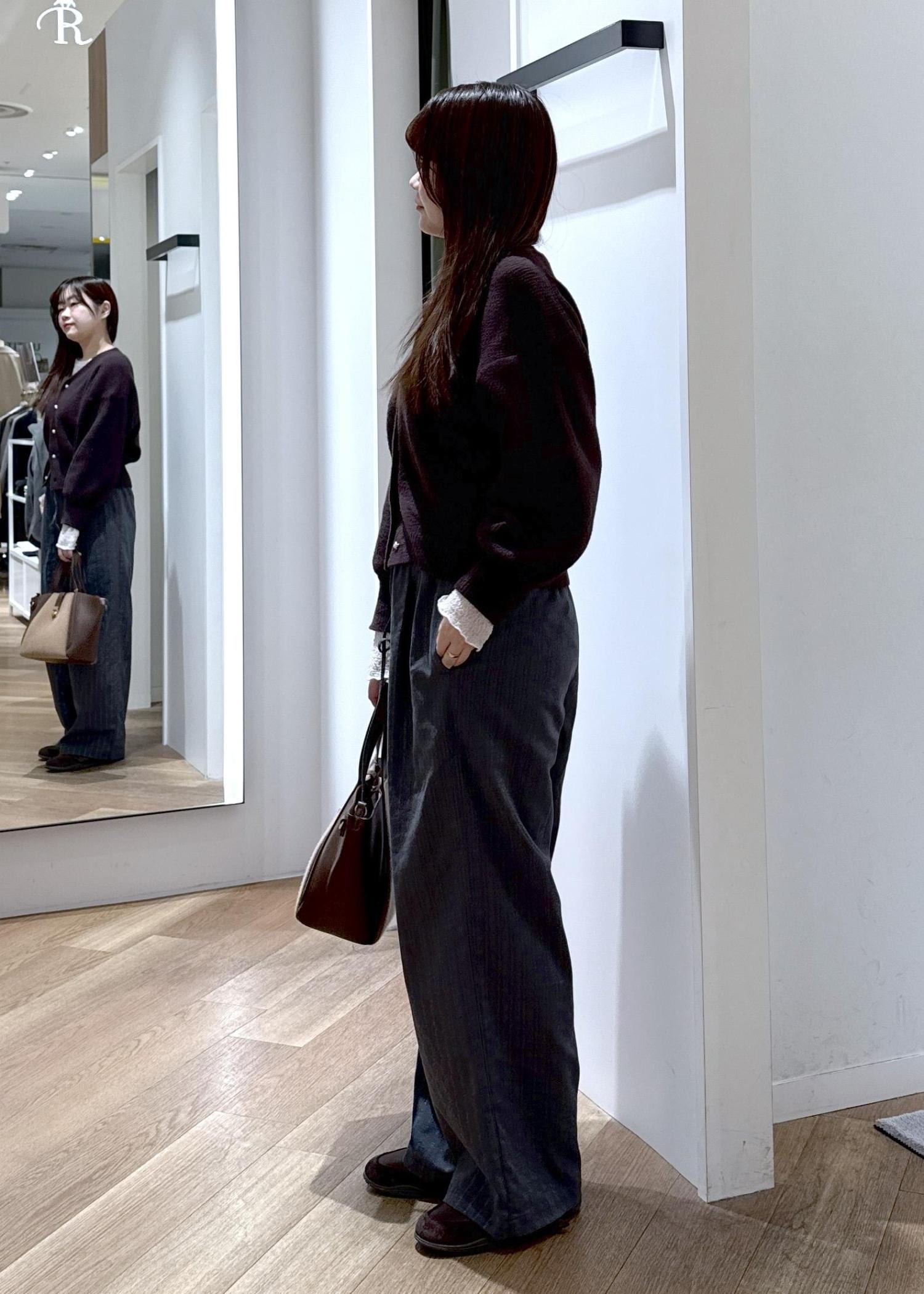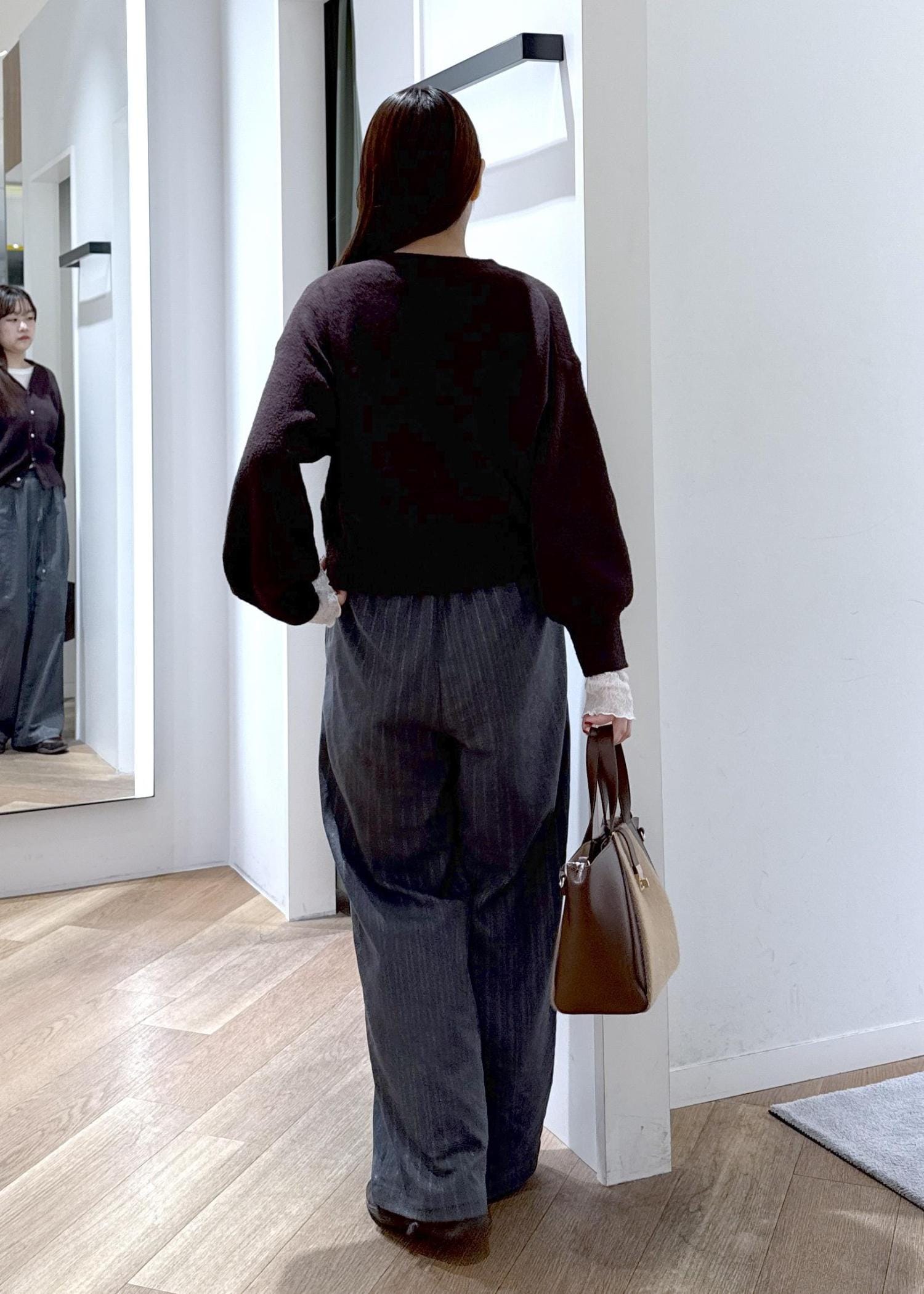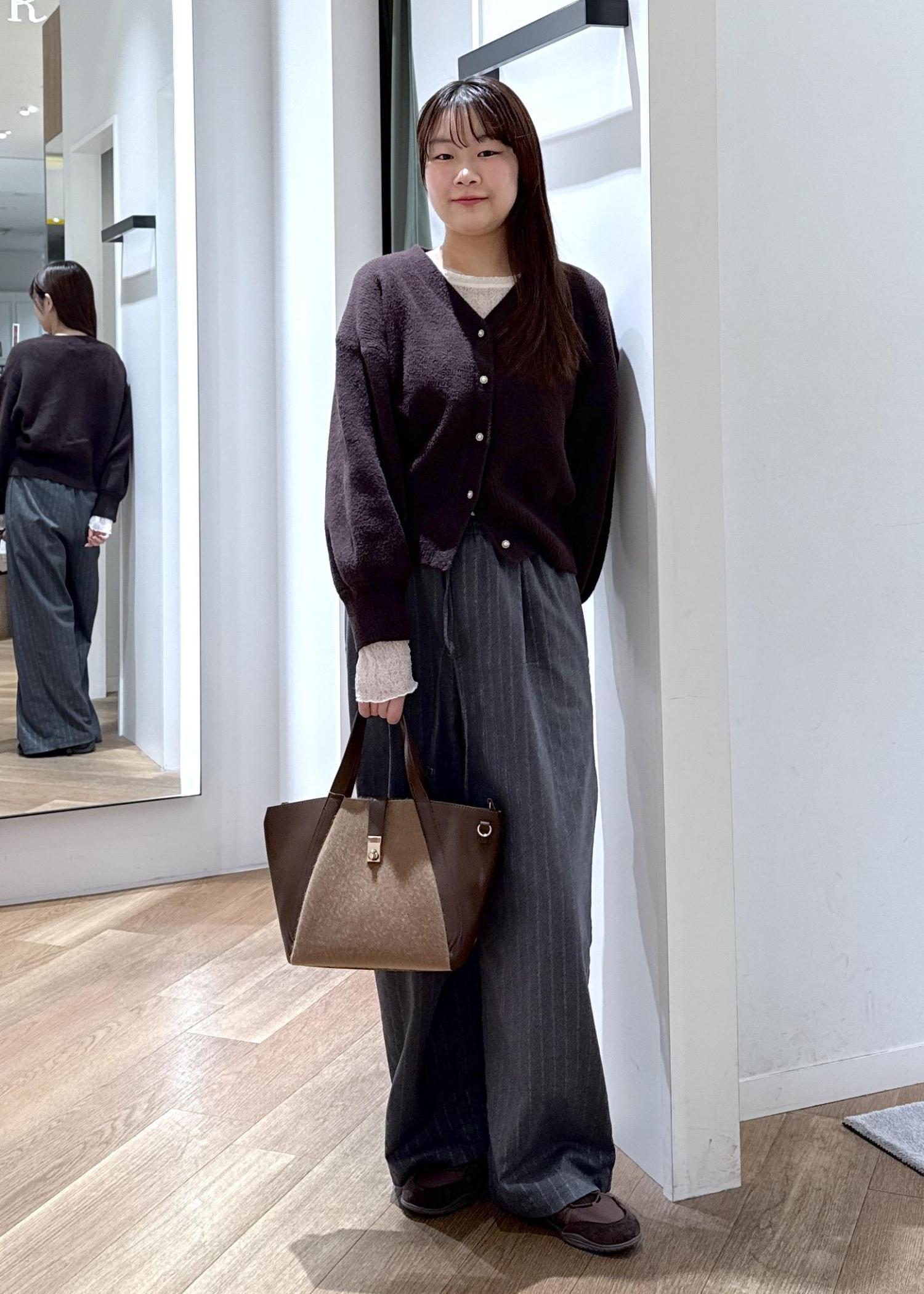 ダークブラウンのカーディガンとストライプの入ったパンツを合わせた、大人見えするコーディネートです。