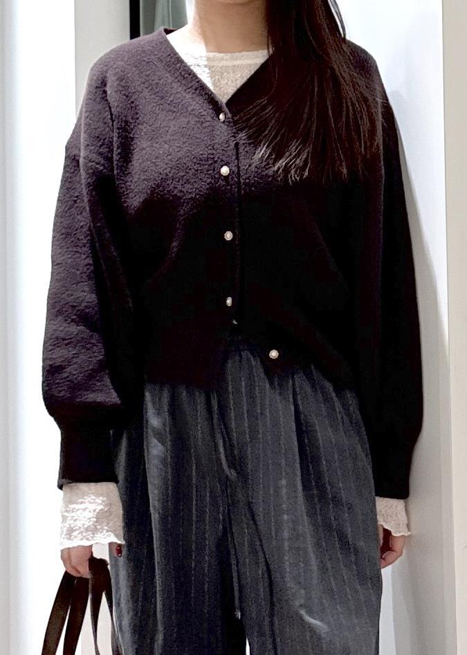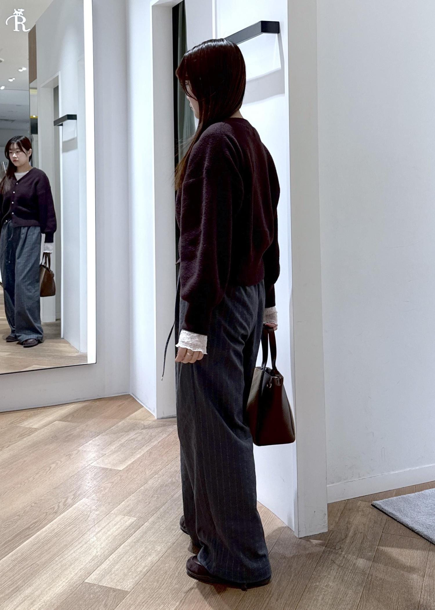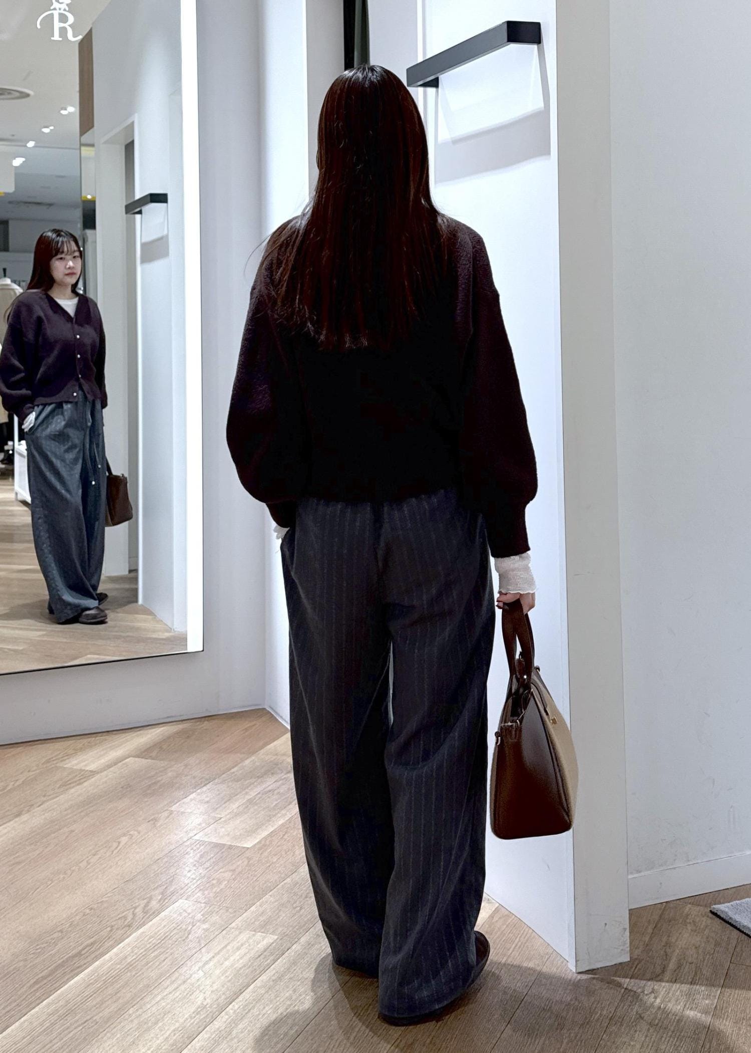 ダークブラウンのカーディガンとストライプの入ったパンツを合わせた、大人見えするコーディネートです。