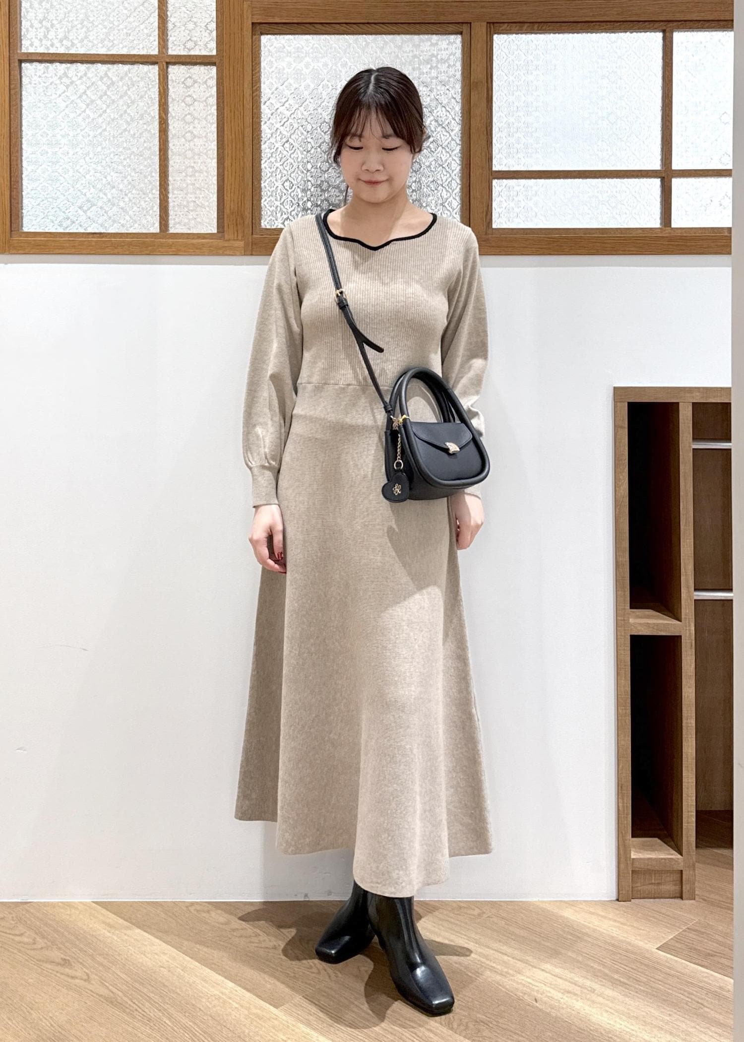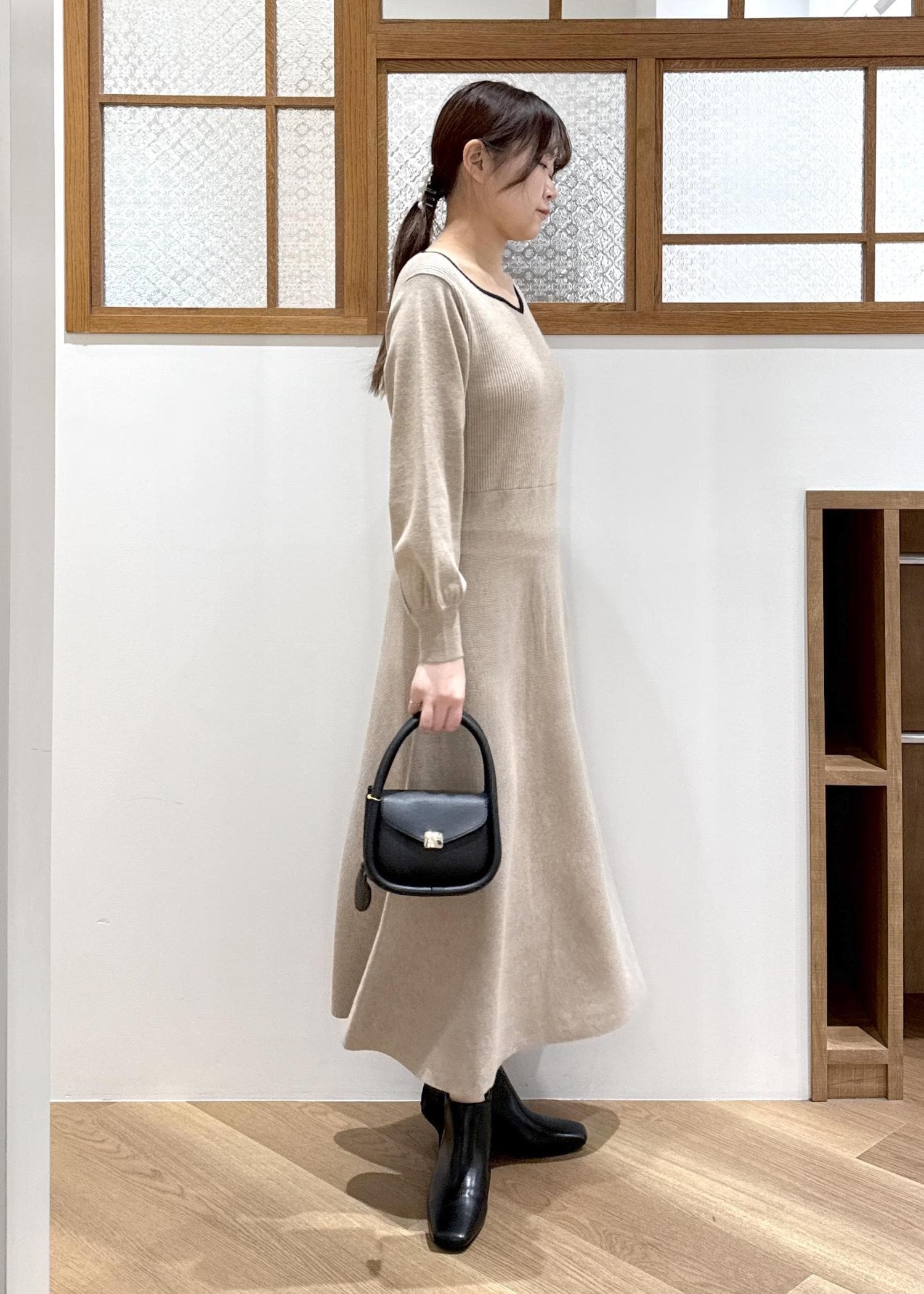ニットワンピースを1枚で着た、シンプルなコーディネートです。シルエットが綺麗なので、1枚で上品な雰囲気に。