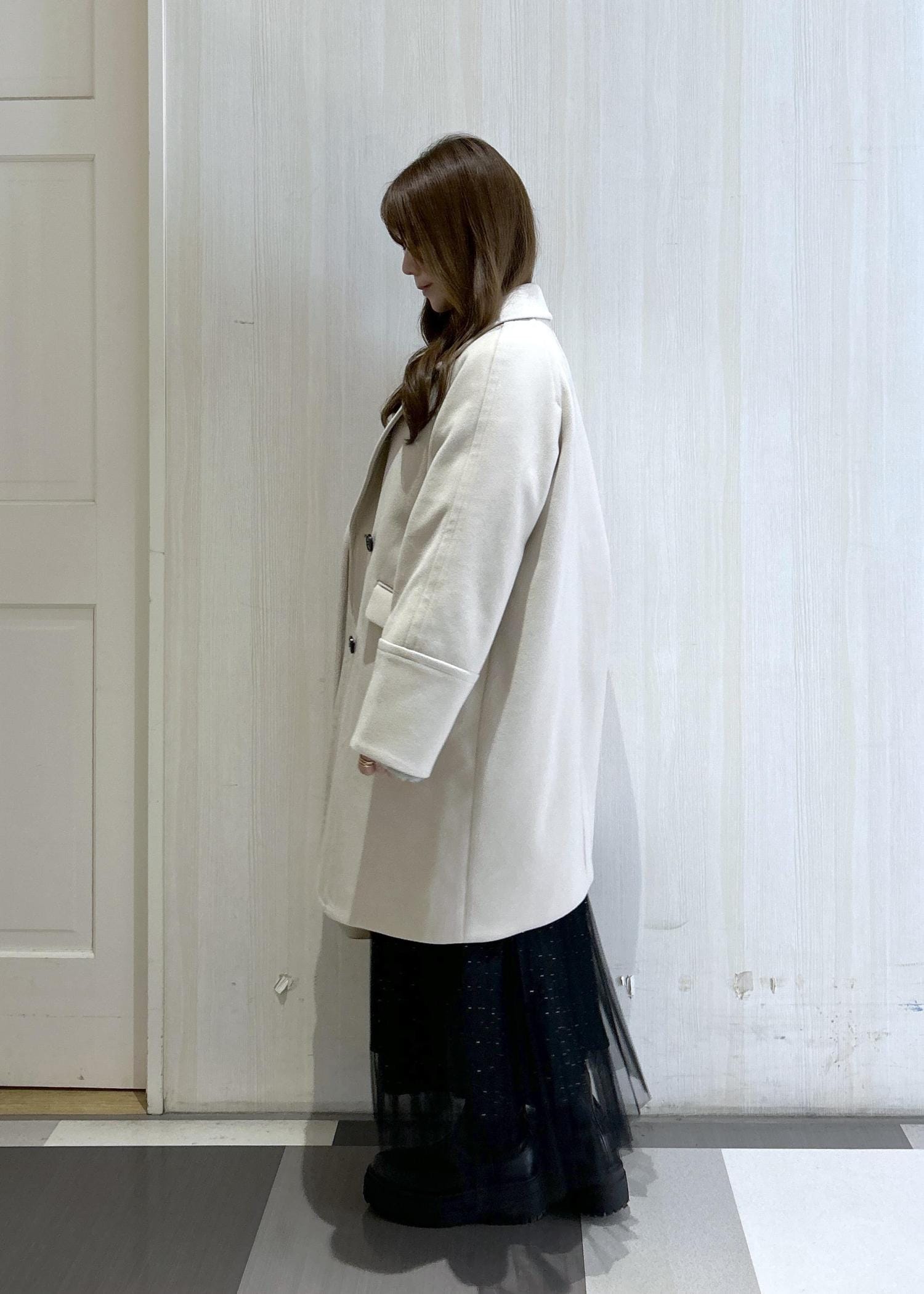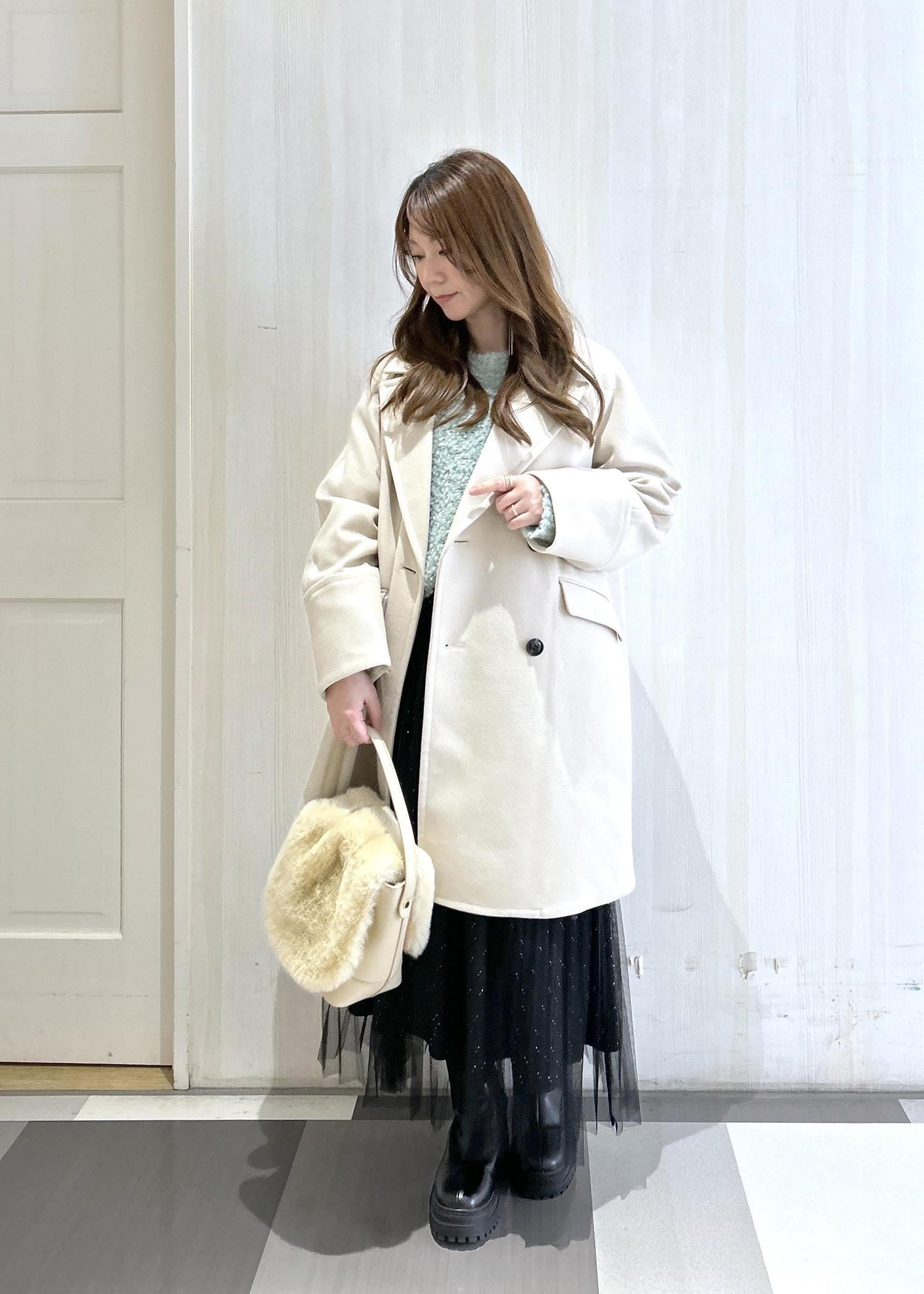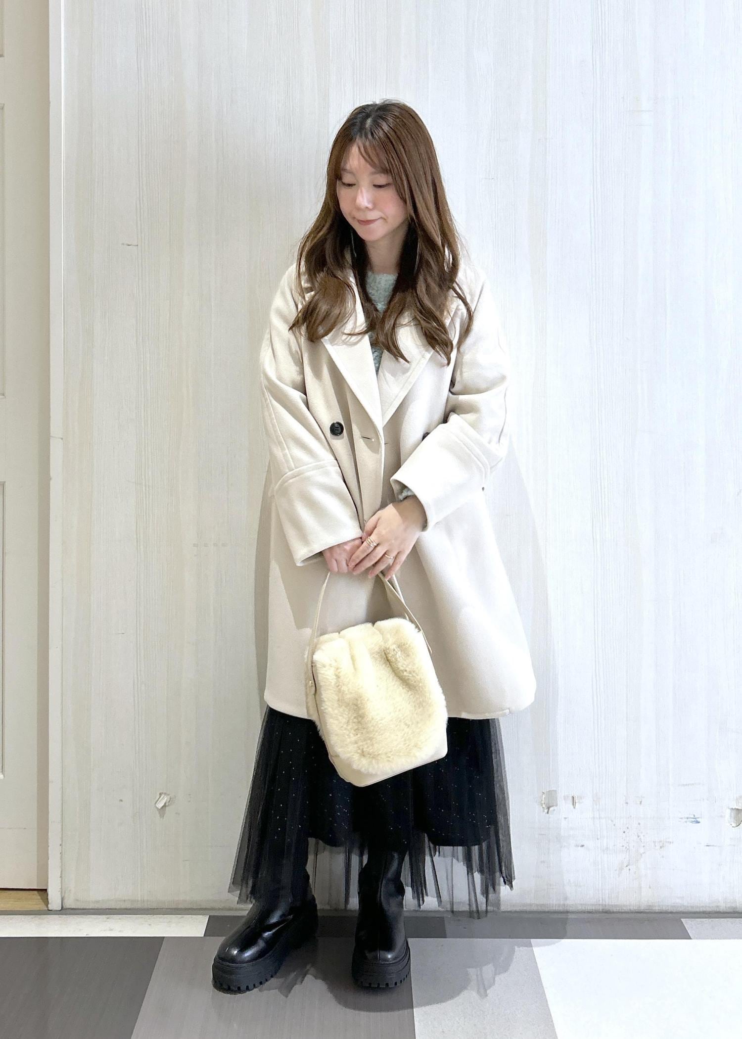 ベージュのオーバーサイズピーコートと