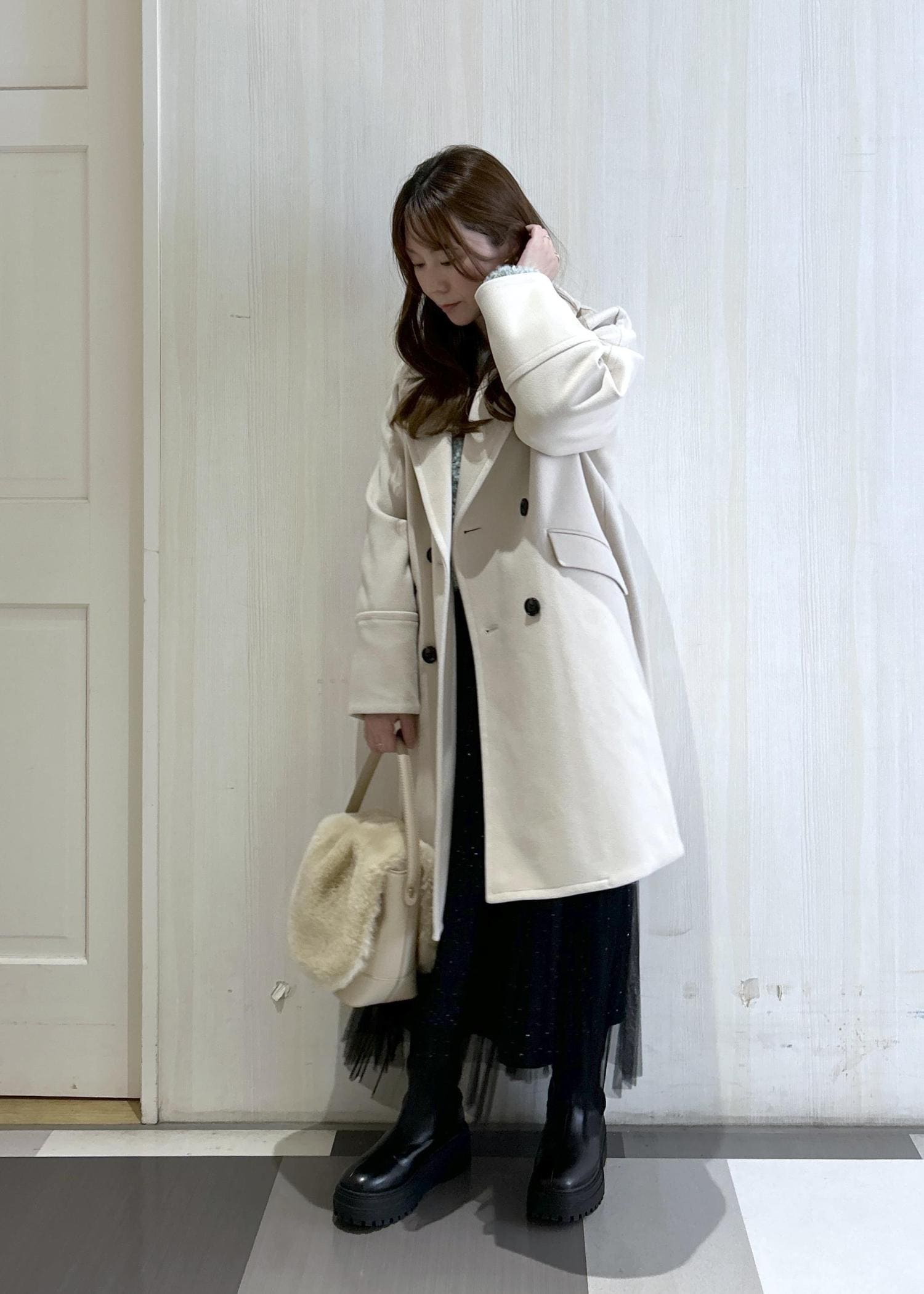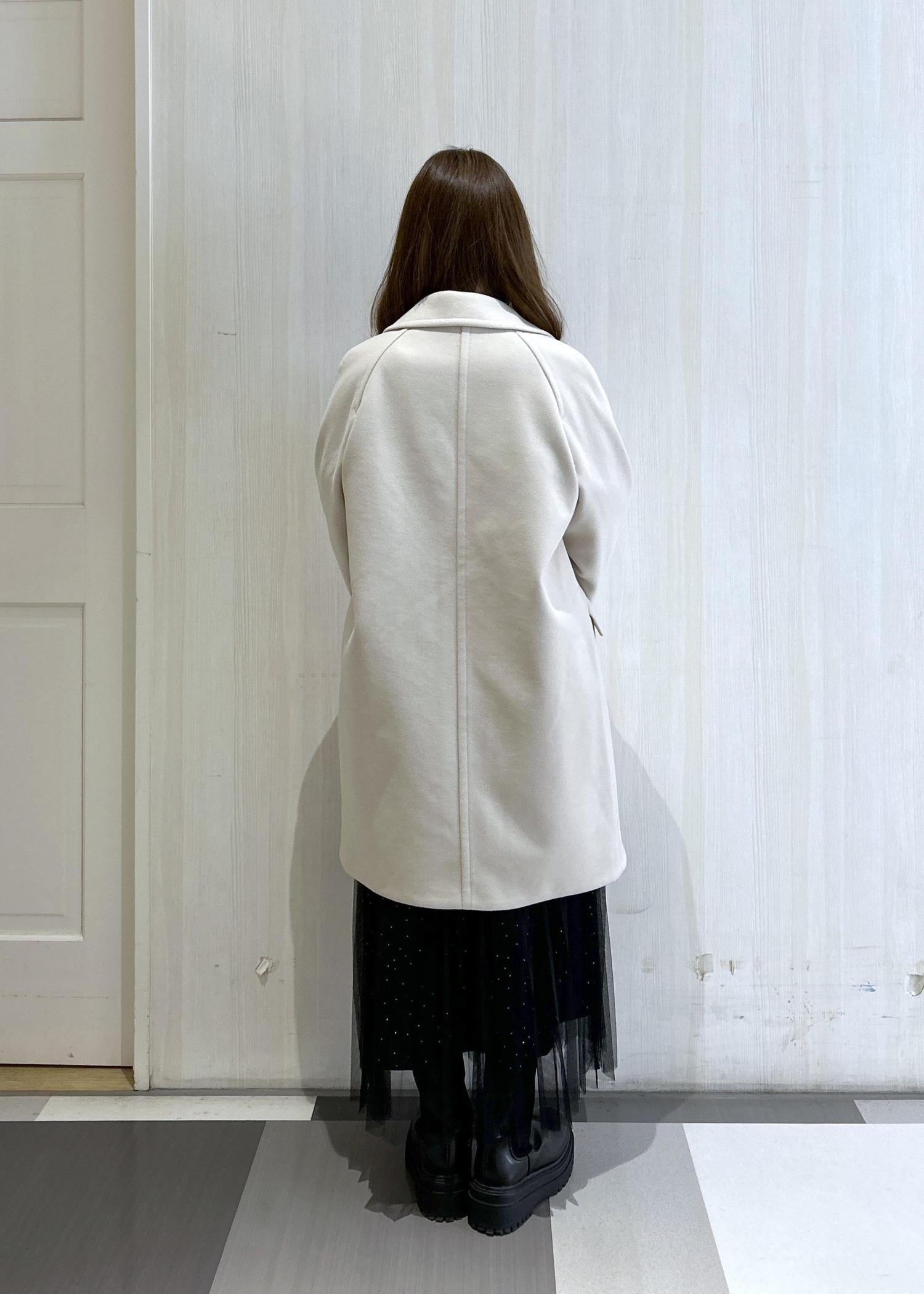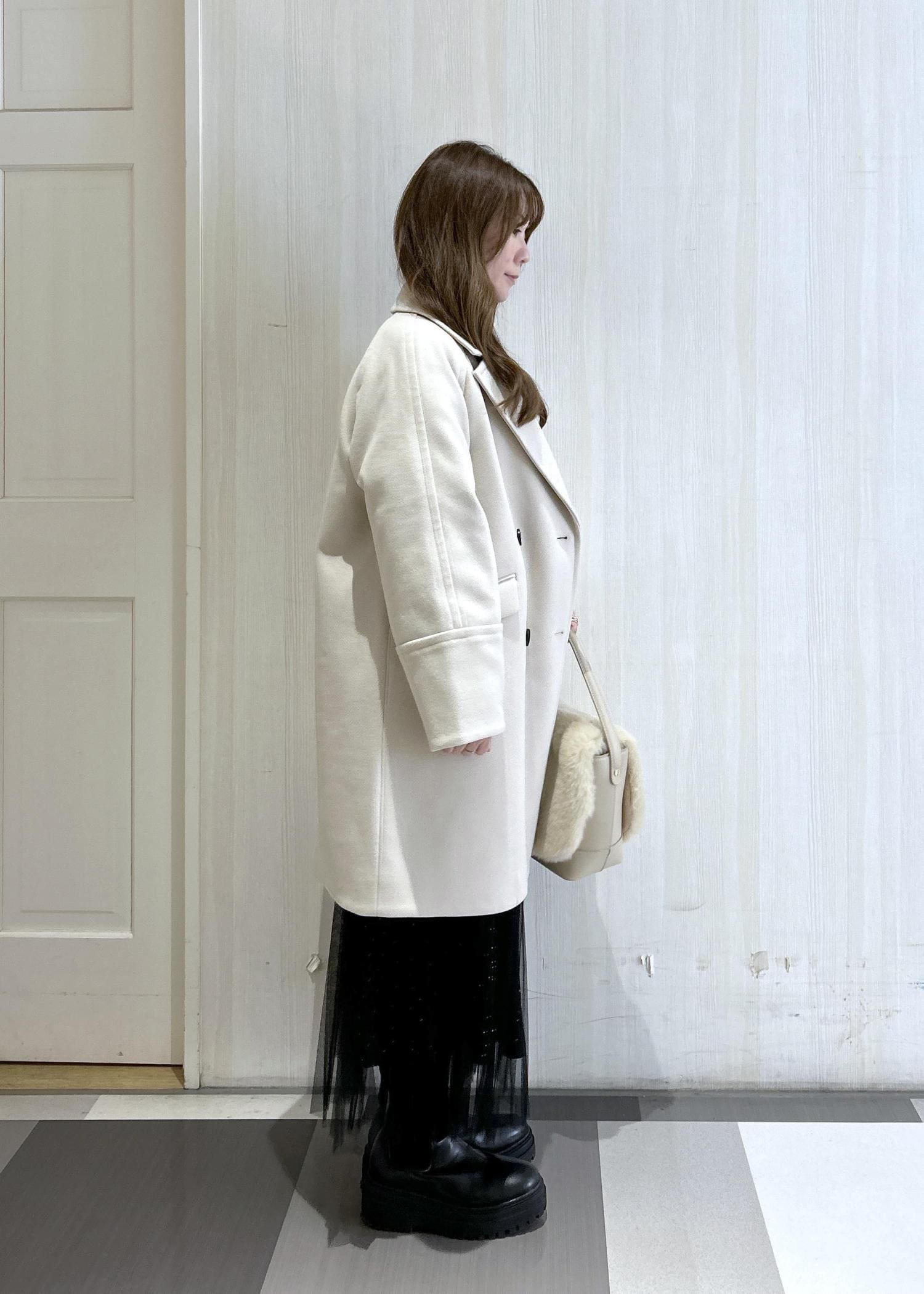 ベージュのオーバーサイズピーコートと