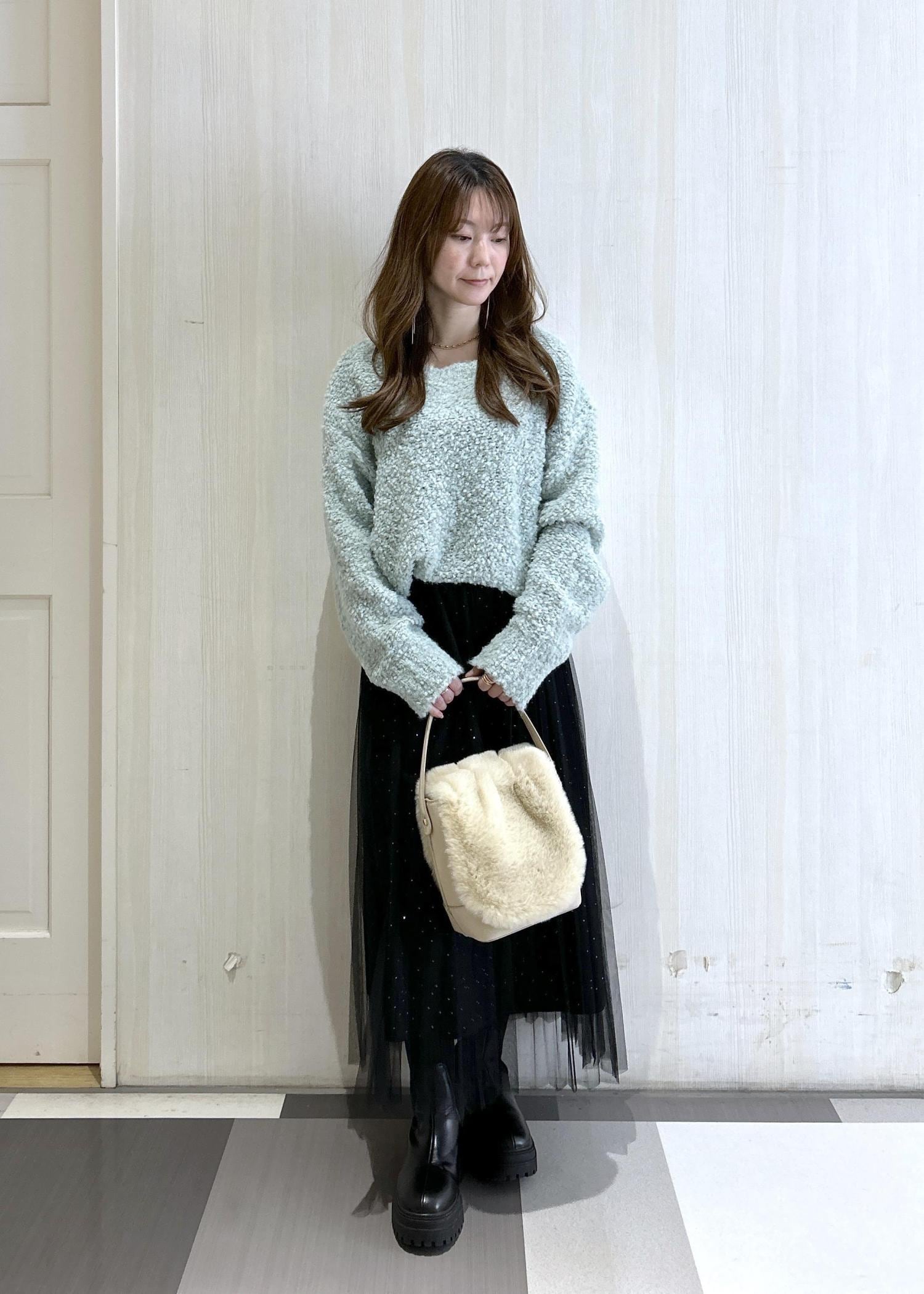 グリーンニット✖️キラキラスカートで