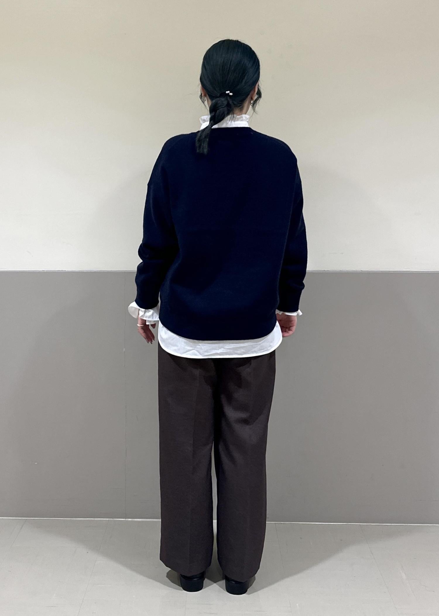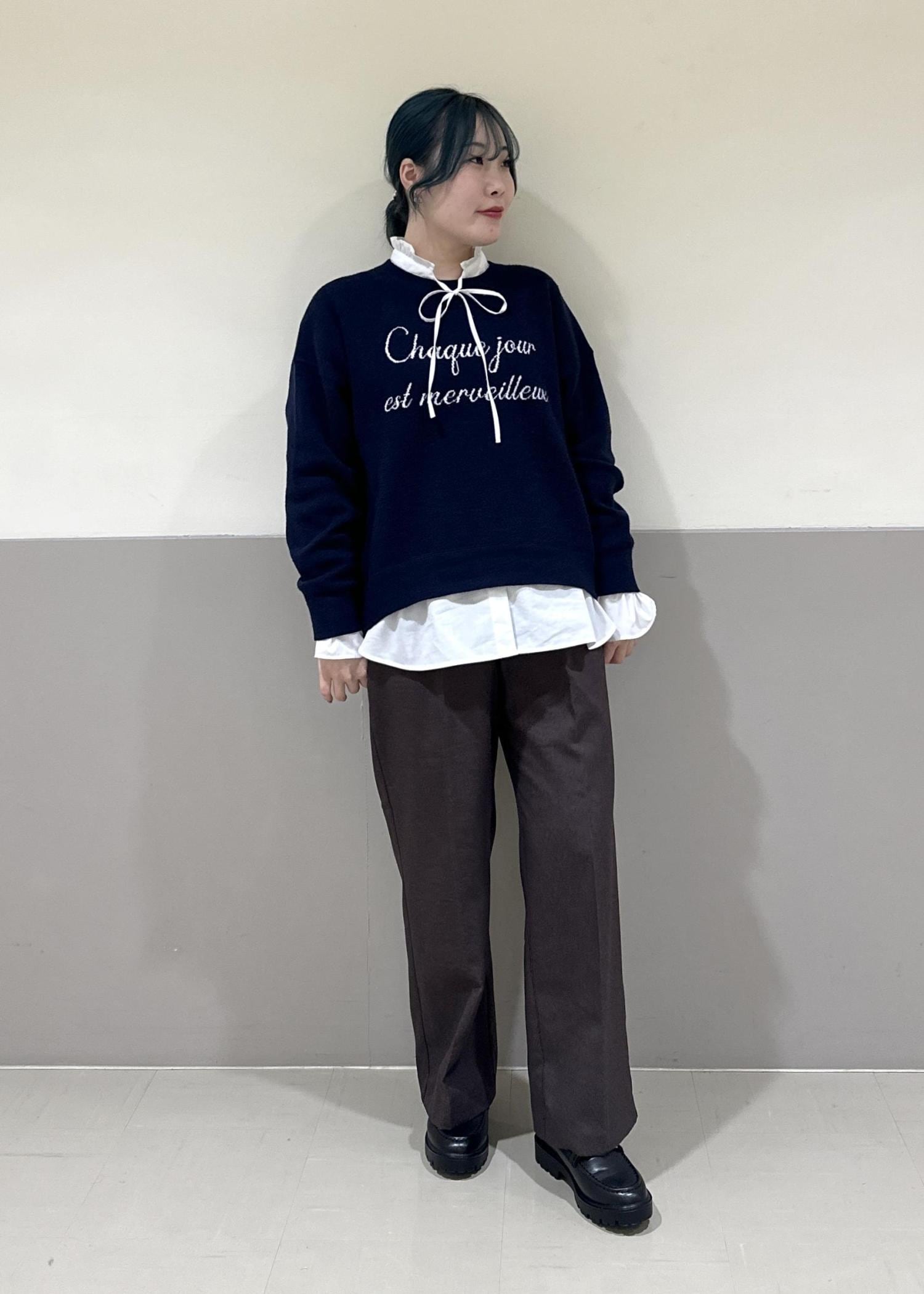 スウェットライクのニットもこのブラウスと合わせることで一気にキレイめにまとまりお仕事にも使えます! -