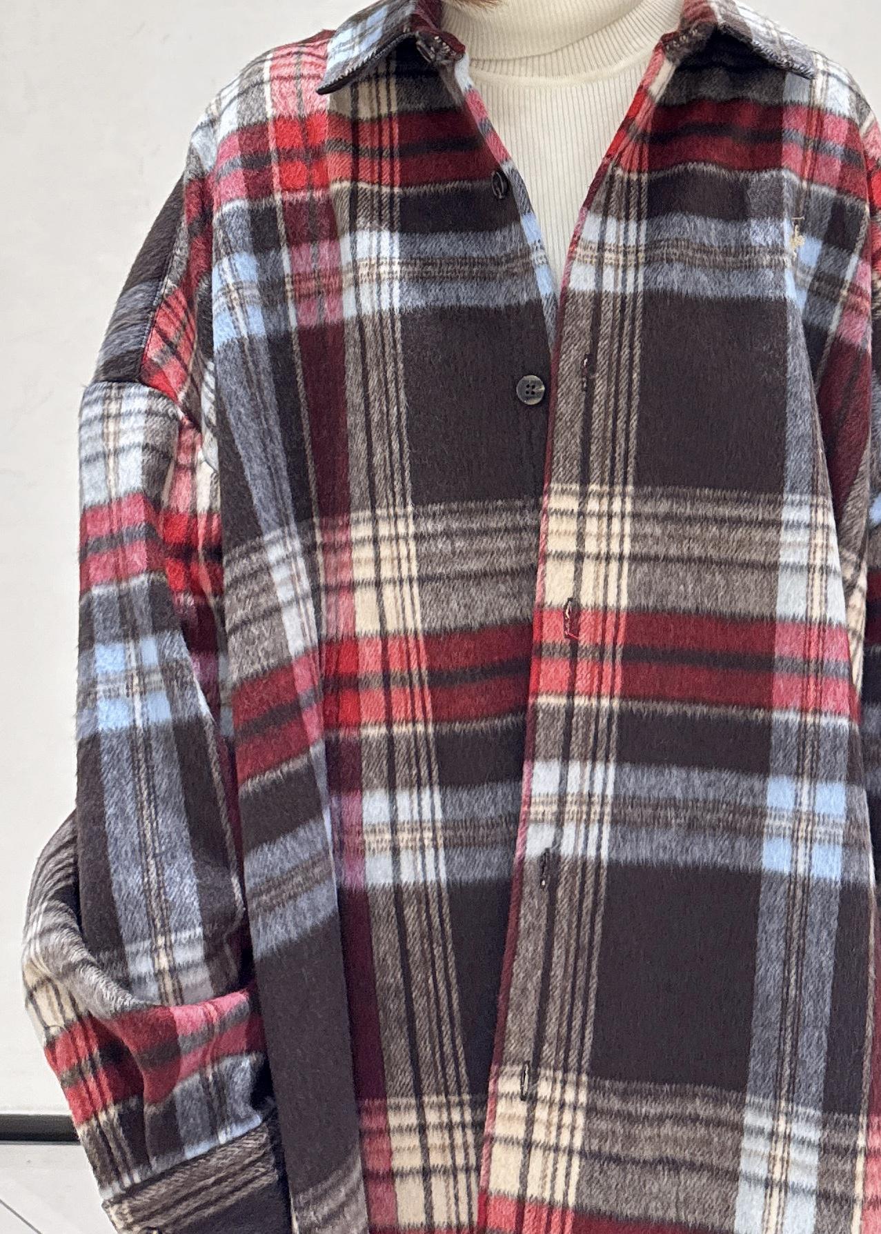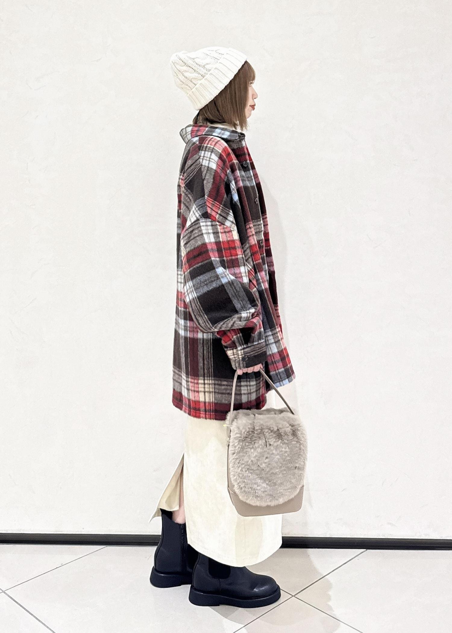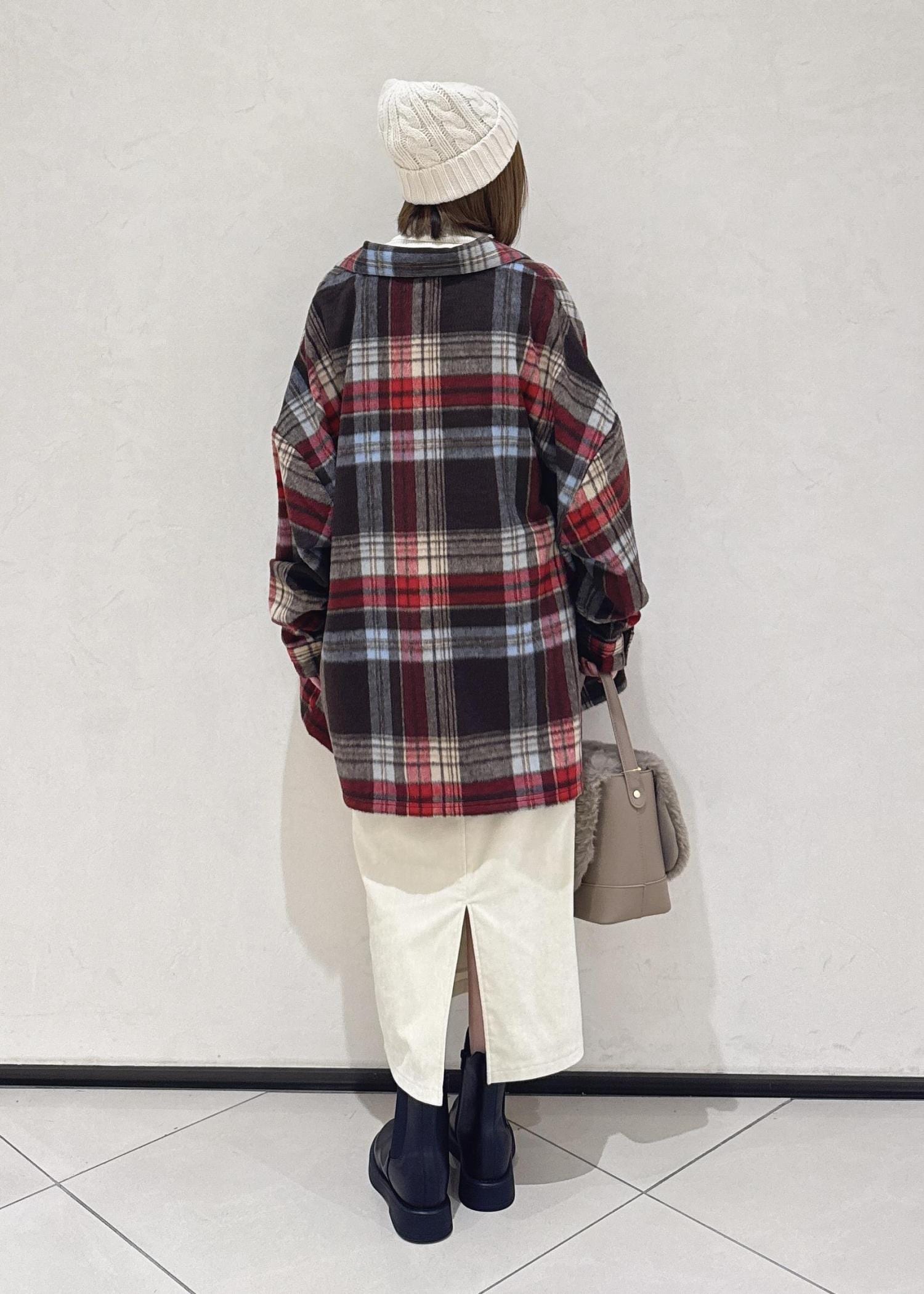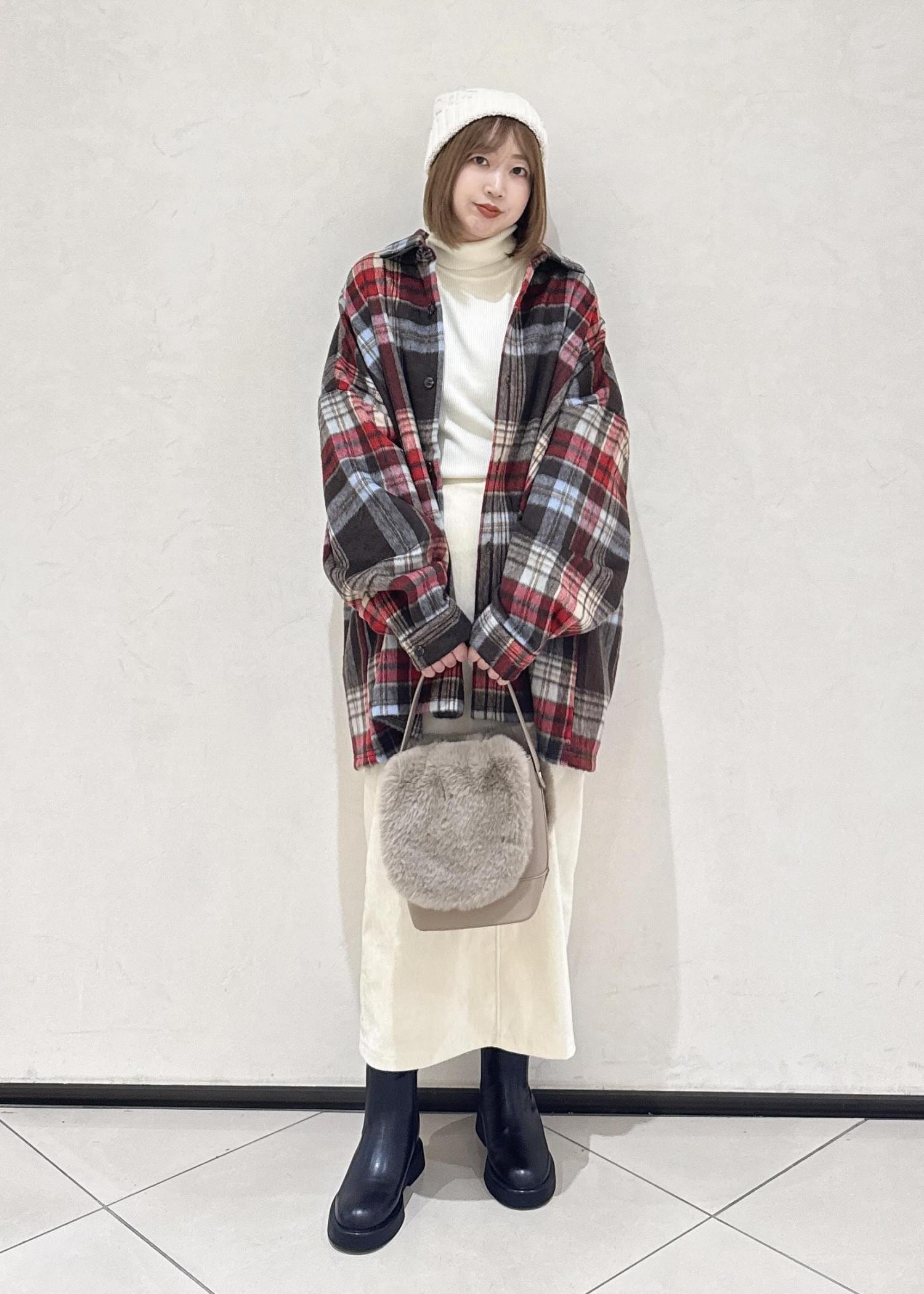 オーバーサイズのチェックシャツに、ボトムはアイラインスカートでスッキリとしバランスをとりました。