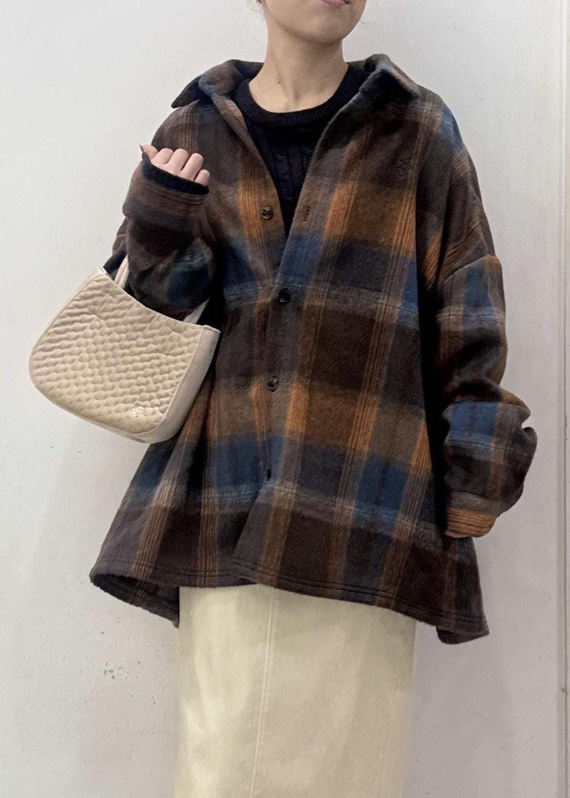 厚みのある素材感なので、インナーにニットなどを合わせてアウター代わりににもなりそうな1枚です。 -