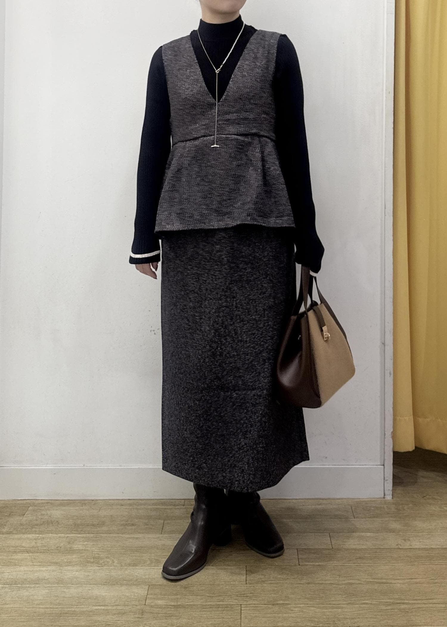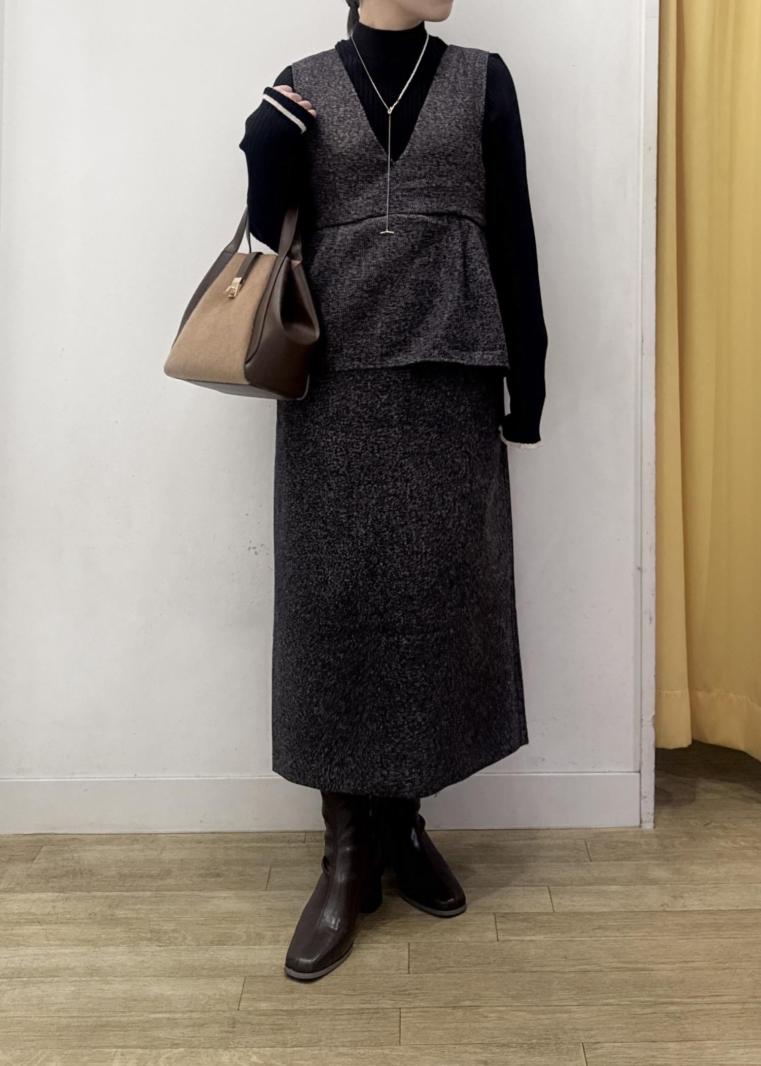 ふくらはぎが隠れるぐらいの着丈で、ショートブーツとの合わせはもちろん、ローファーやパンプスでも合わせやすい長さです。 -
