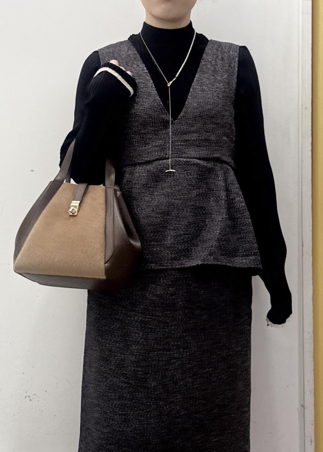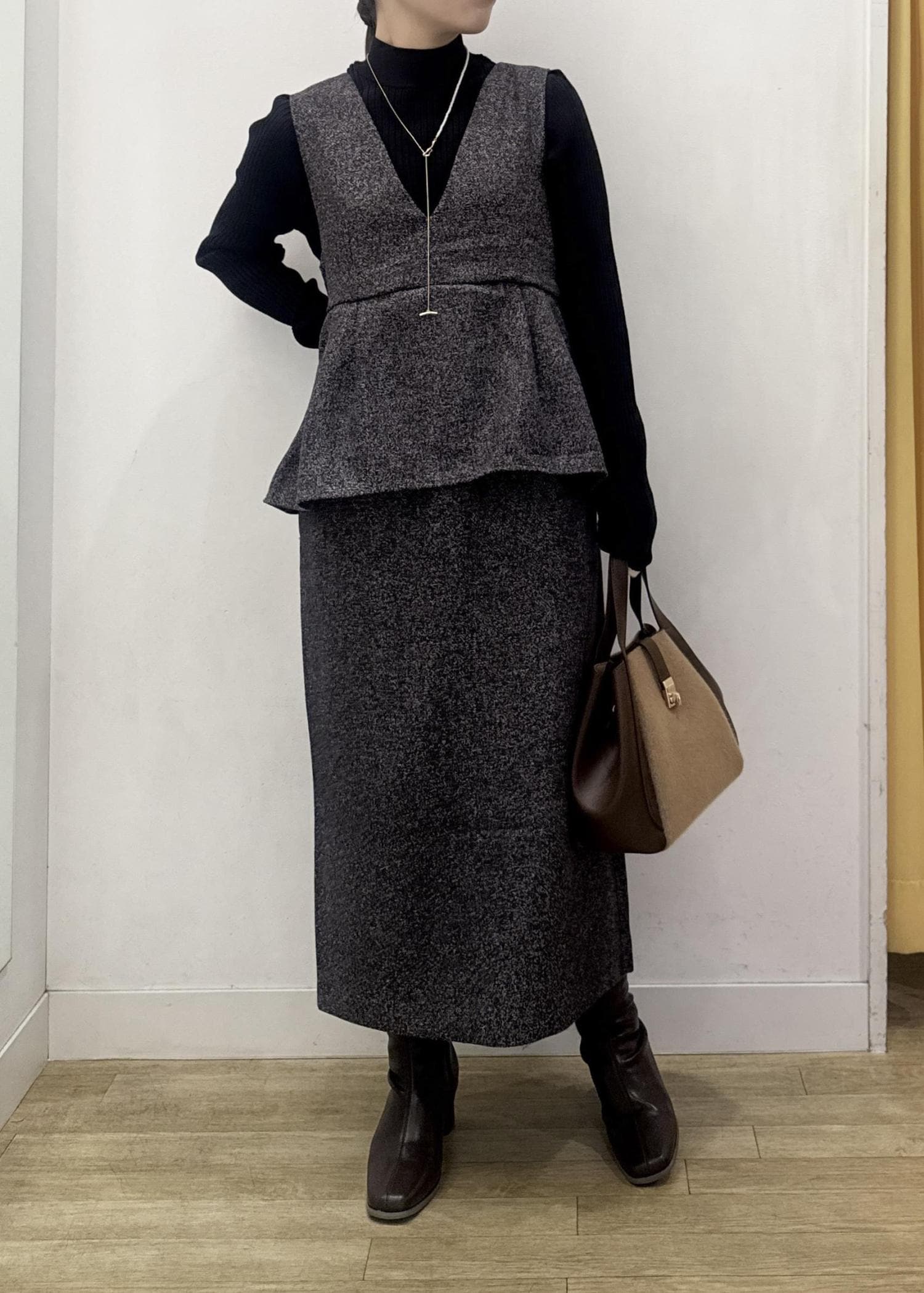 ブラックのニットトップスにブラウンカラーのジャンパースカートを合わせて、秋冬らしいシックなコーディネートに☺︎