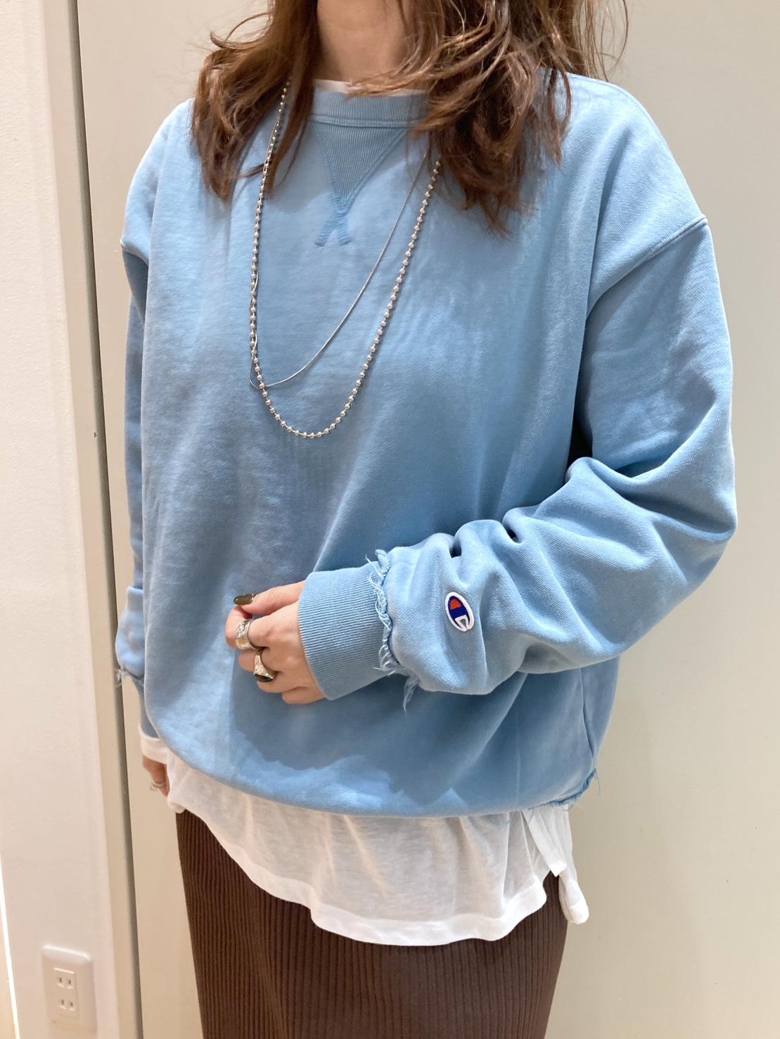 NEW!ROPÉ PICNIC【Champion/チャンピオン】ピグメント裏毛クルーネックスウェットサックス / F¥9,790レビュー袖口と裾口はカットオフとリブのコンビでヴィンテージ感があり、おしゃれな一枚です。