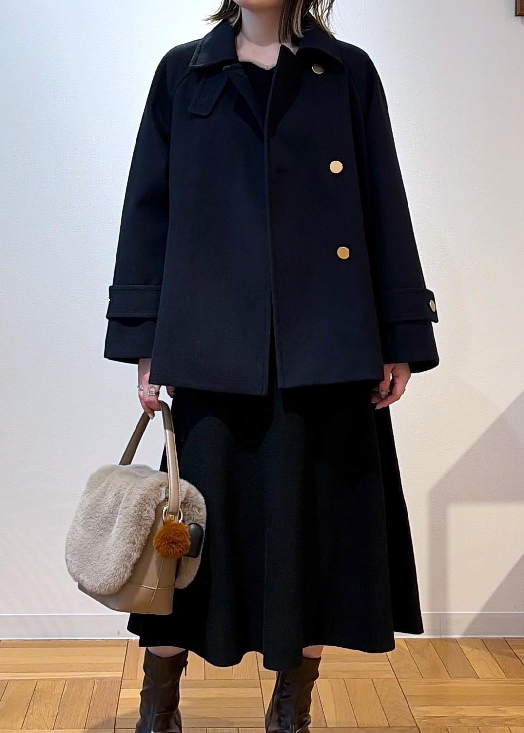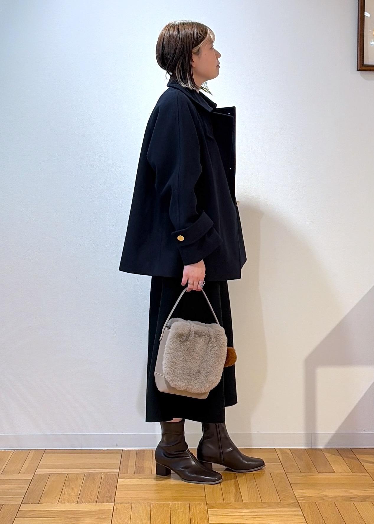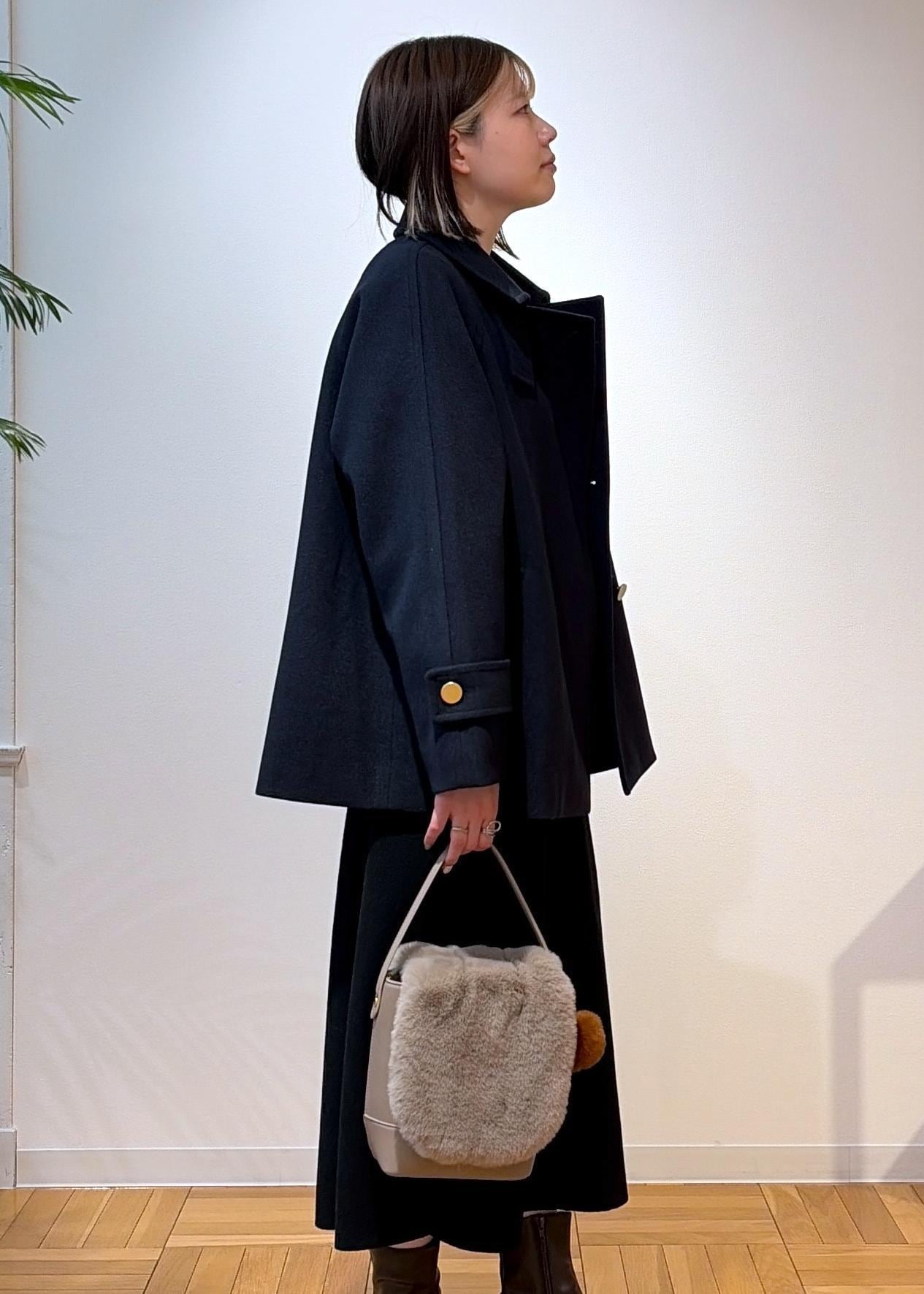 黒色のワンピースにネイビーのアウターで落ち着いたカラーの合わせなので、バッグは冬感+存在感のある物を選びました◎