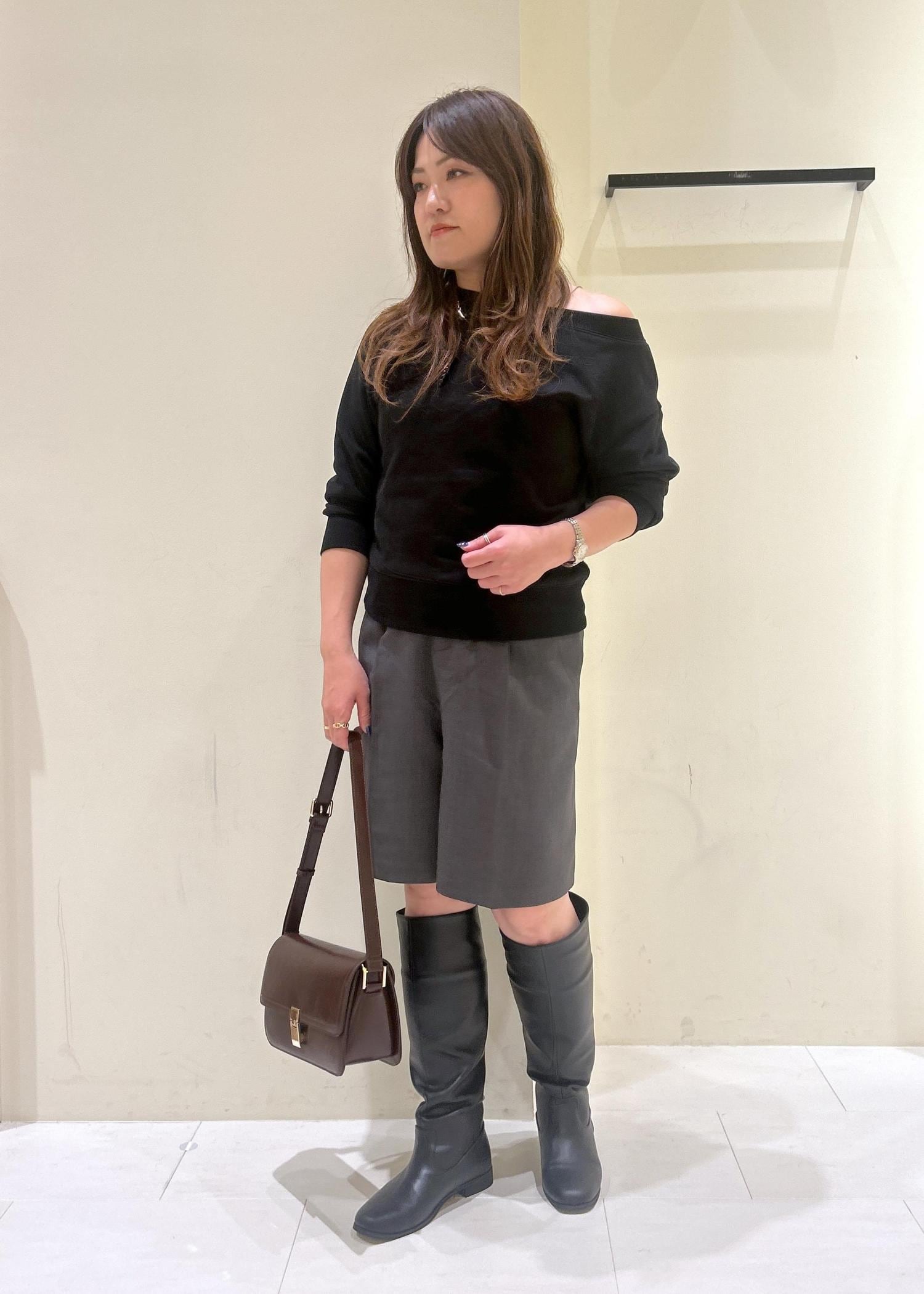 オフショルのスウェットに長めのショートパンツを合わせた大人のショートパンツスタイル。