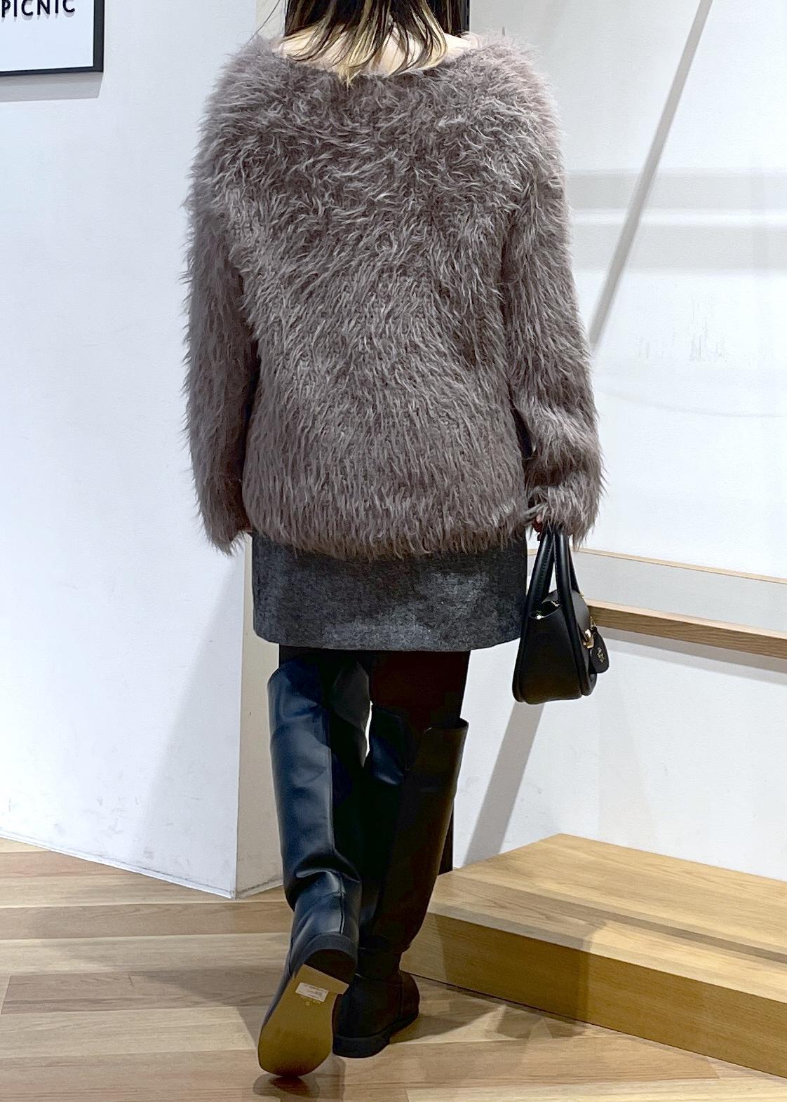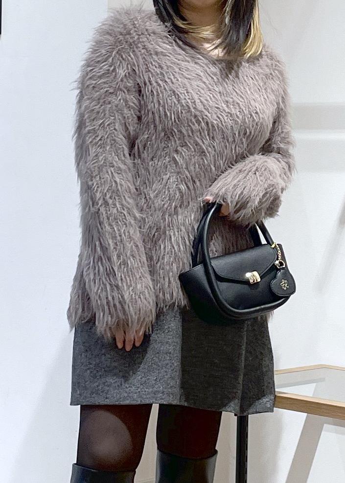 毛足の長いフェザーのニットです。vネックなのでお首元はスッキリです。ふわふわで、着るだけで女性らしいフェミニンなスタイルができちゃいます。
