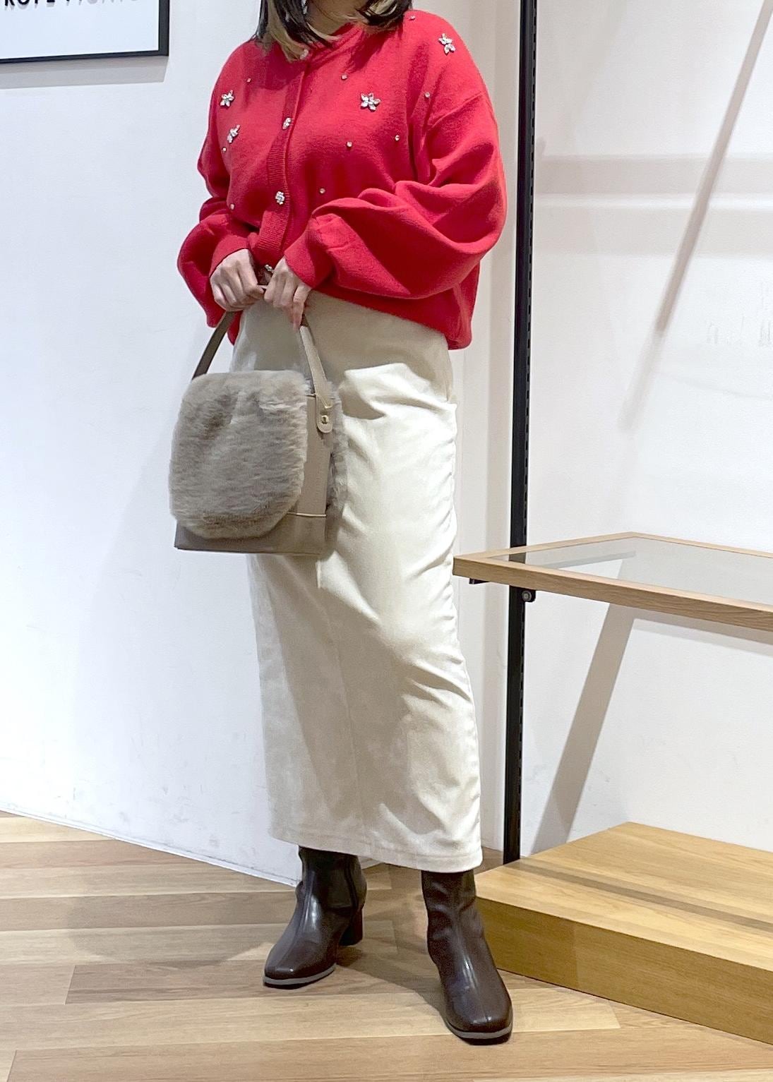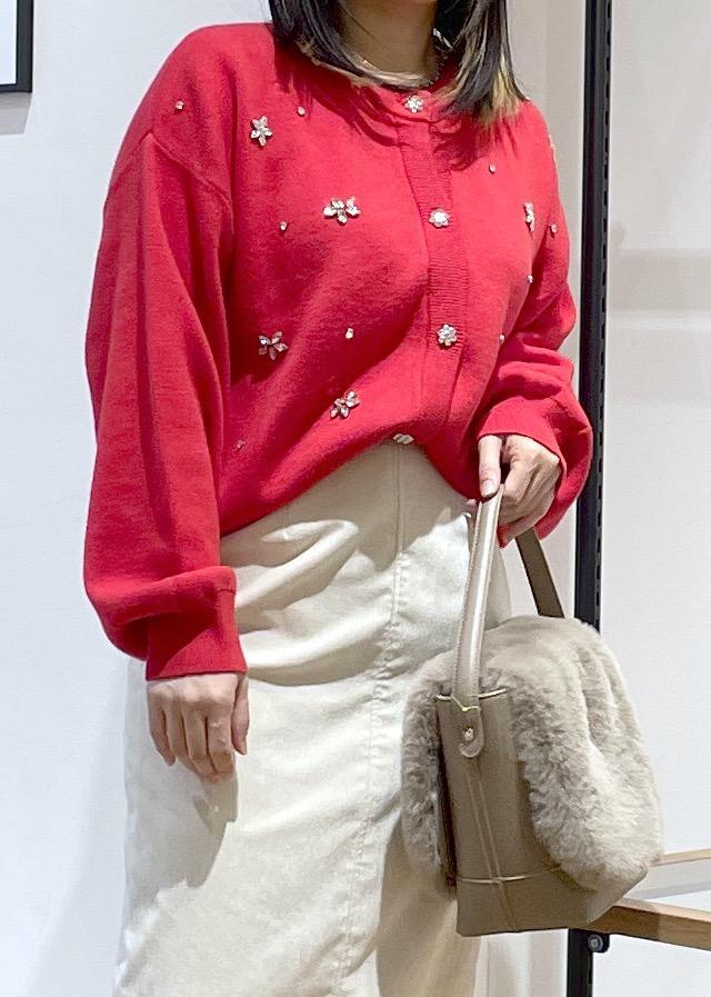 大きめのビジューが印象的なカーディガンです。着心地はとても柔らかく、もちもちとした肌触りです。大人可愛スタイルに大活躍します。