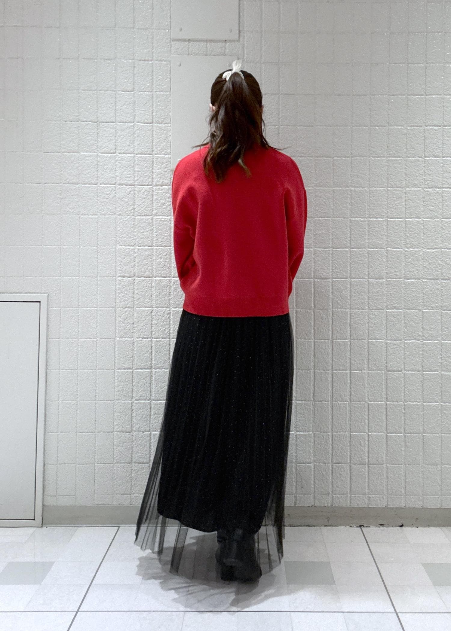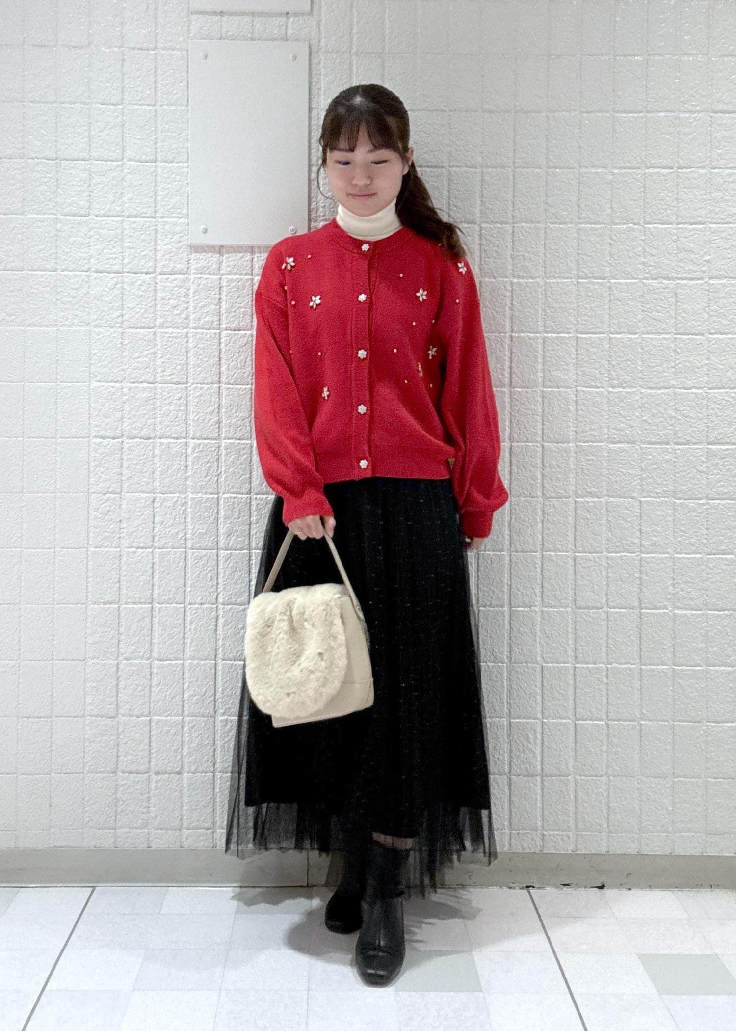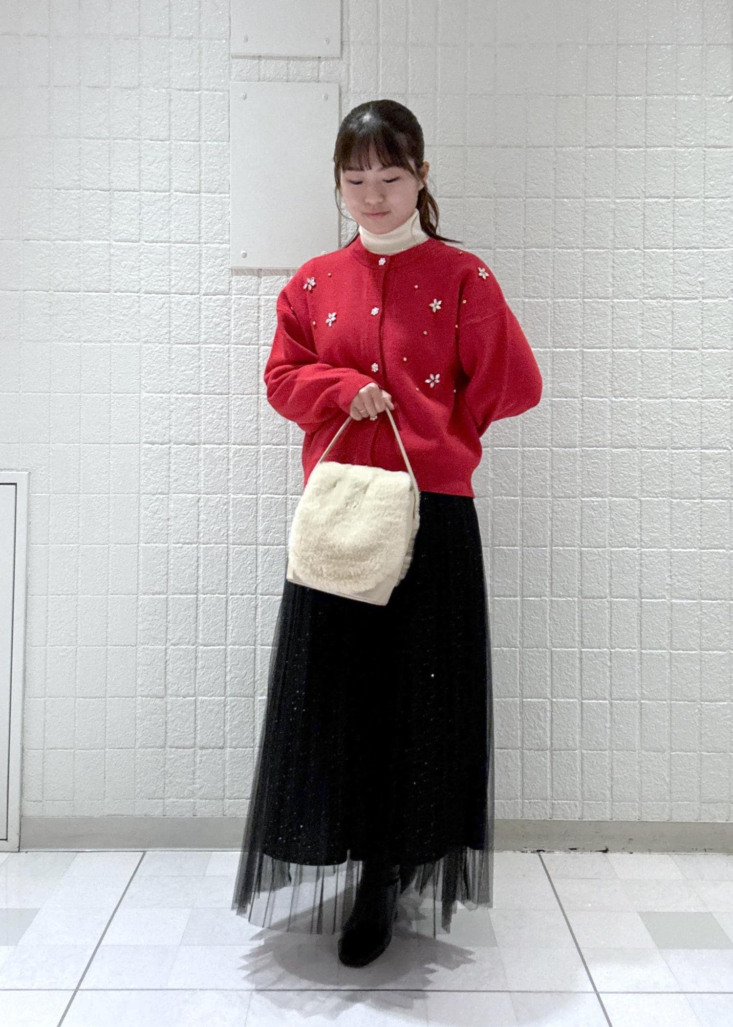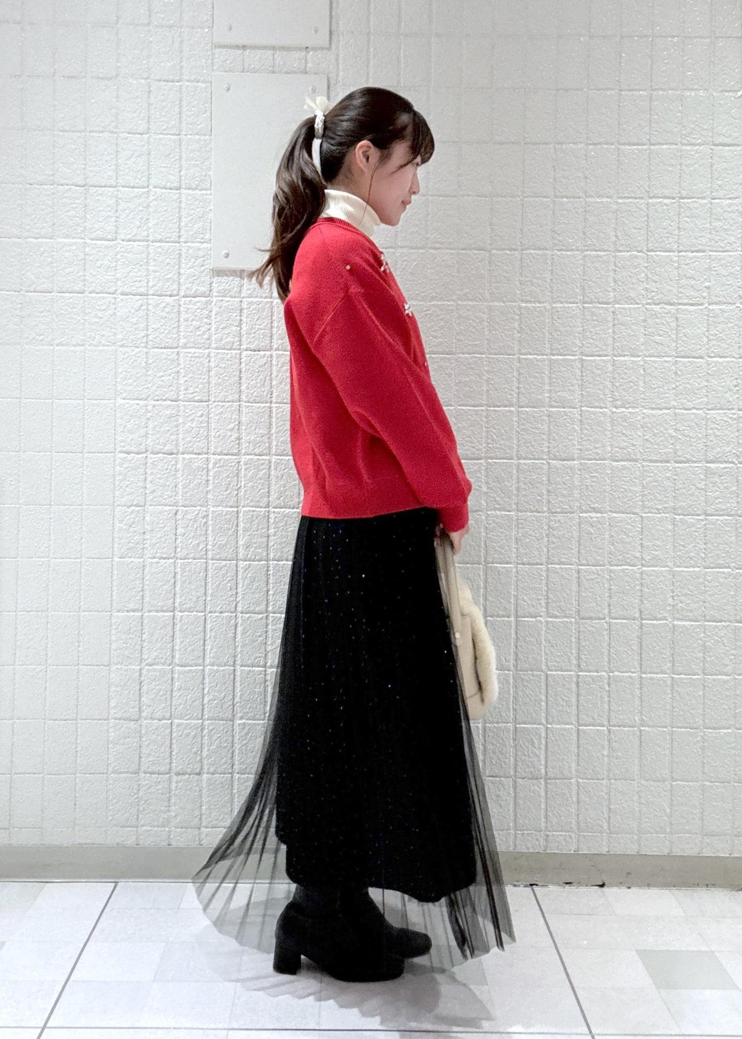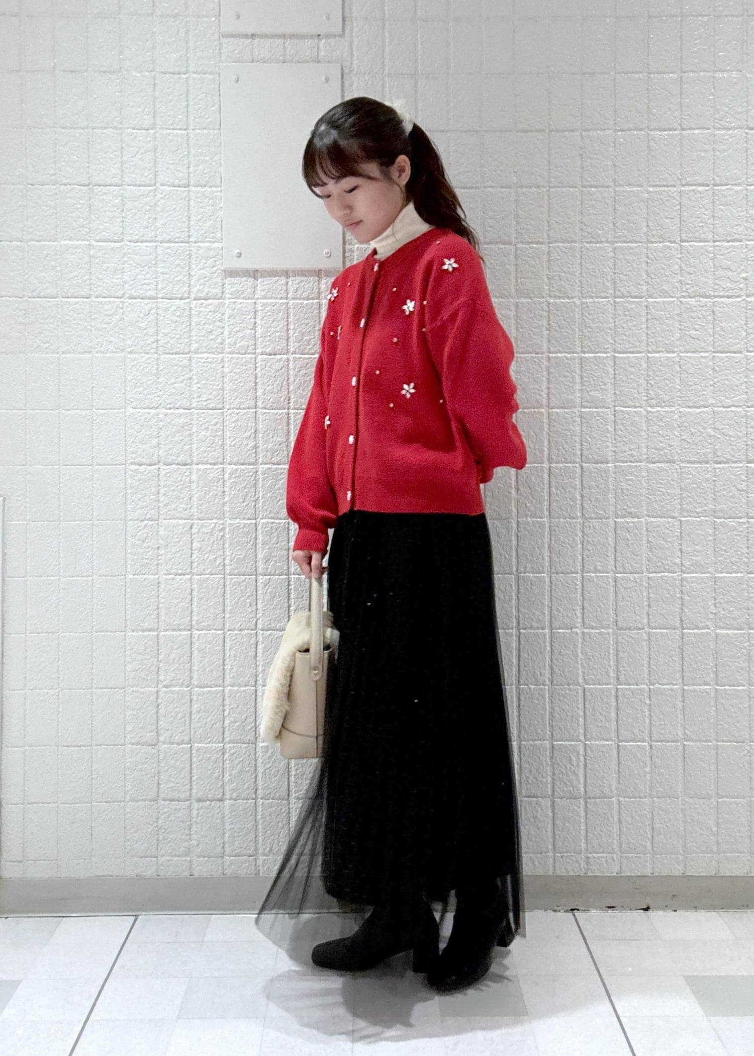 赤ニットカーディガンとキラキラチュールスカートを合わせて冬らしいのコーディネートを組みました。
