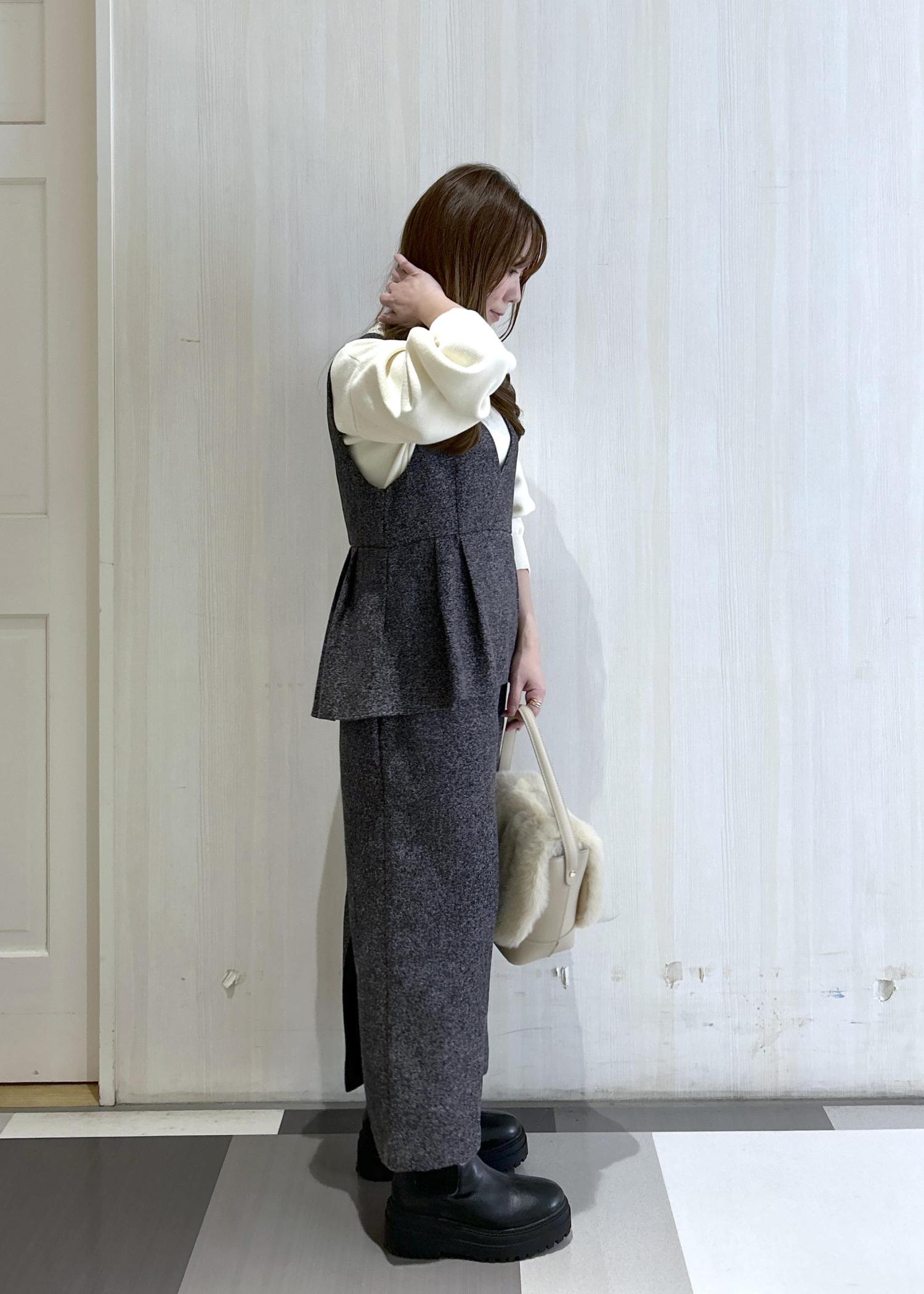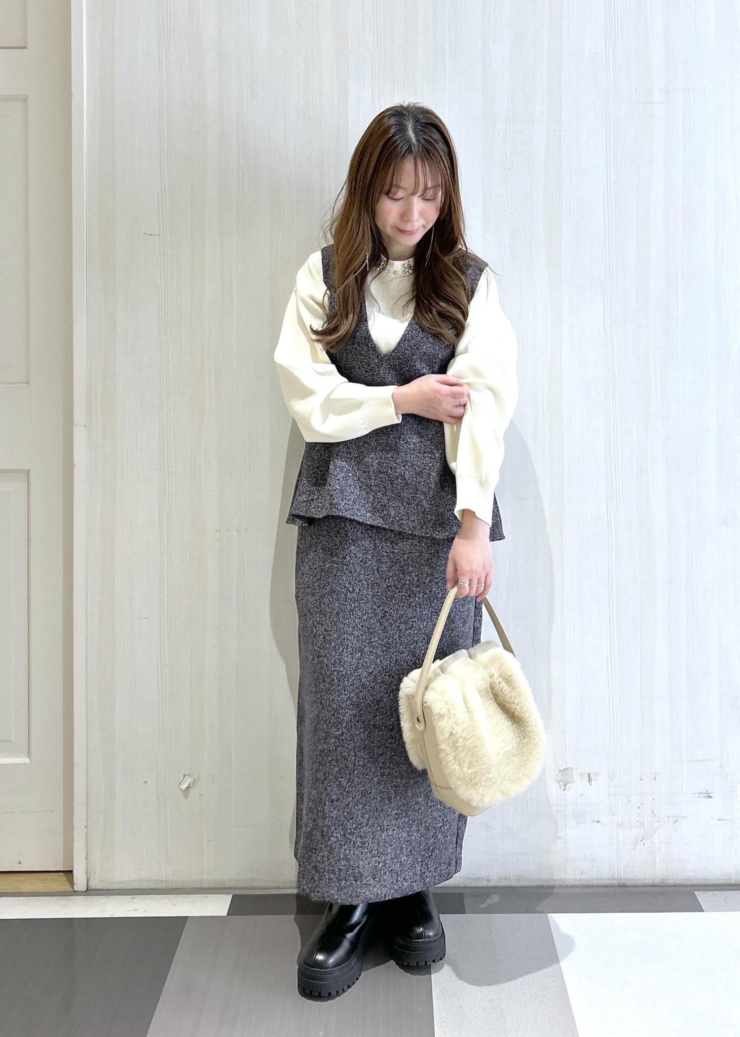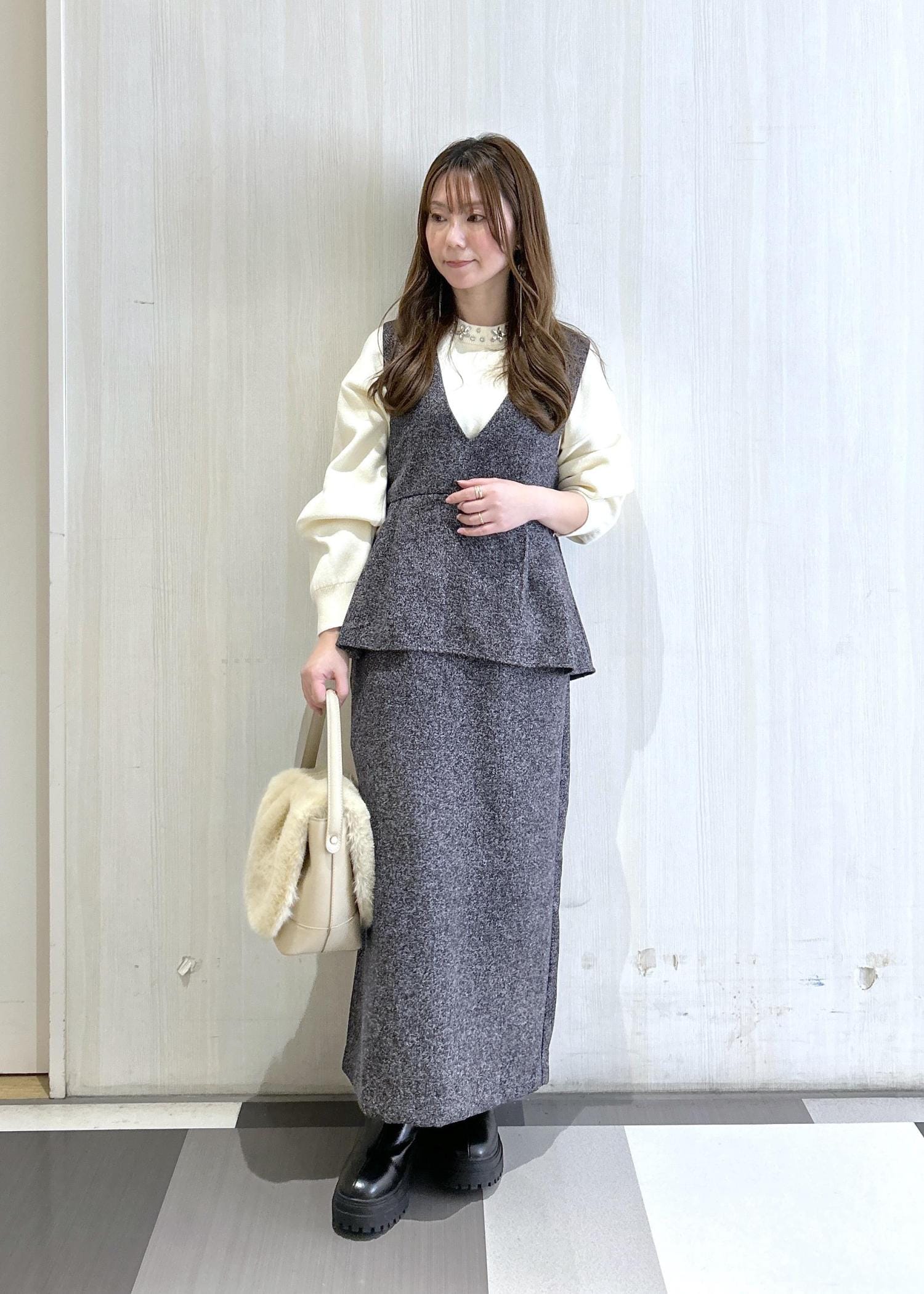 首元にキラキラのビジューがついたニットトップスを合わせて華やかさをプラスしました!