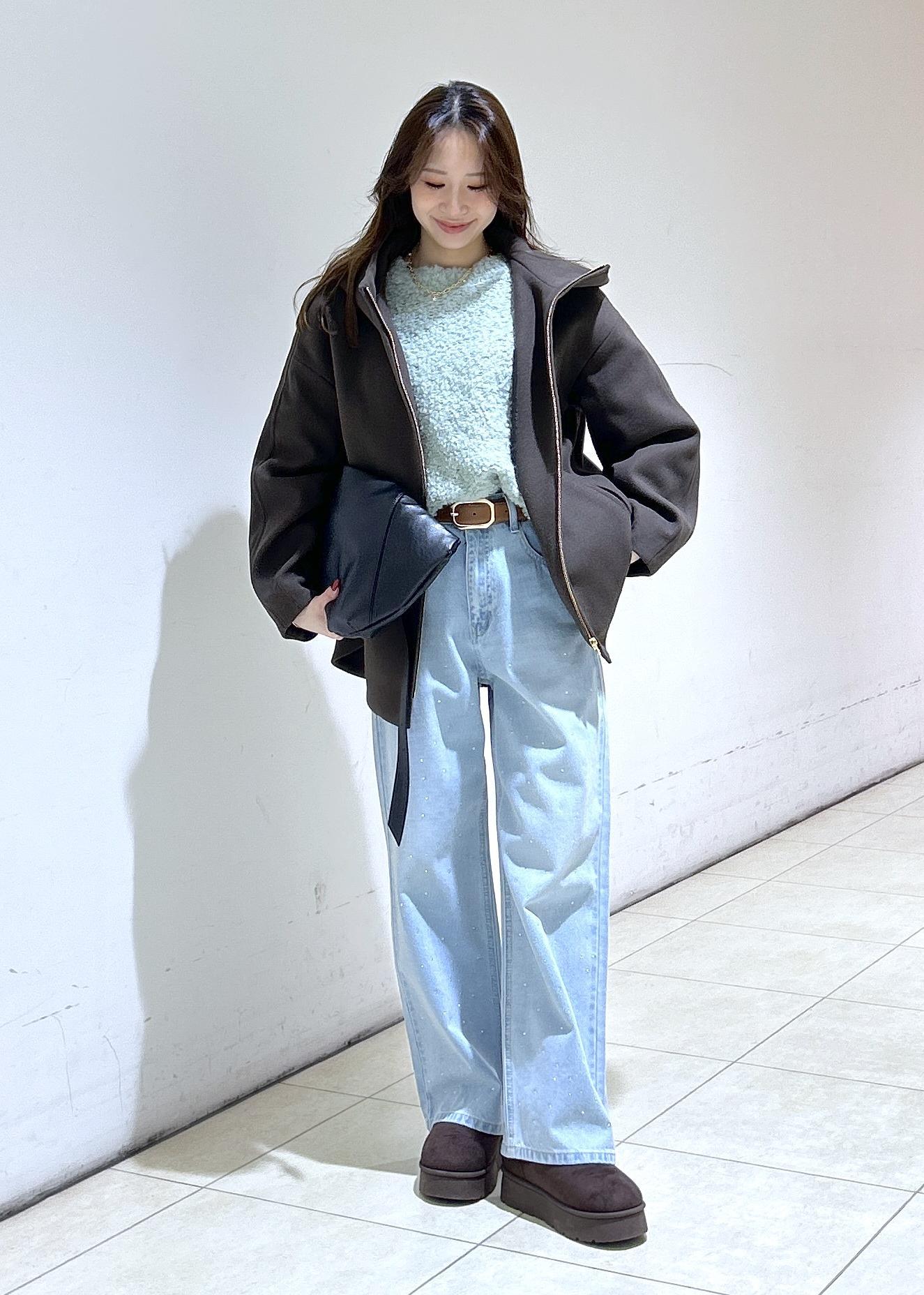 グリーンのニットをアクセントにし、アウター、シューズはブラウンで揃えて統一感あるカジュアルスタイリングにしました。
