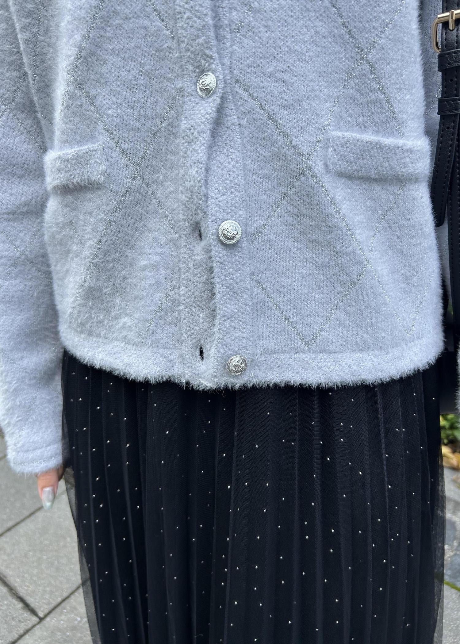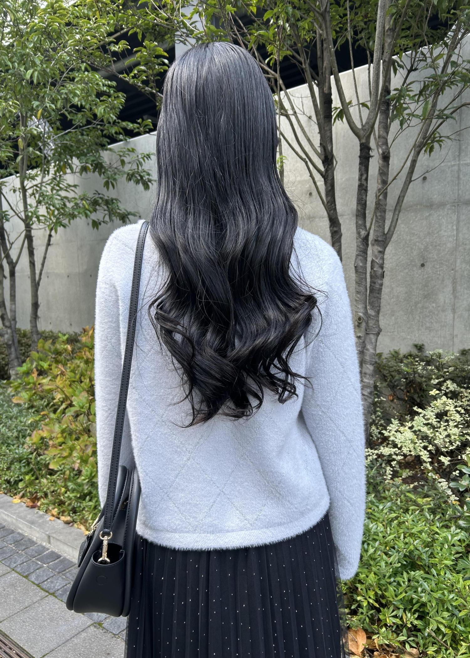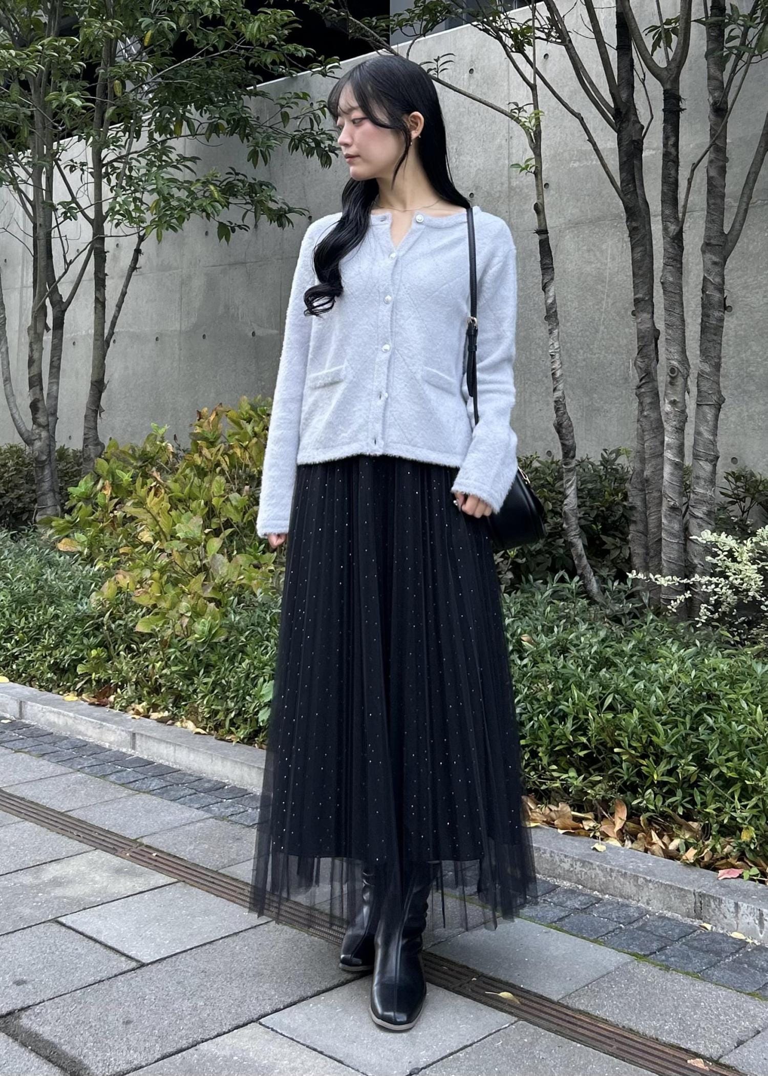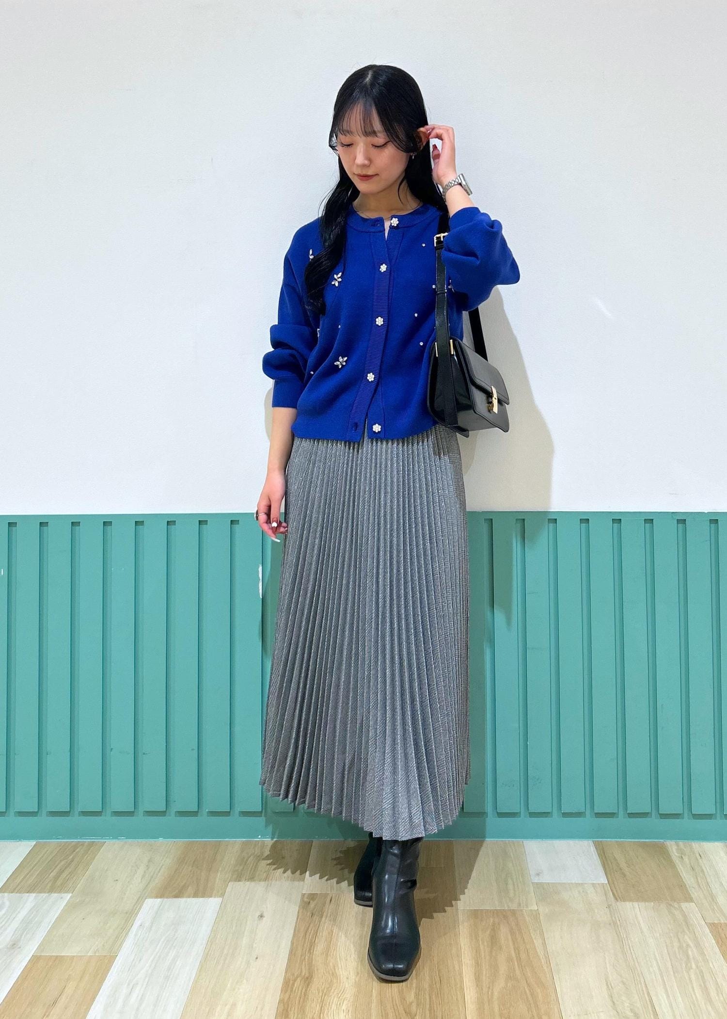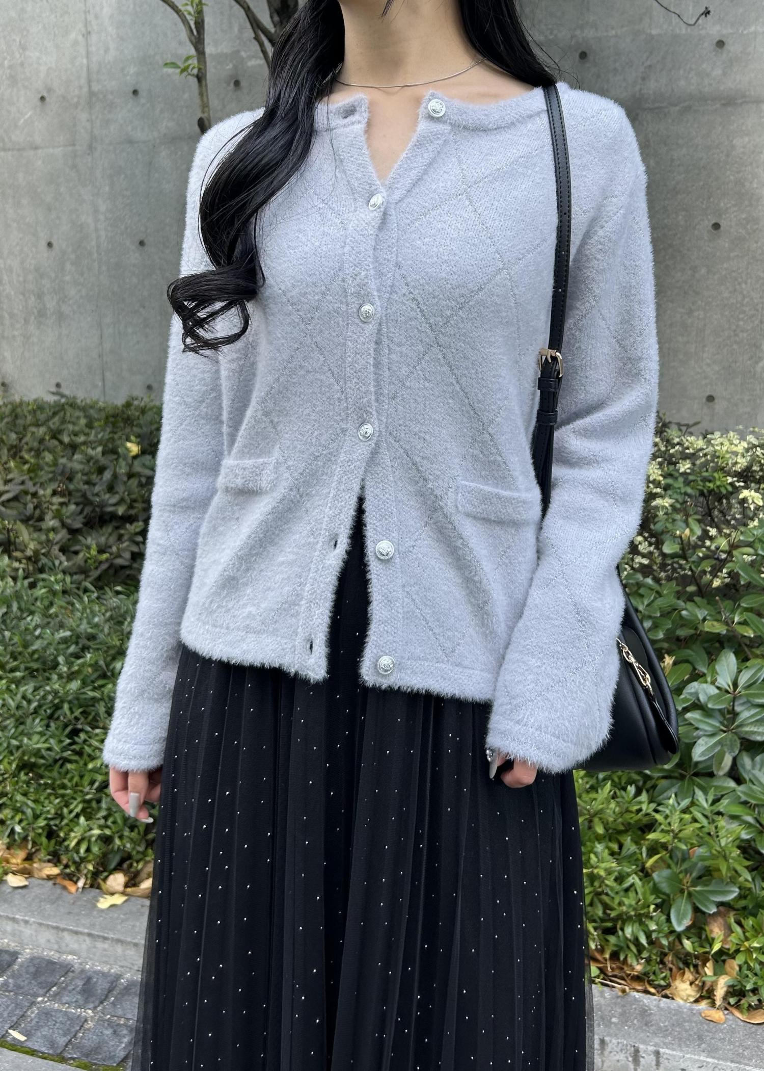 ブルーのラメフェザーカーディガンが柔らかい光をまとっていて、冬らしい透明感を引き出してくれています。