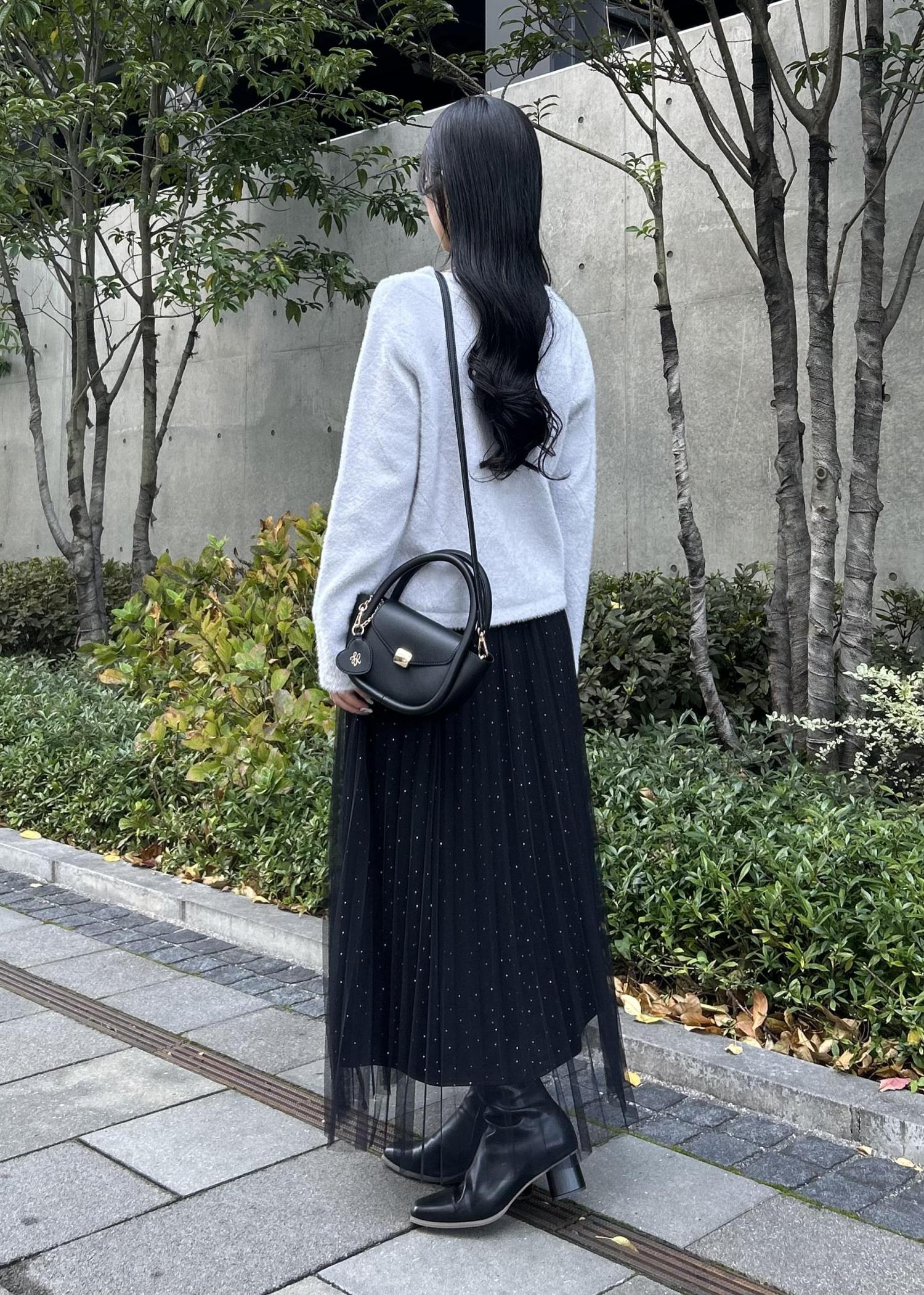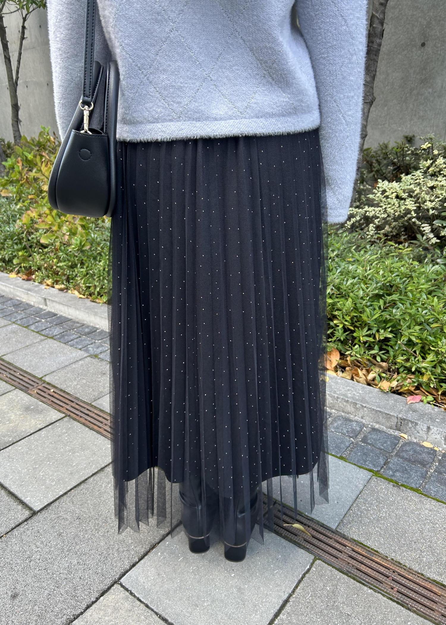 黒のロングスカートは、細かなドットのような煌めきが散っており、歩くたびに揺れながらさりげなく光るのがとても上品です。