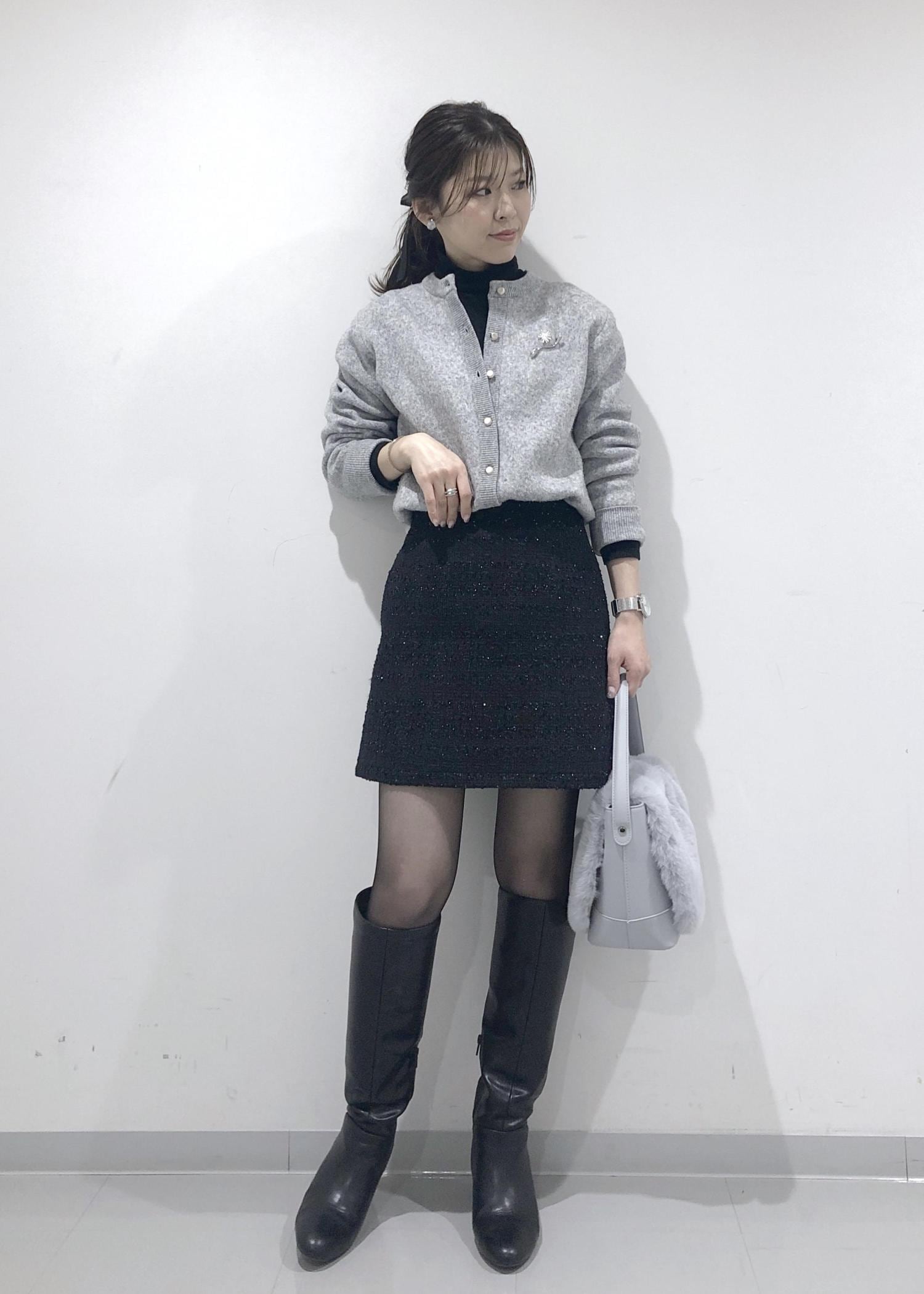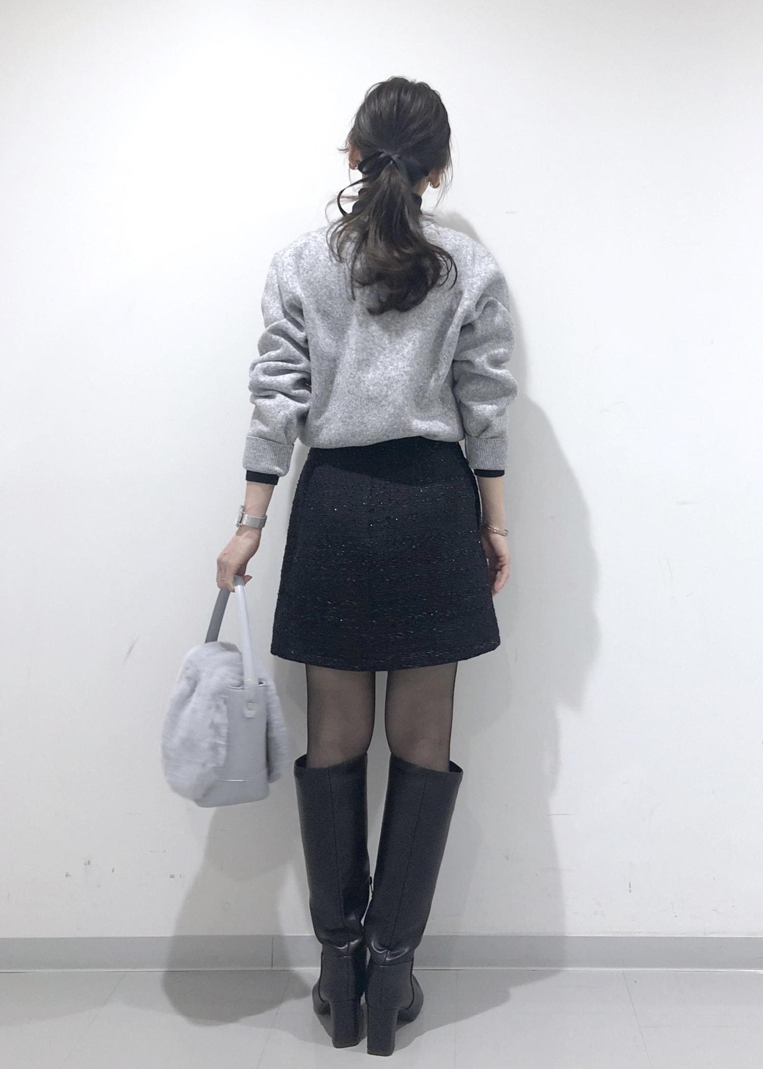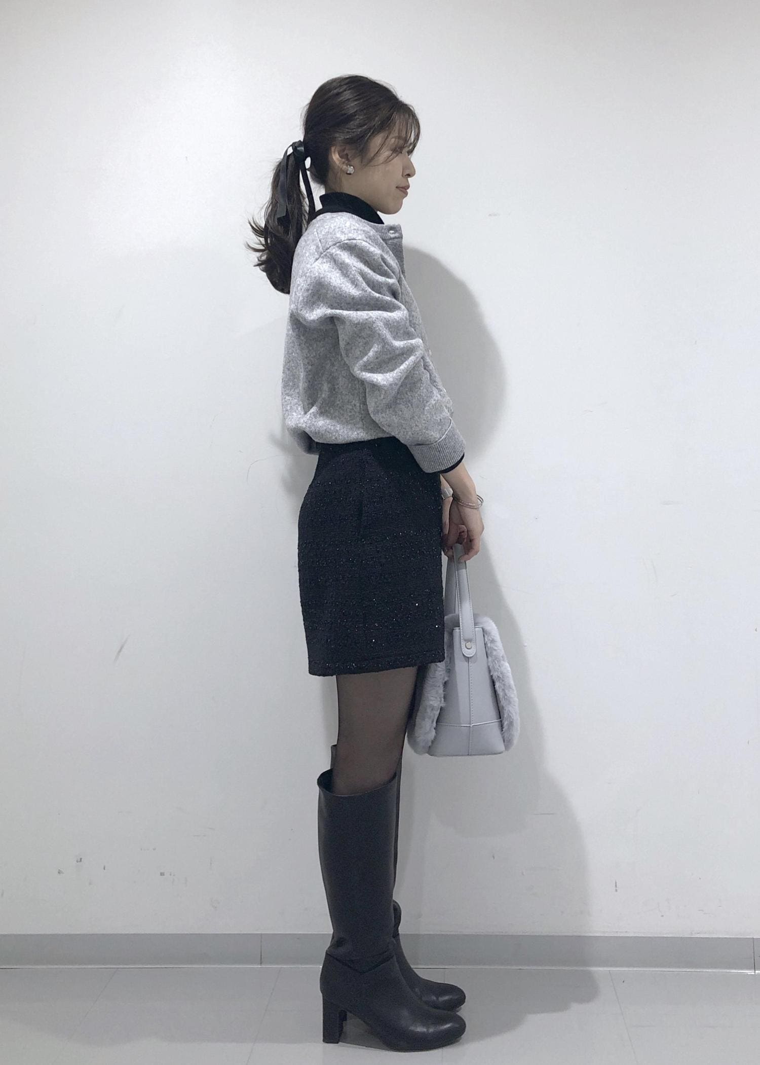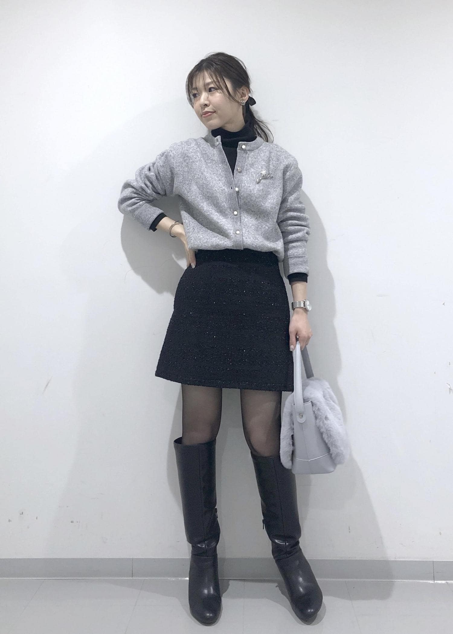 ミニスカート×ロングブーツの冬ならではのコーディネート。