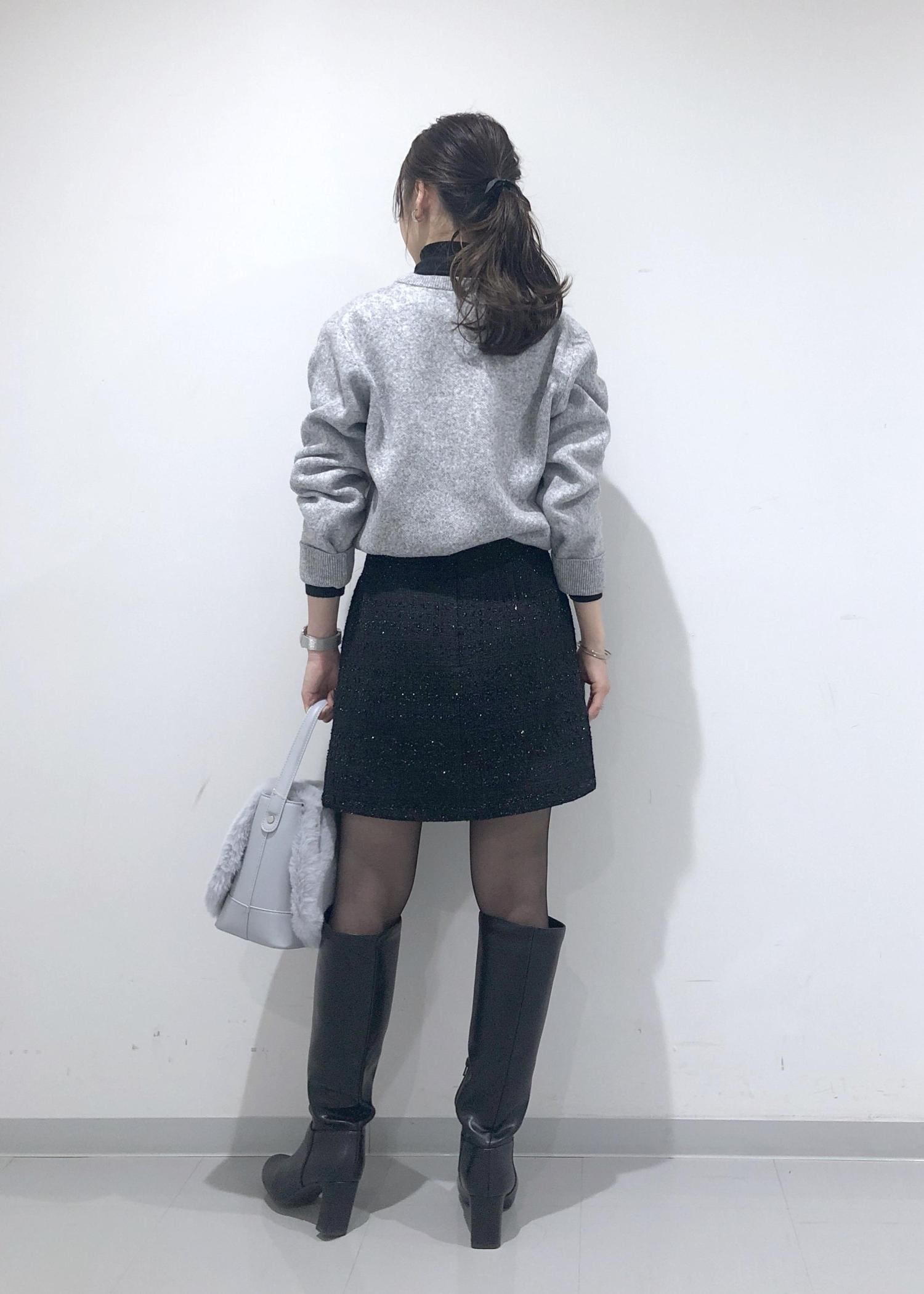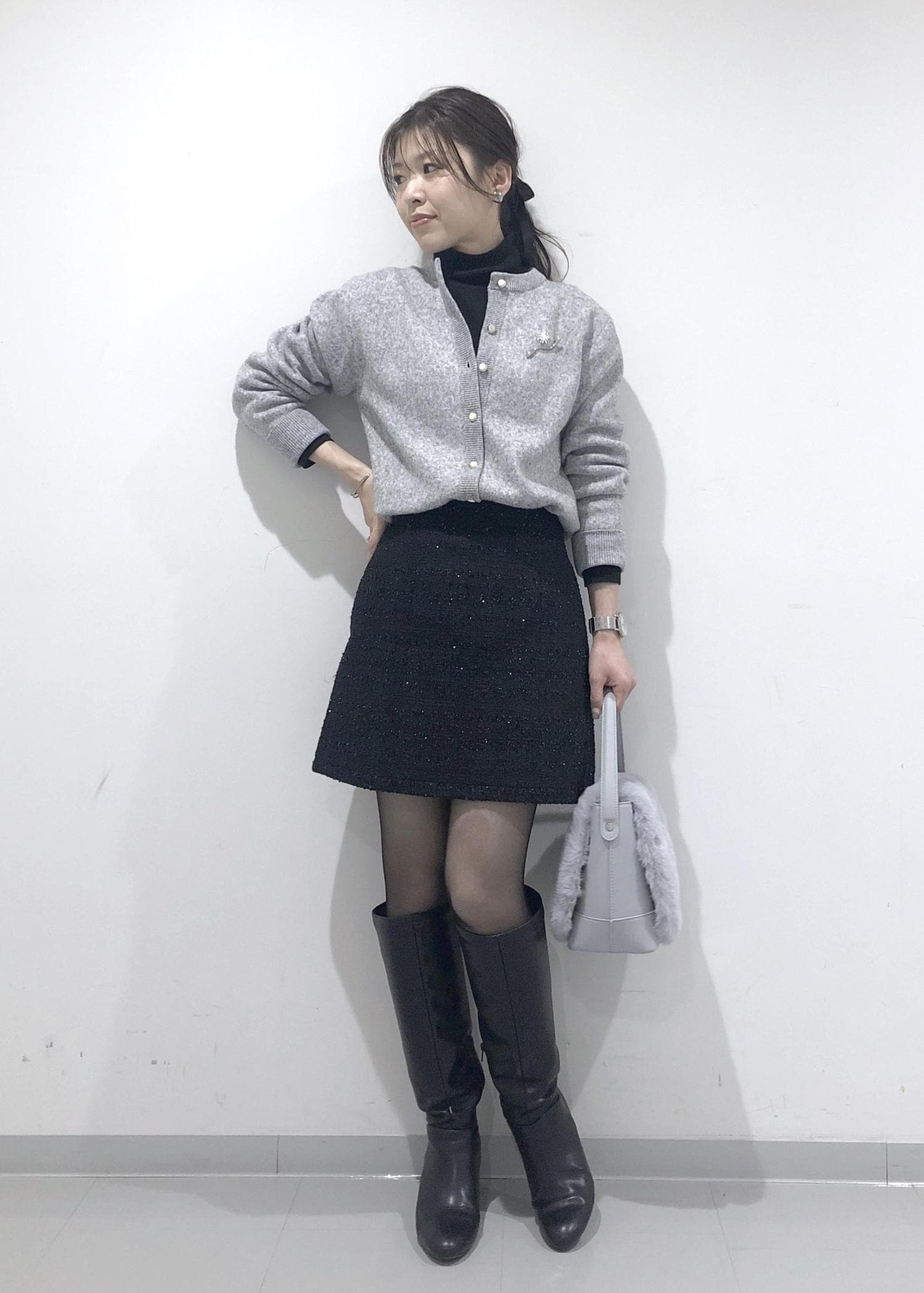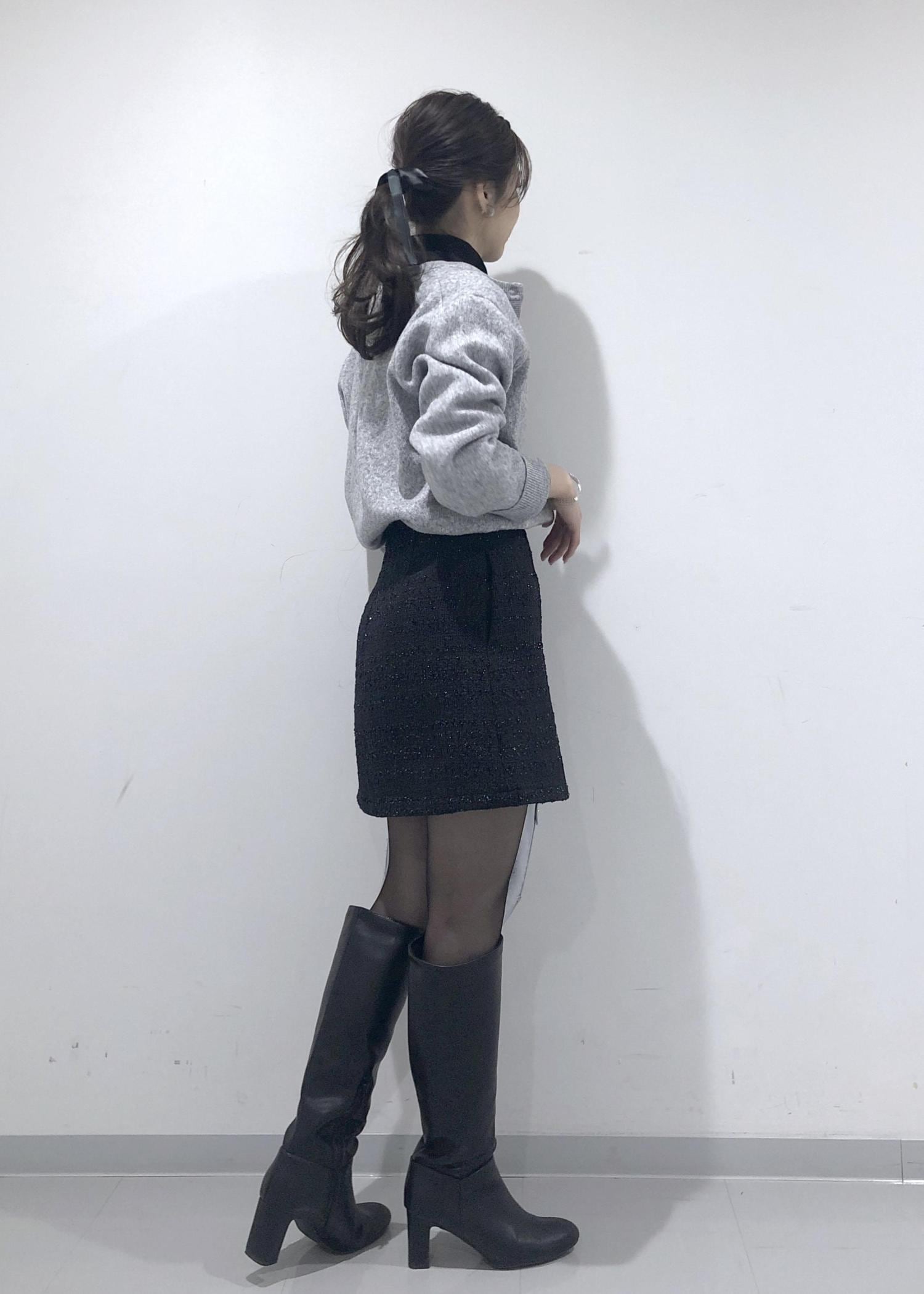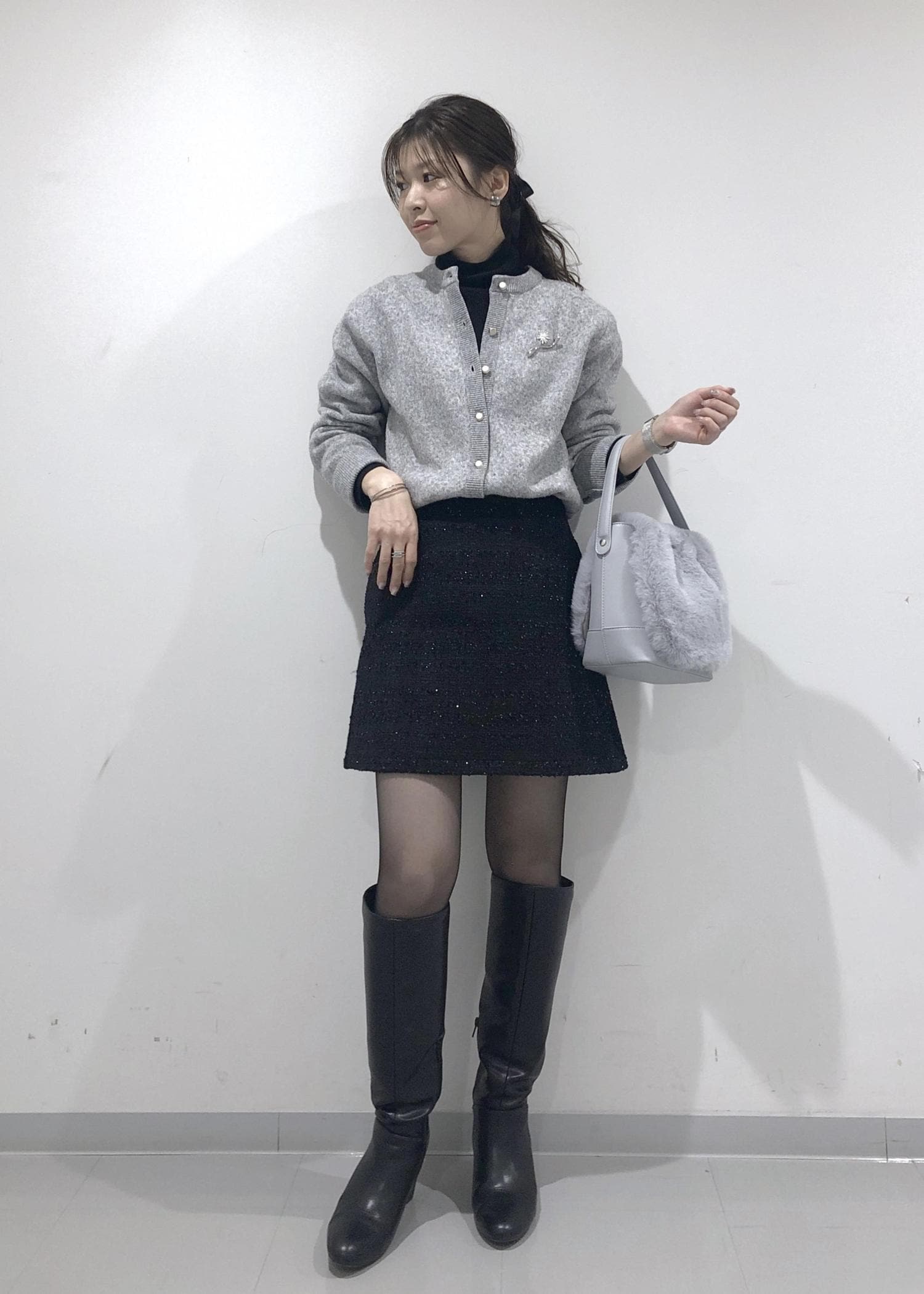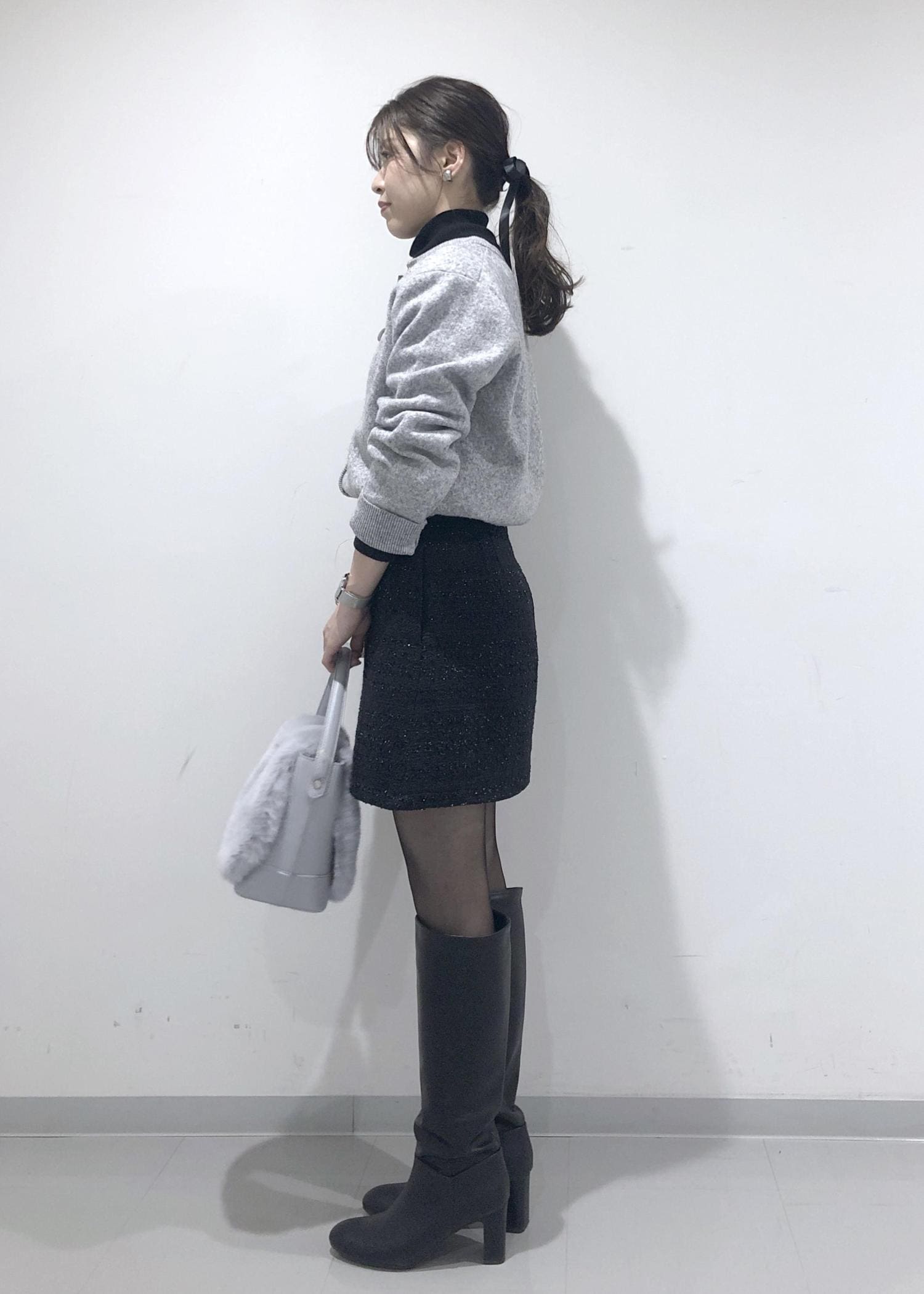 ミニスカート×ロングブーツの冬ならではのコーディネート。
