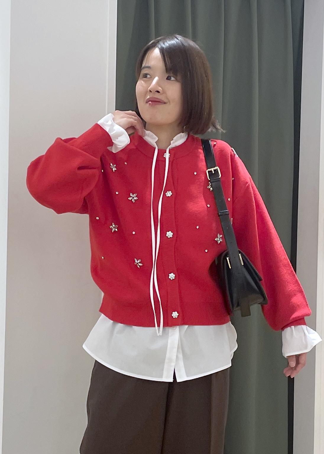 ROPÉ PICNICビジューニットカーディガンレッド / F¥5,995レビューしっかりと厚みのありカーディガンで、生地は柔らかく着心地も良かったです。身頃は程良くゆとりもあるので、シャツやカットソーなどのレイヤードスタイルも楽しめます。ビジューのデザインが華やかな印象なので、スタイリング主役になるカーディガンです。