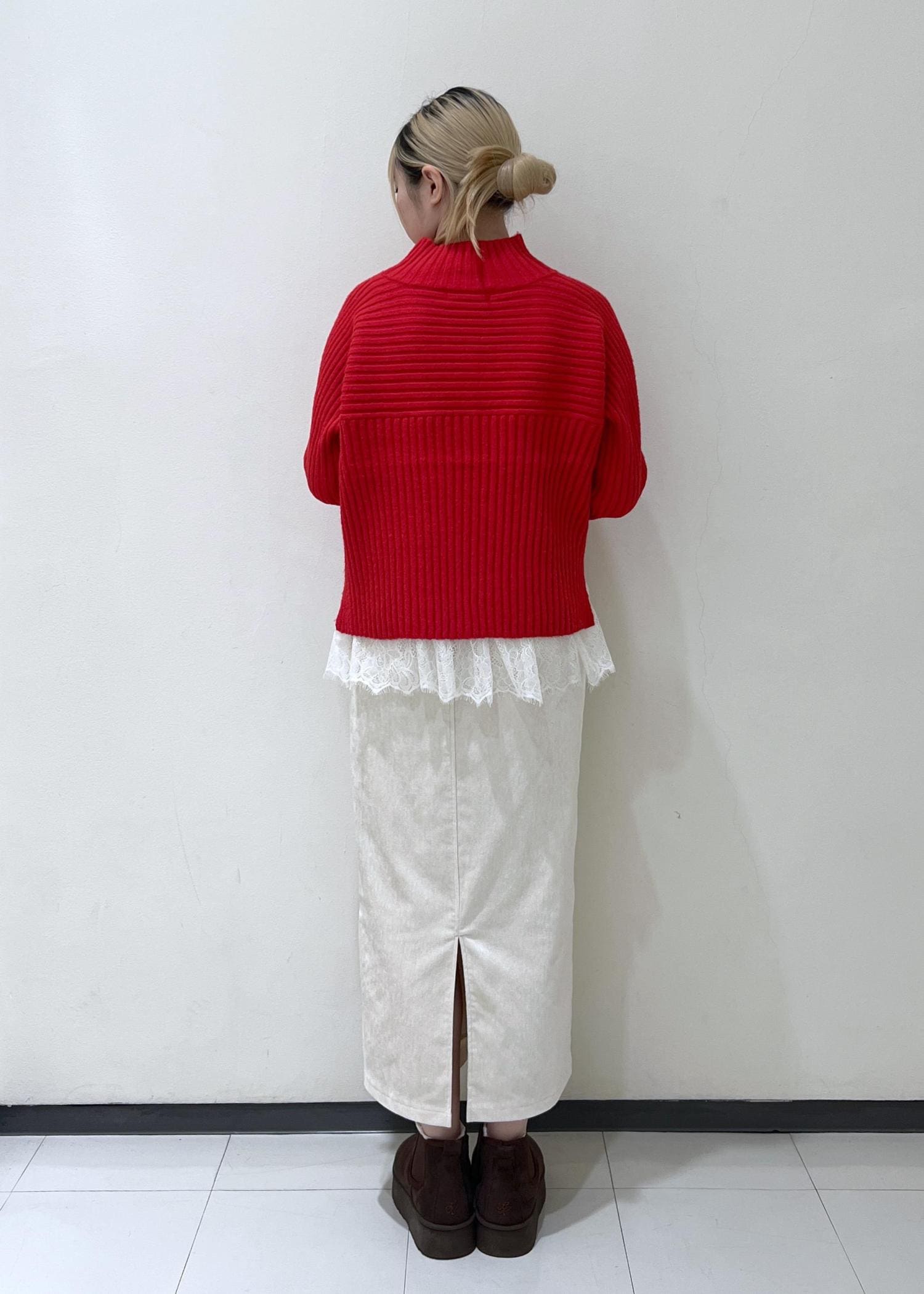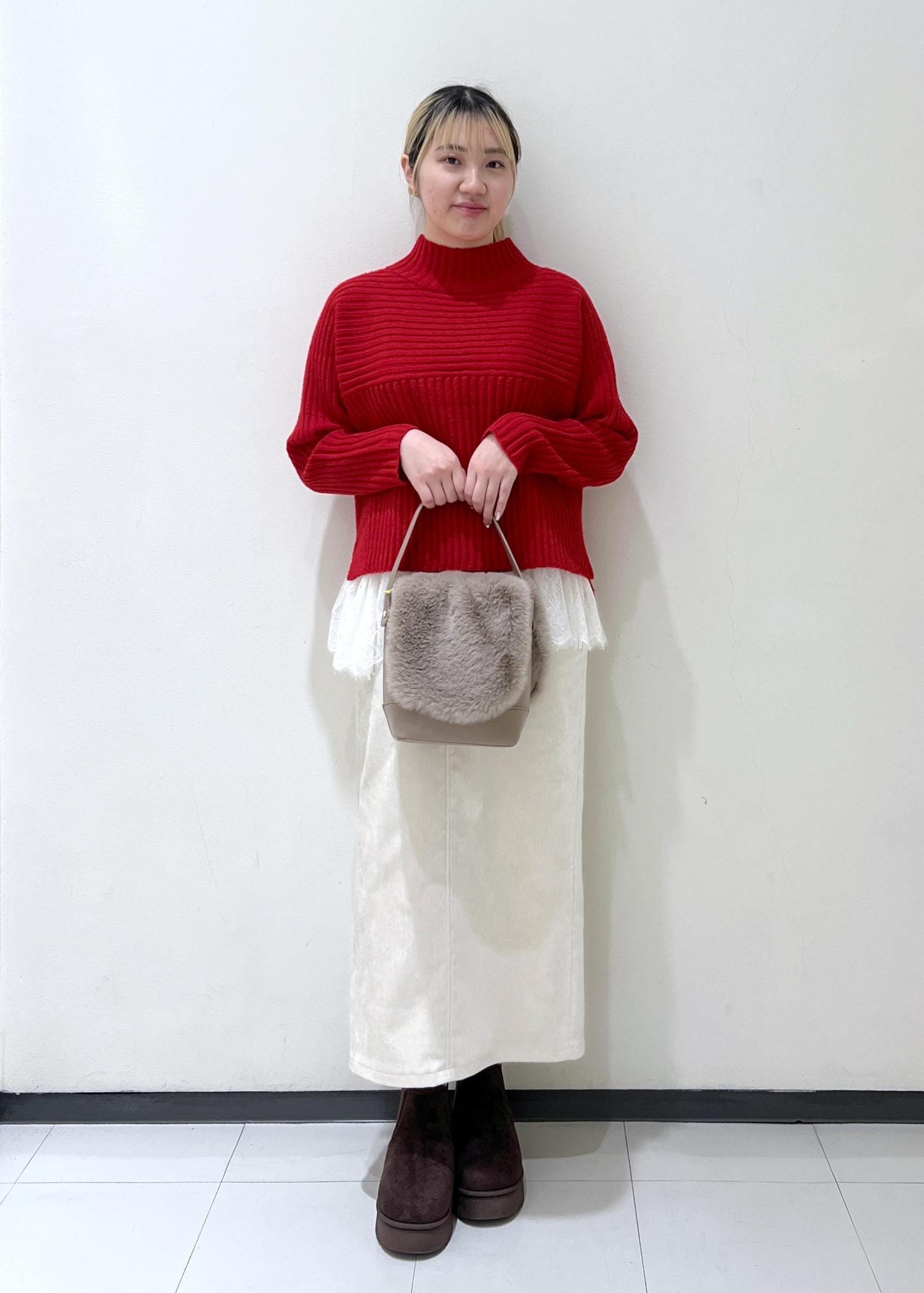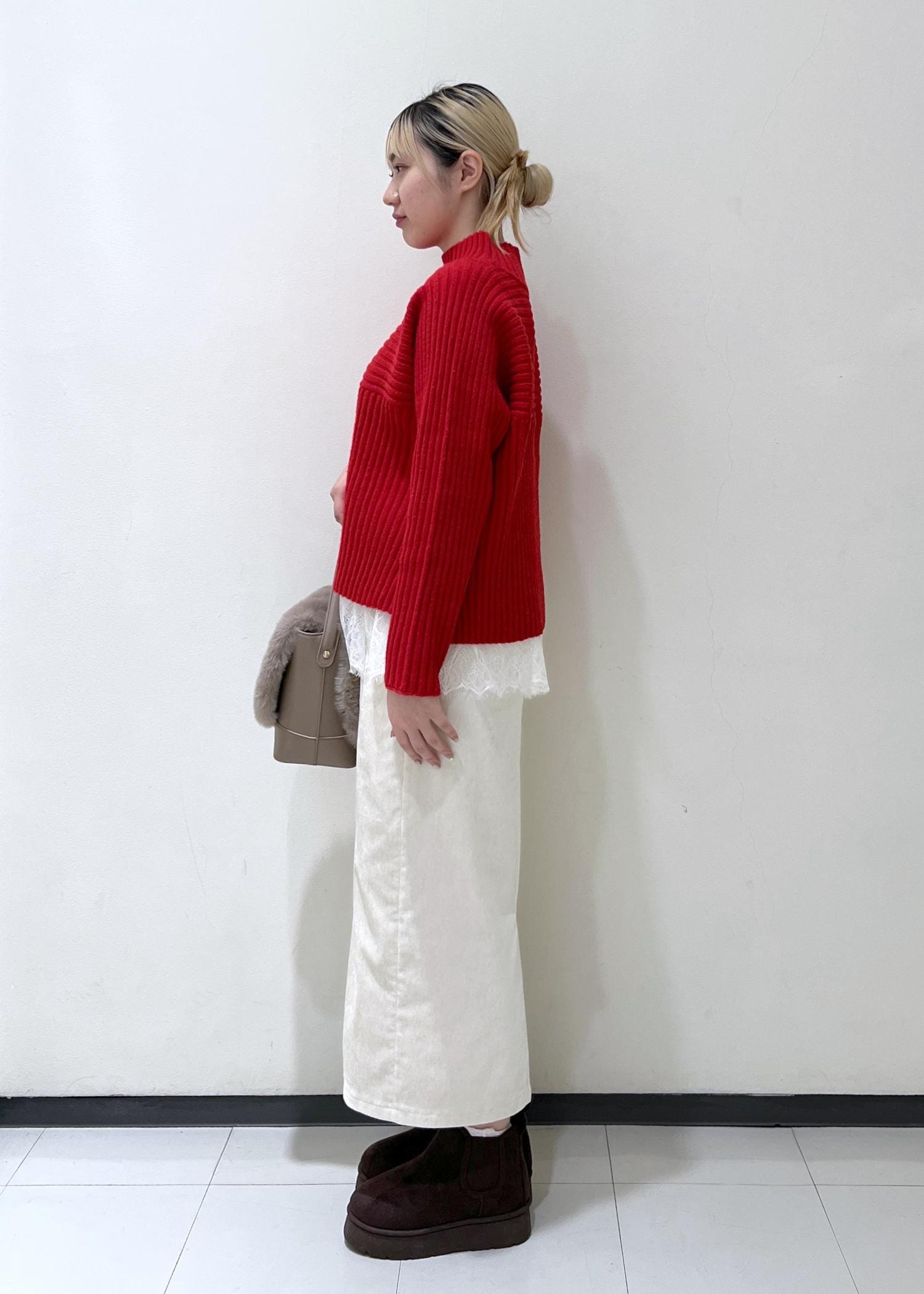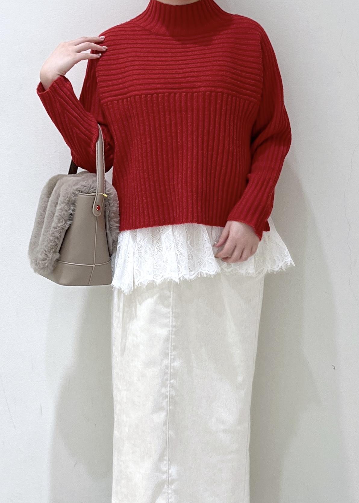 1枚で着映えする赤ニットにレースを合わせたレイヤードスタイルにしました!