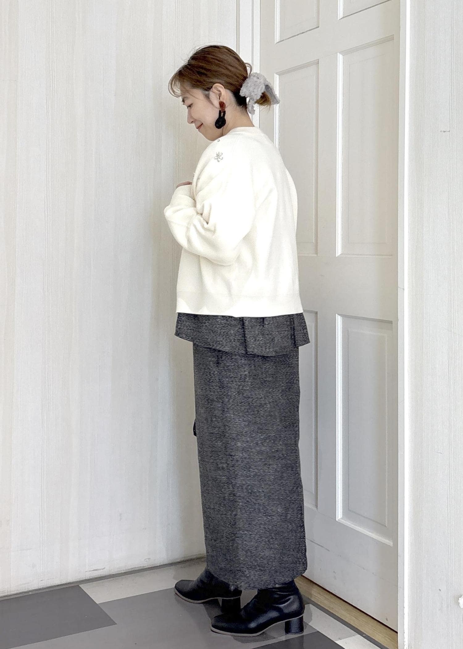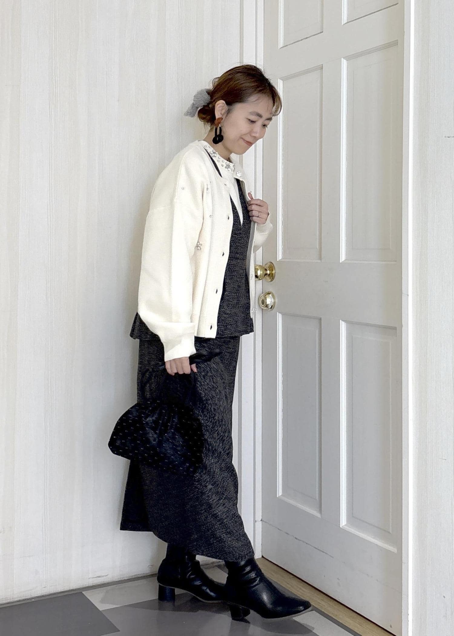 雪のようなキラキラ見えるカーディガンと、インナーも合わせたので、アンサンブルのように着てみました。