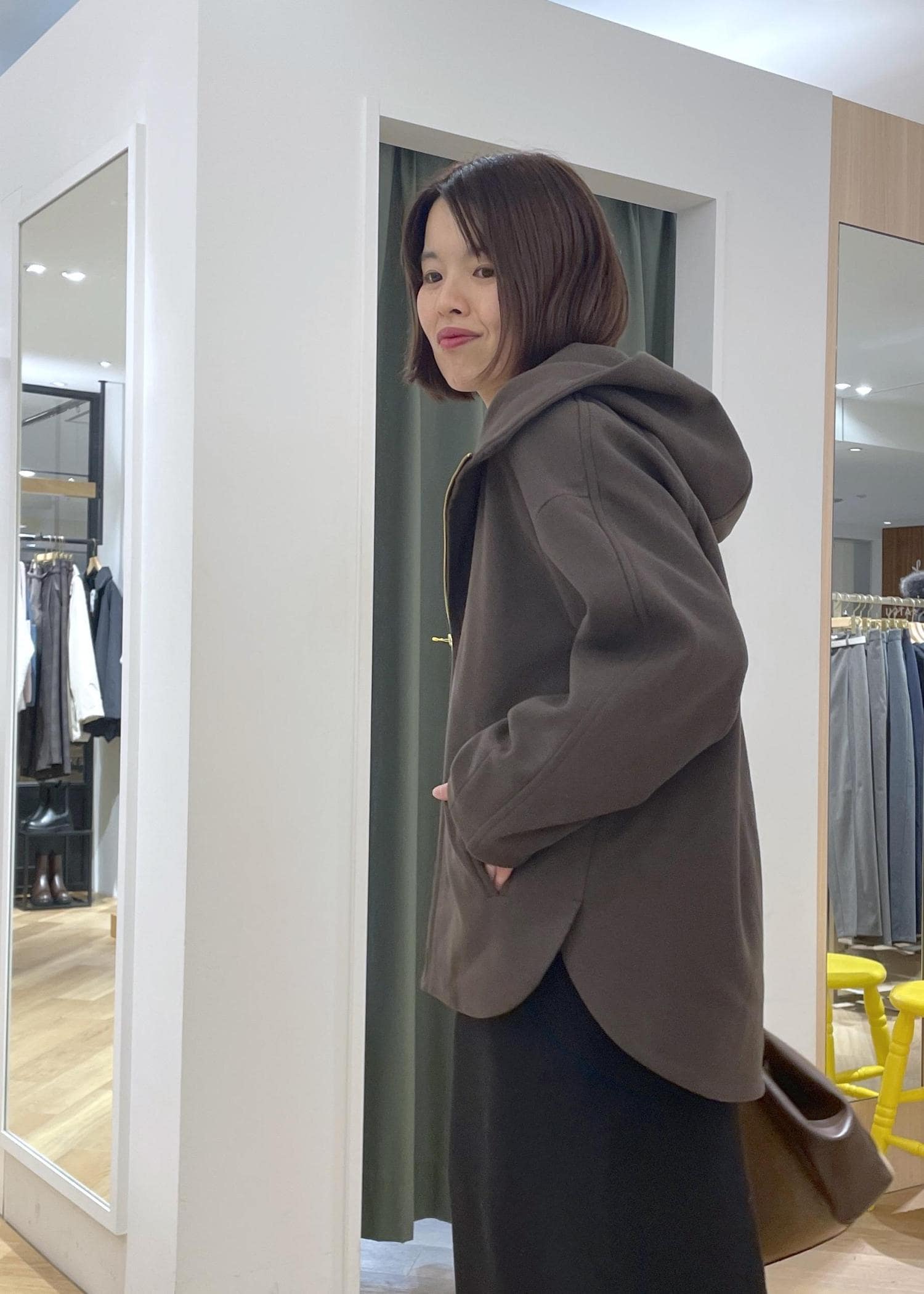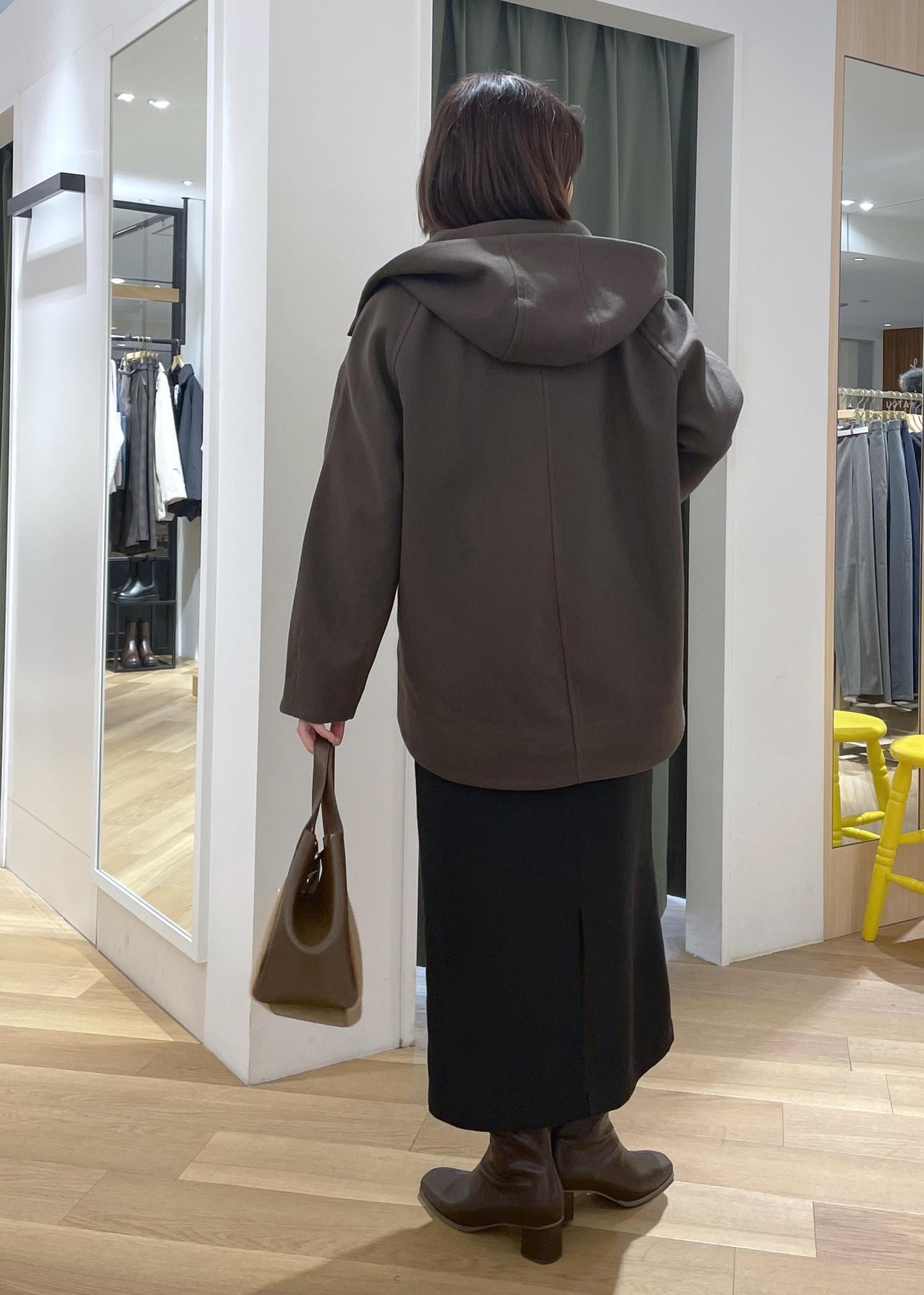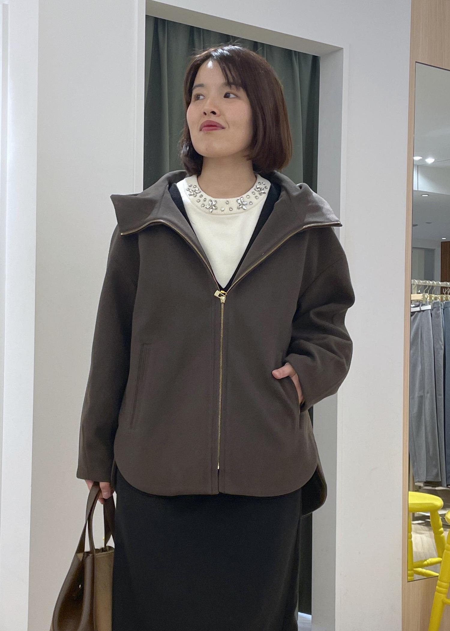 コートインスタイルがモノトーンだったので、アウターはブラウンを合わせて、シックかつ柔らかな印象でまとめています。