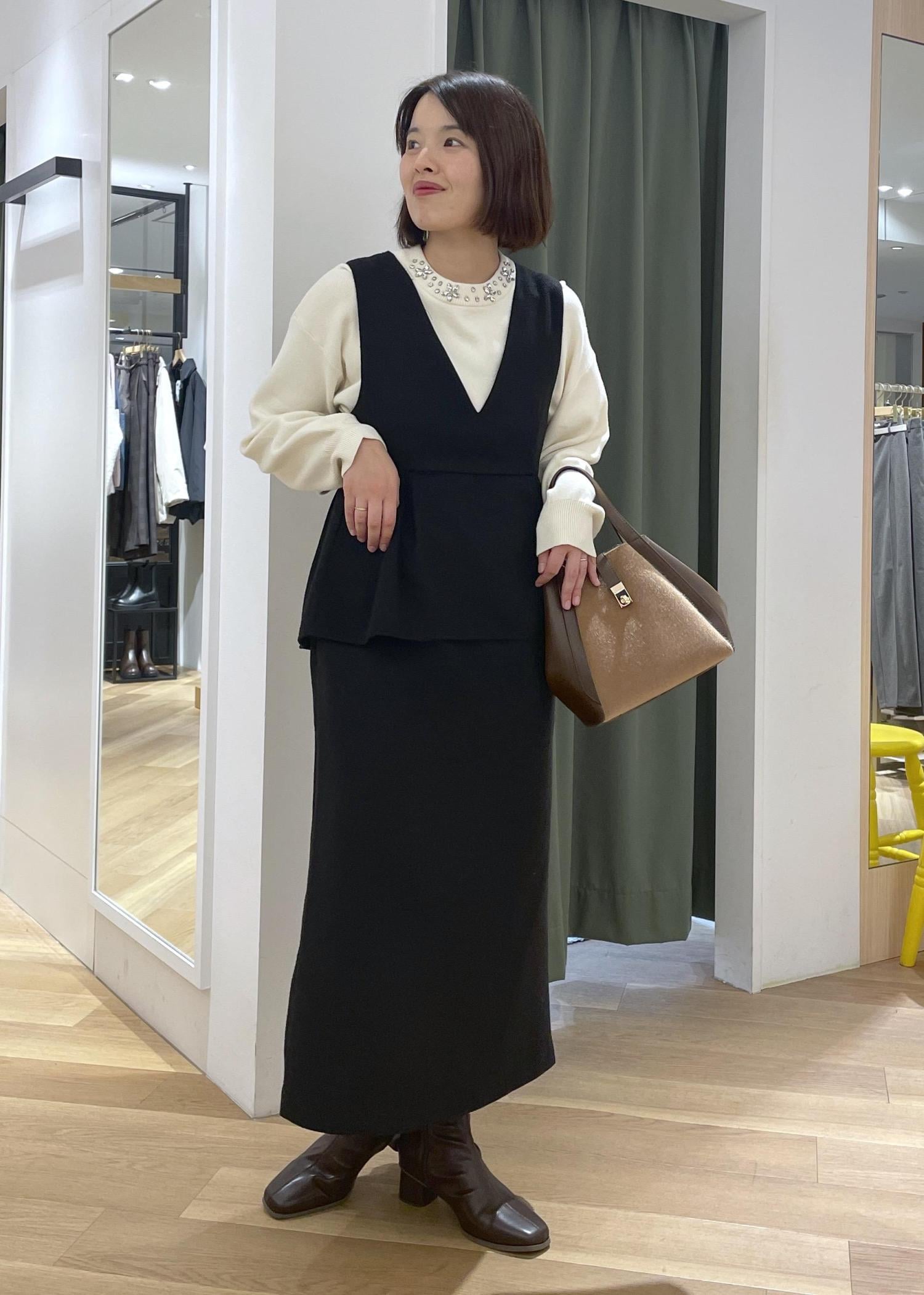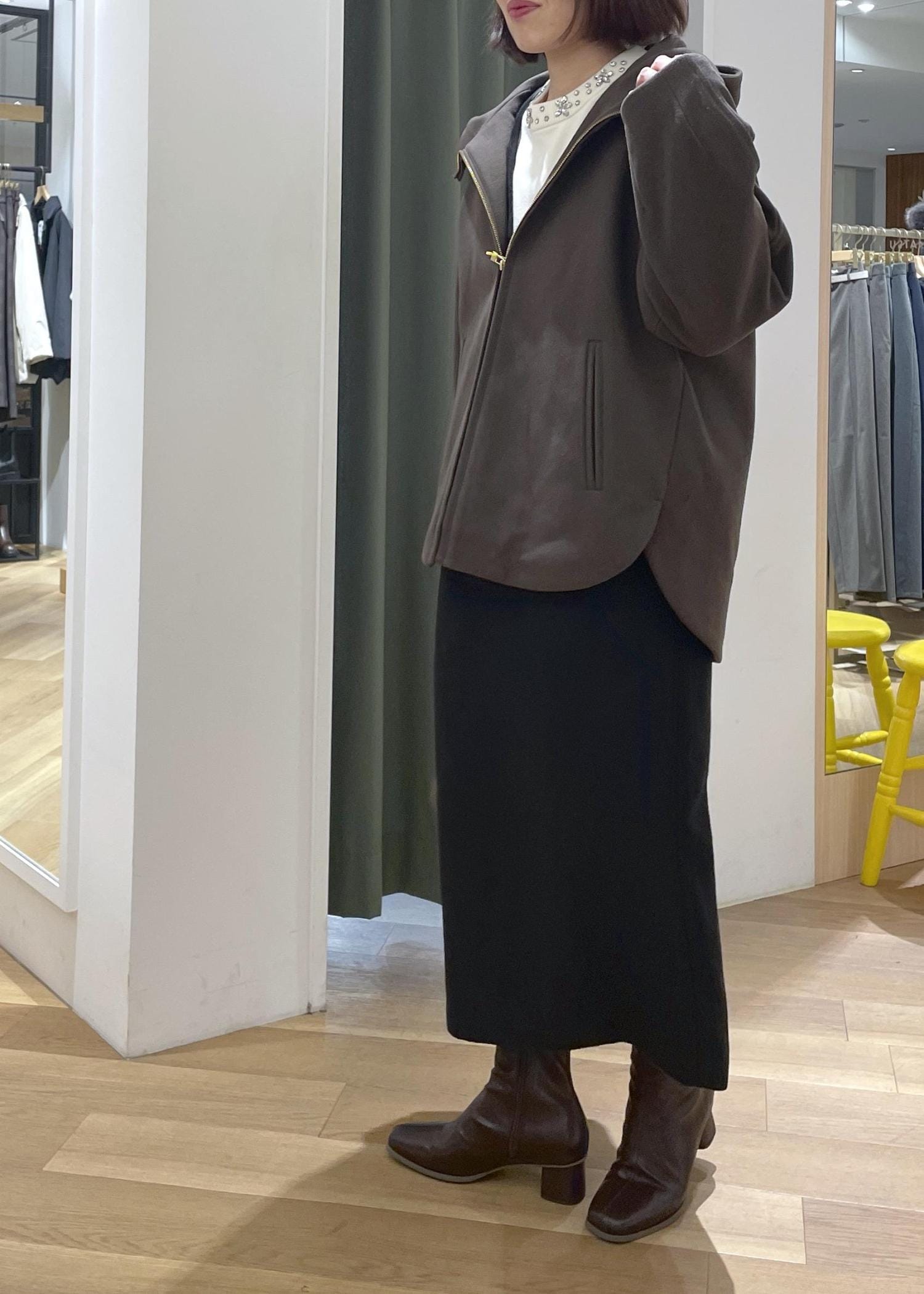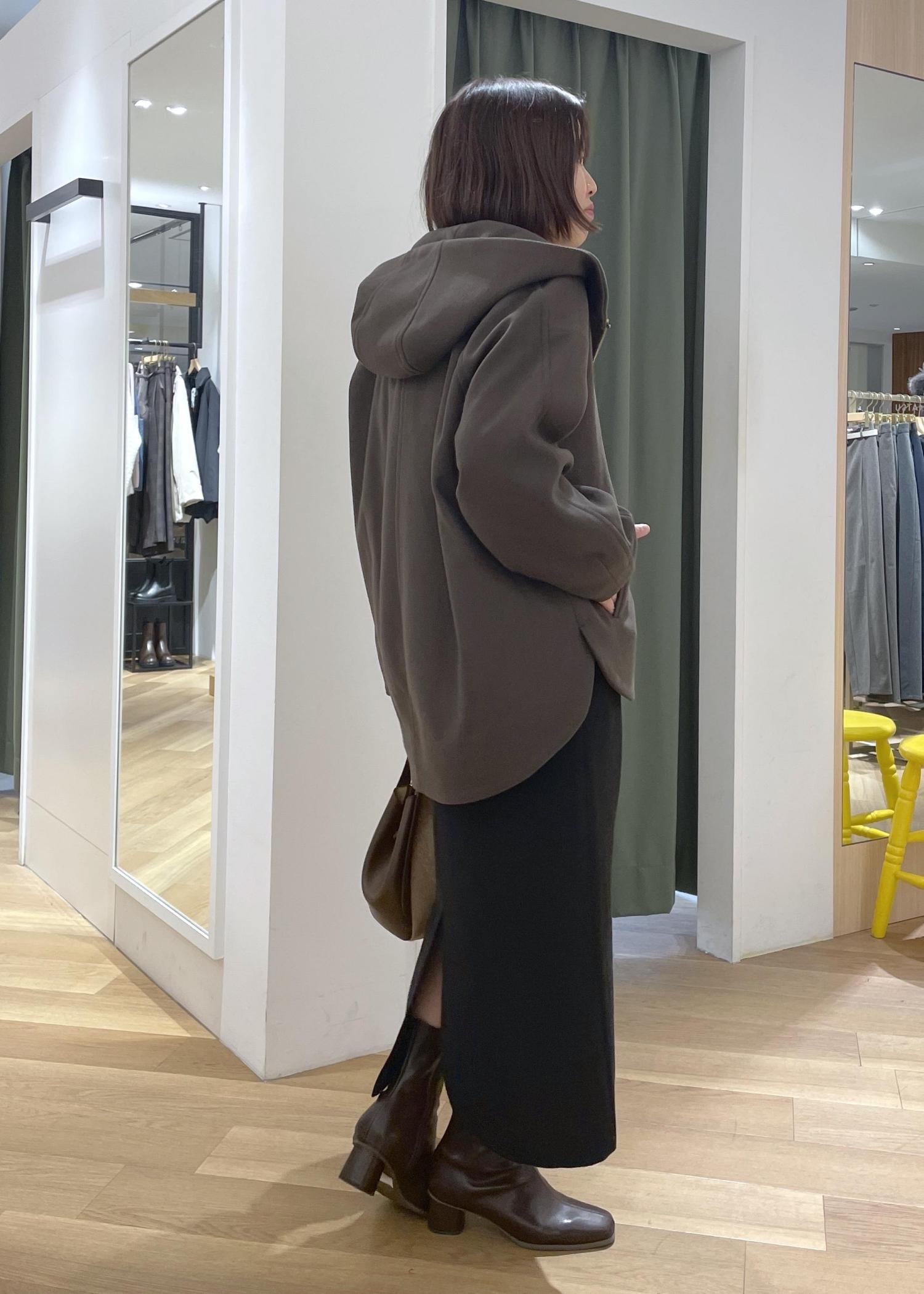 コートインスタイルがモノトーンだったので、アウターはブラウンを合わせて、シックかつ柔らかな印象でまとめています。