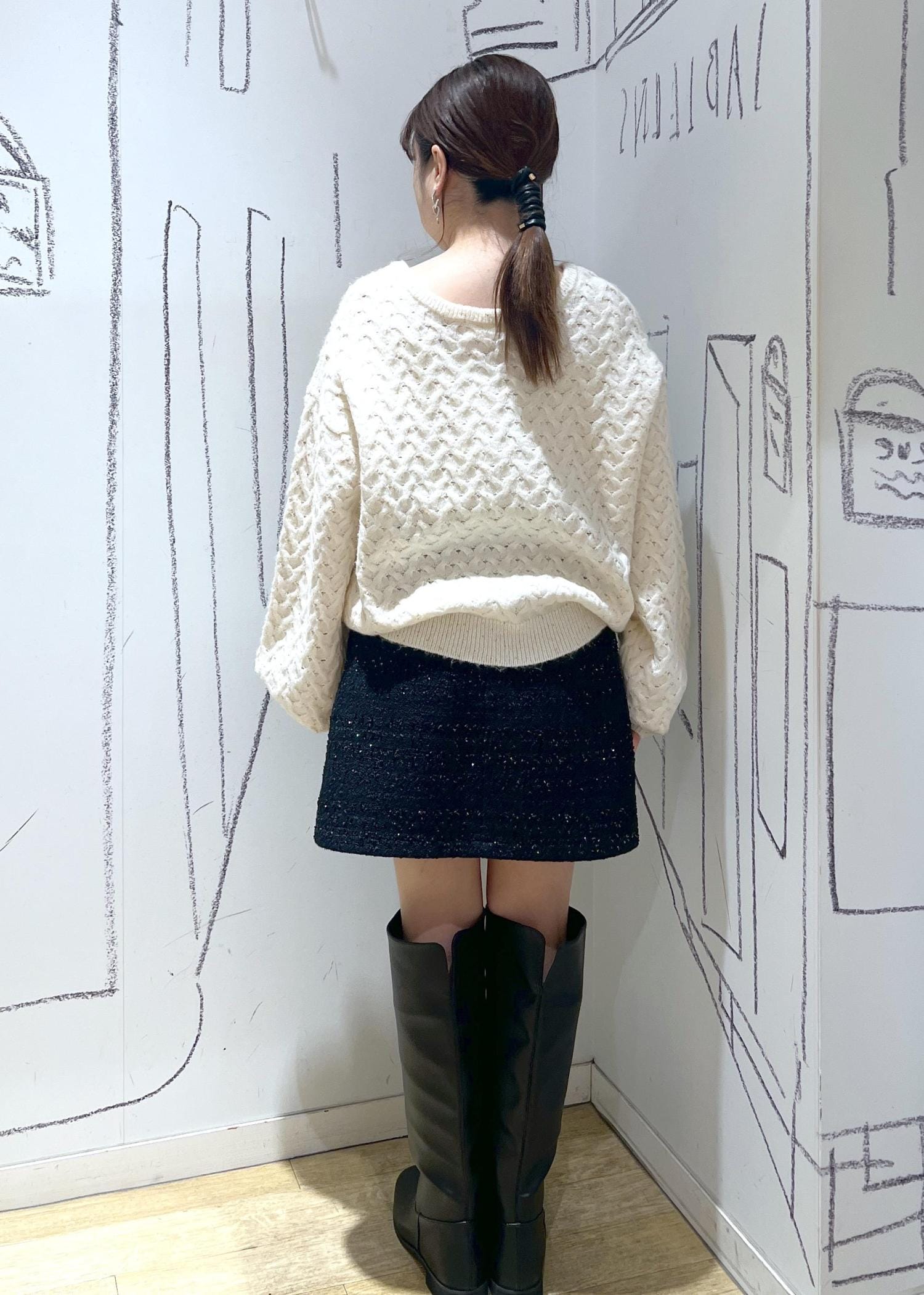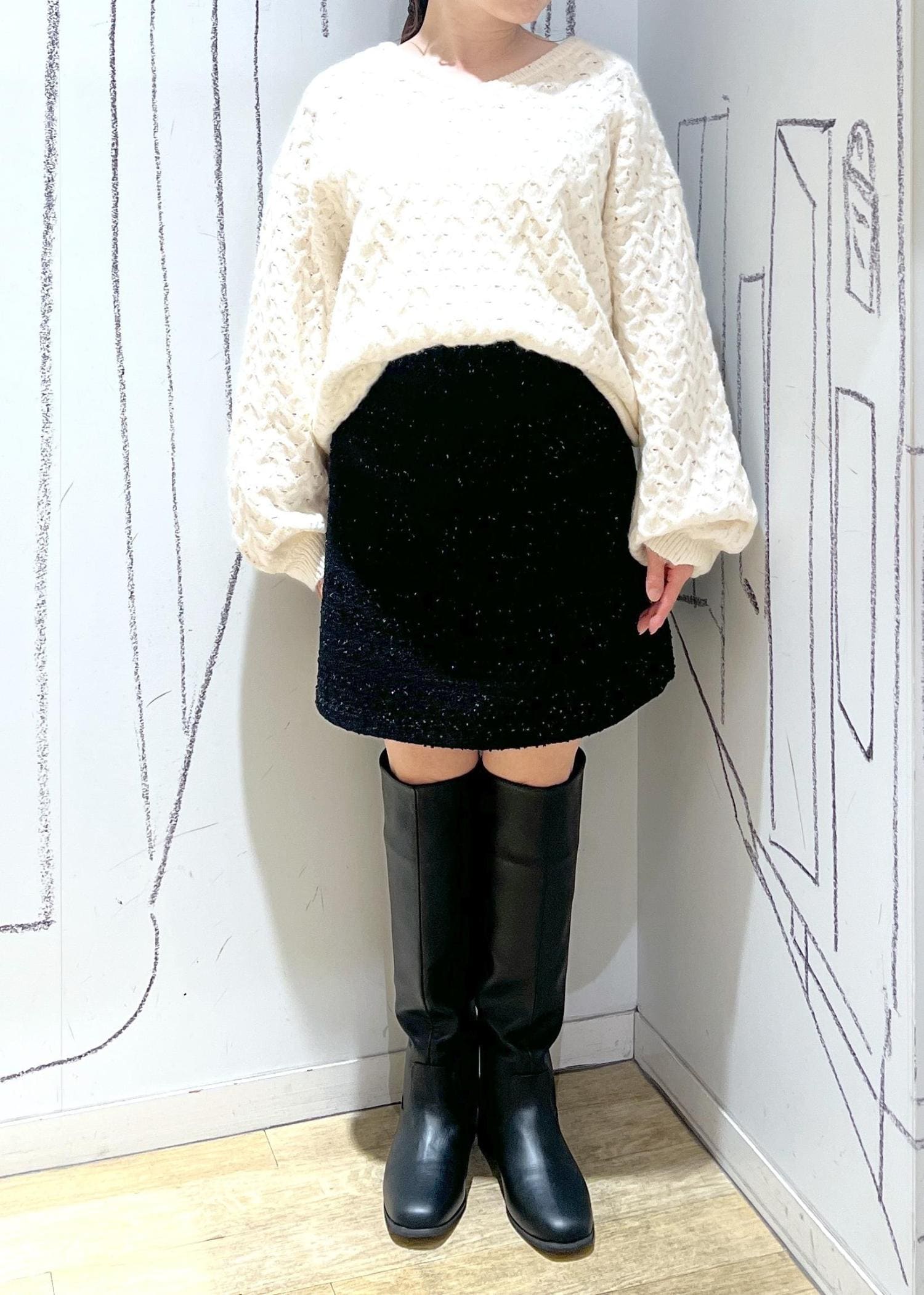 147cmで膝上丈。パンツインタイプのスカートなので安心感◎キラっと時代デザインが華やかで冬のコーディネートを彩ります。シンプルなのでカラーニットとの相性もいいですね!