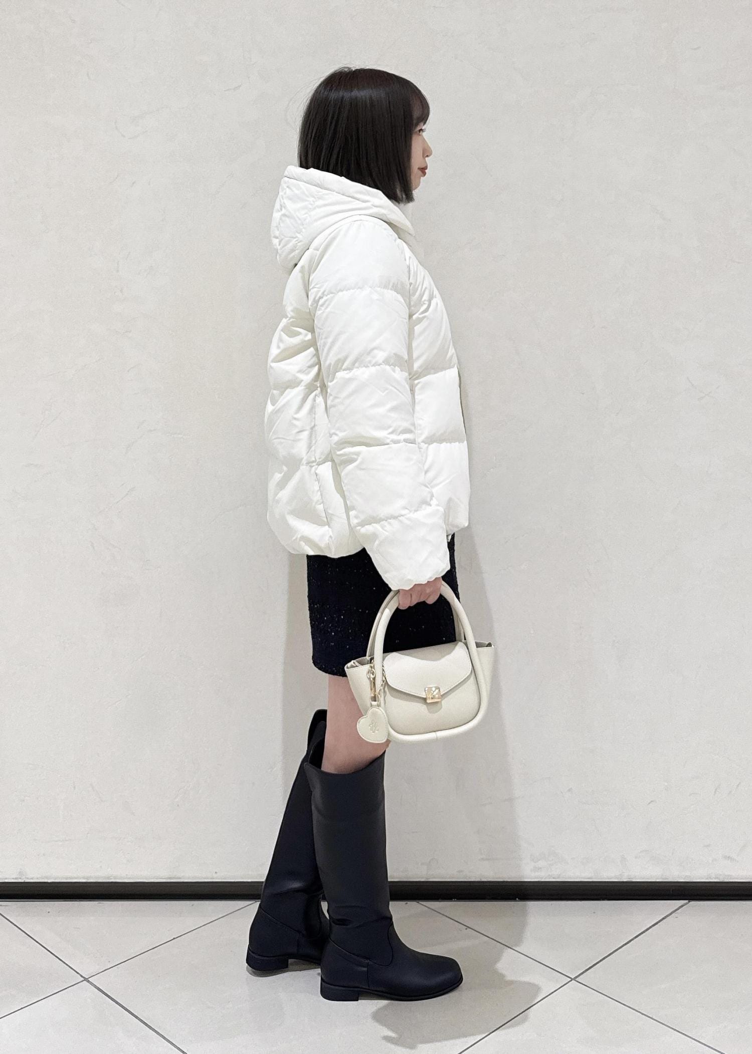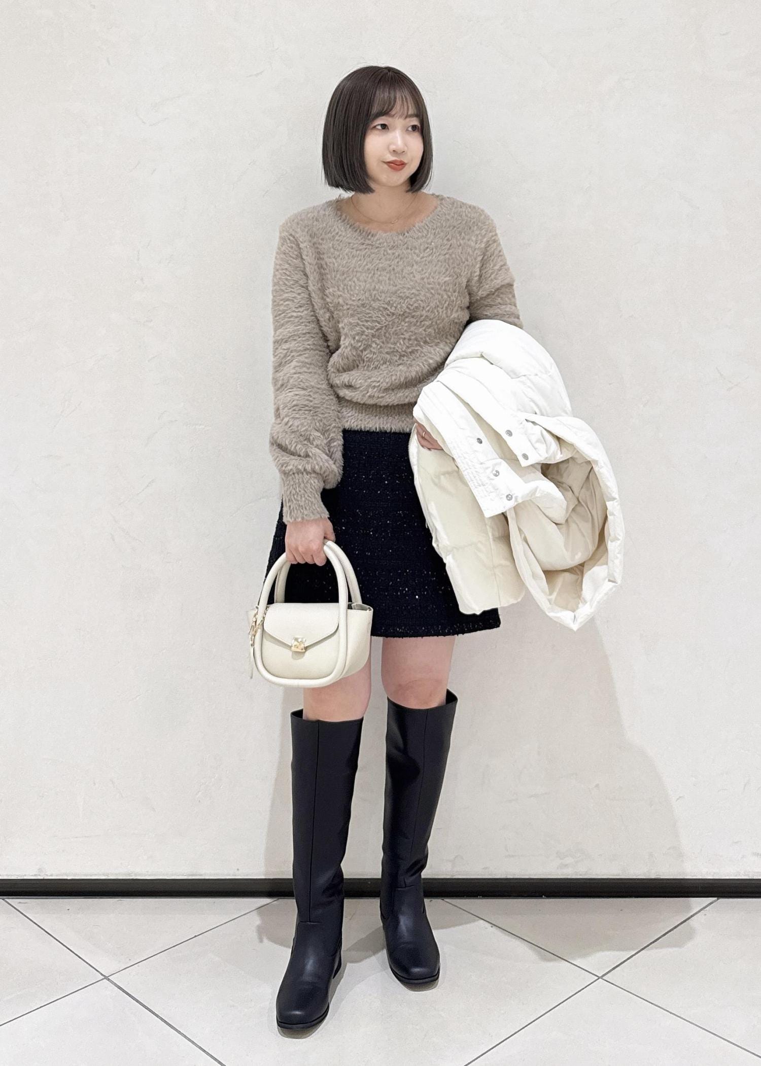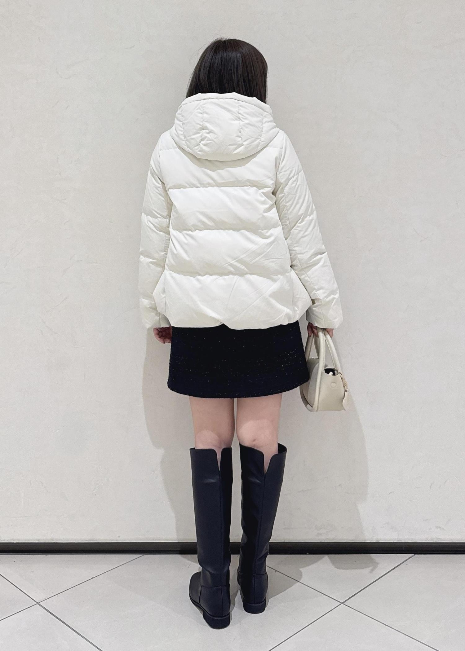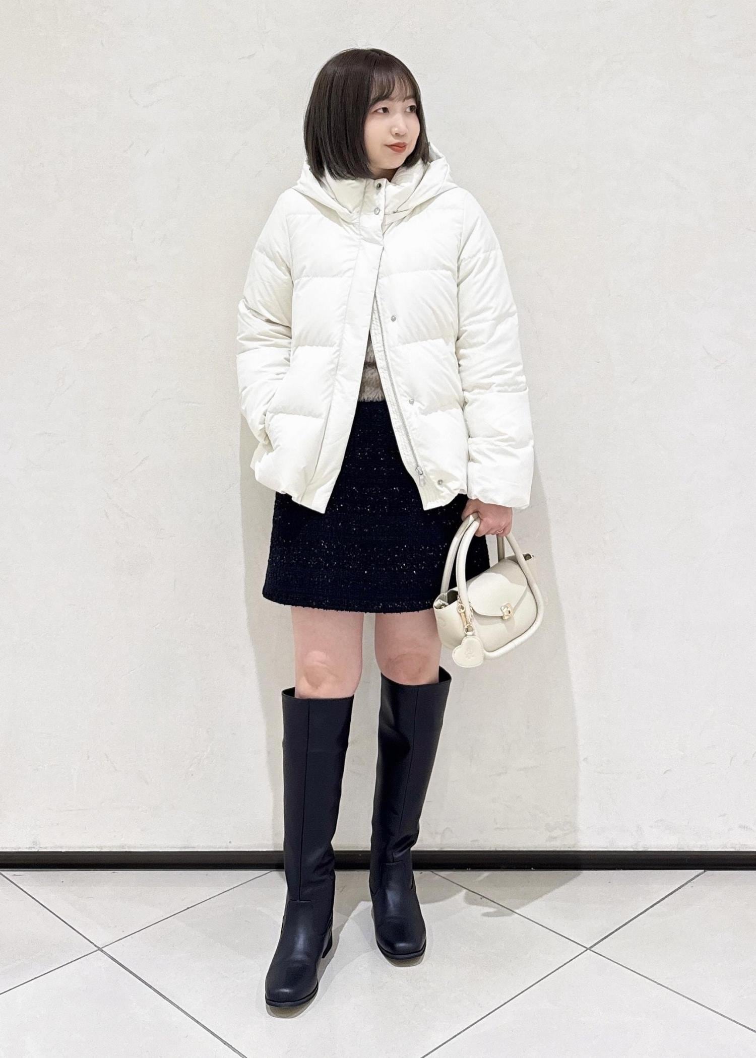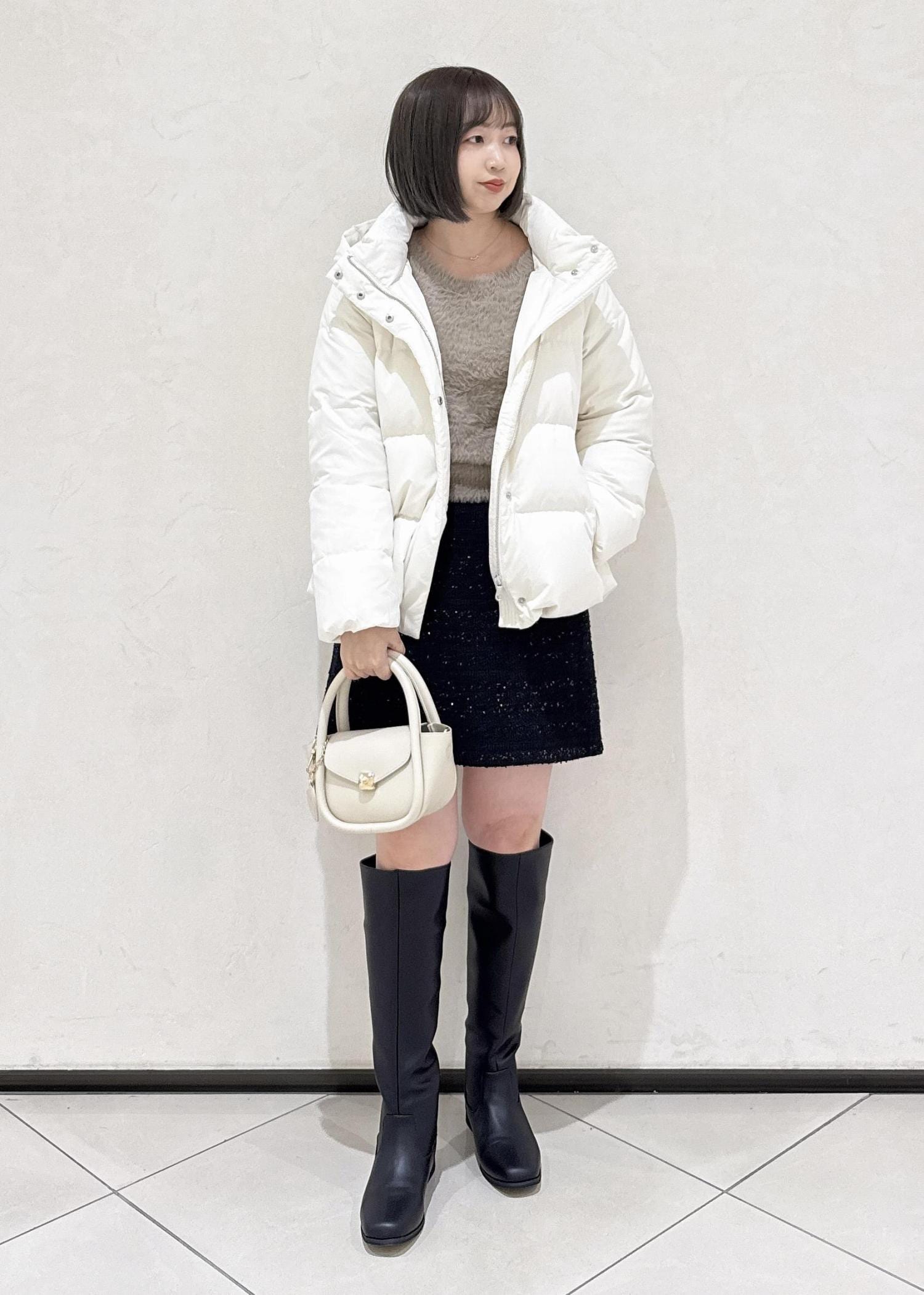 白のダウンにフェザーのトップスにラメの入ったミニスカートを合わせて、ザ!冬のスタイリングです◎