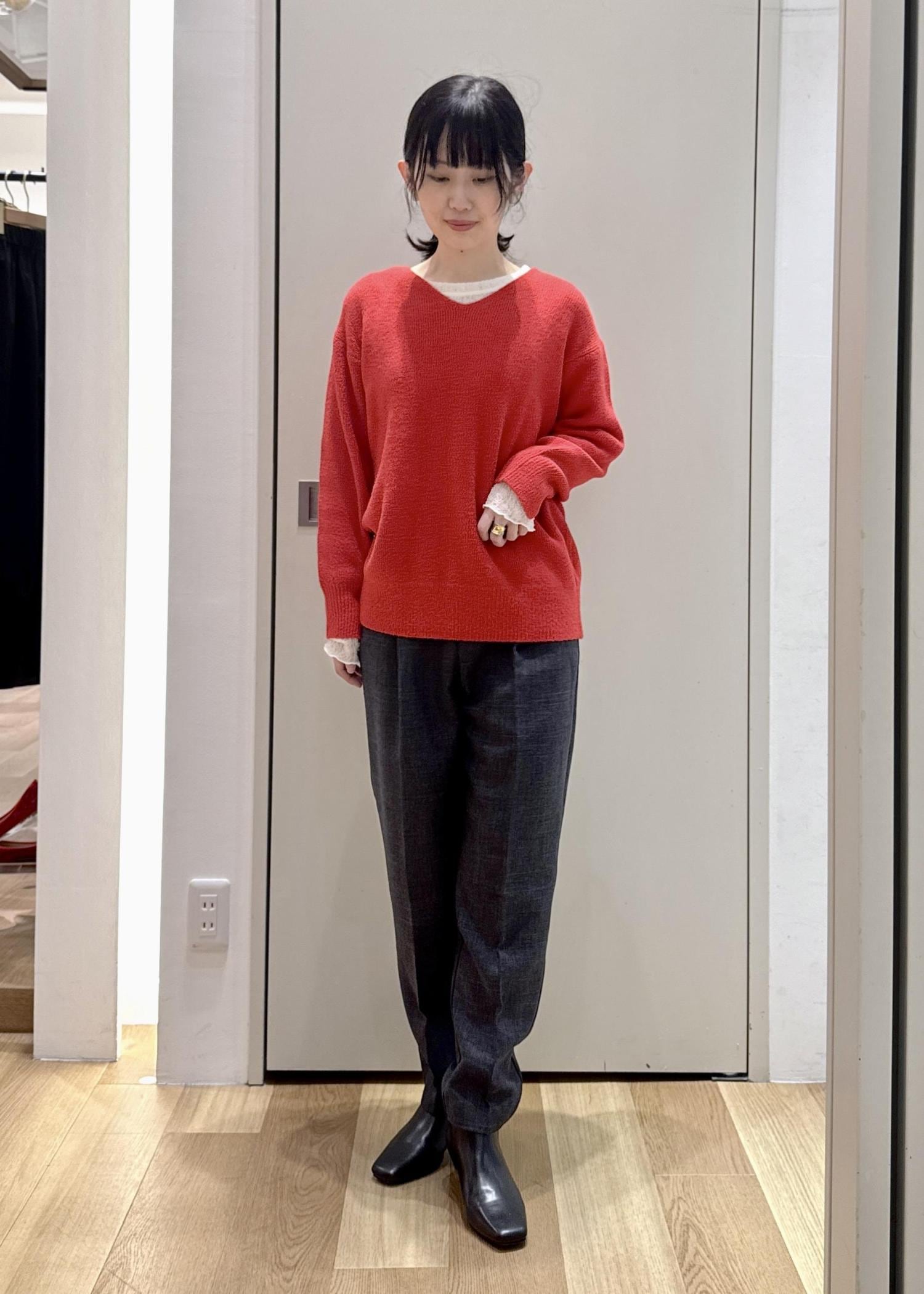 中は赤のVネックニットにレースカットソーをレイヤードして、コートを脱いでも気を抜かないように仕上げました。