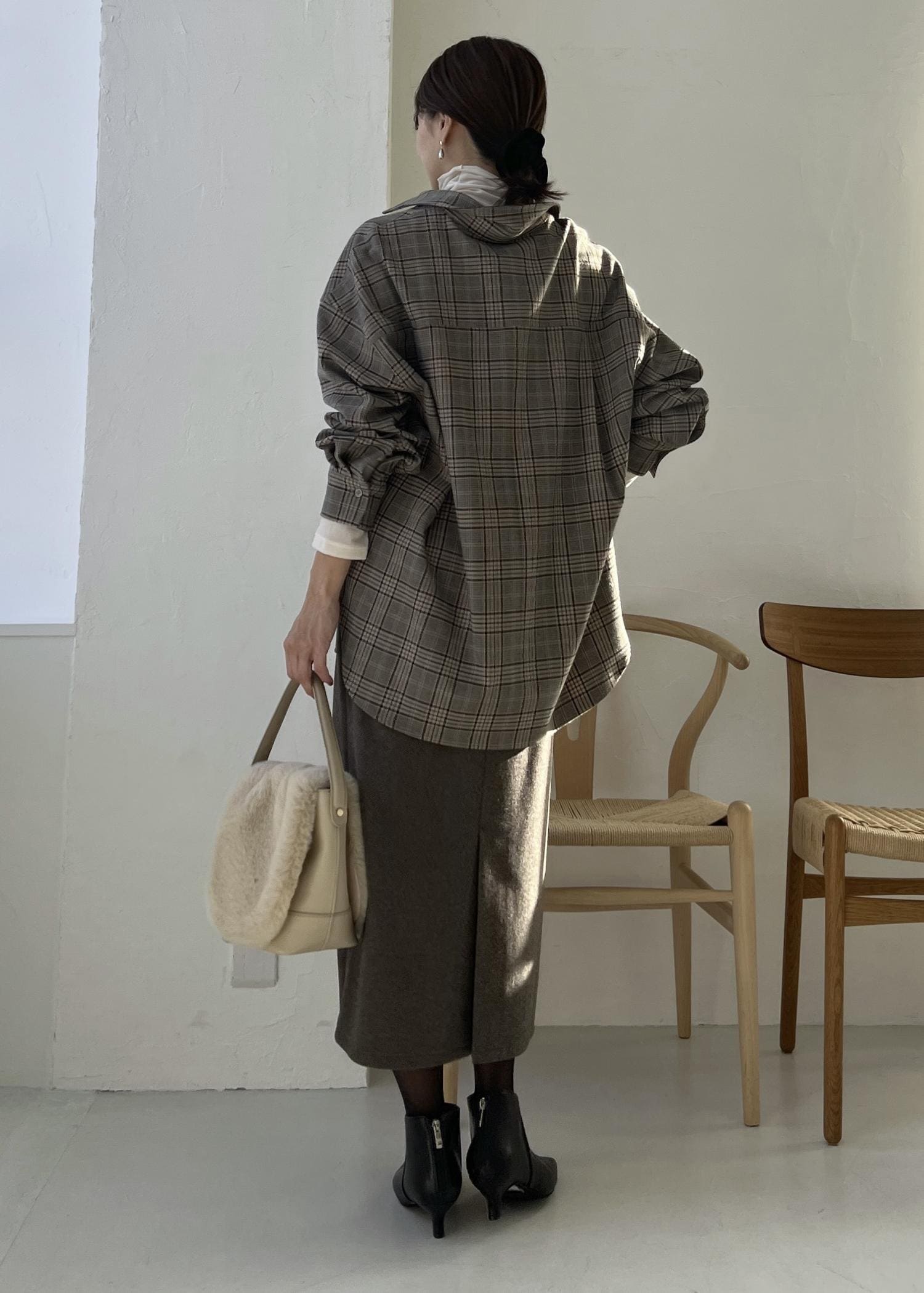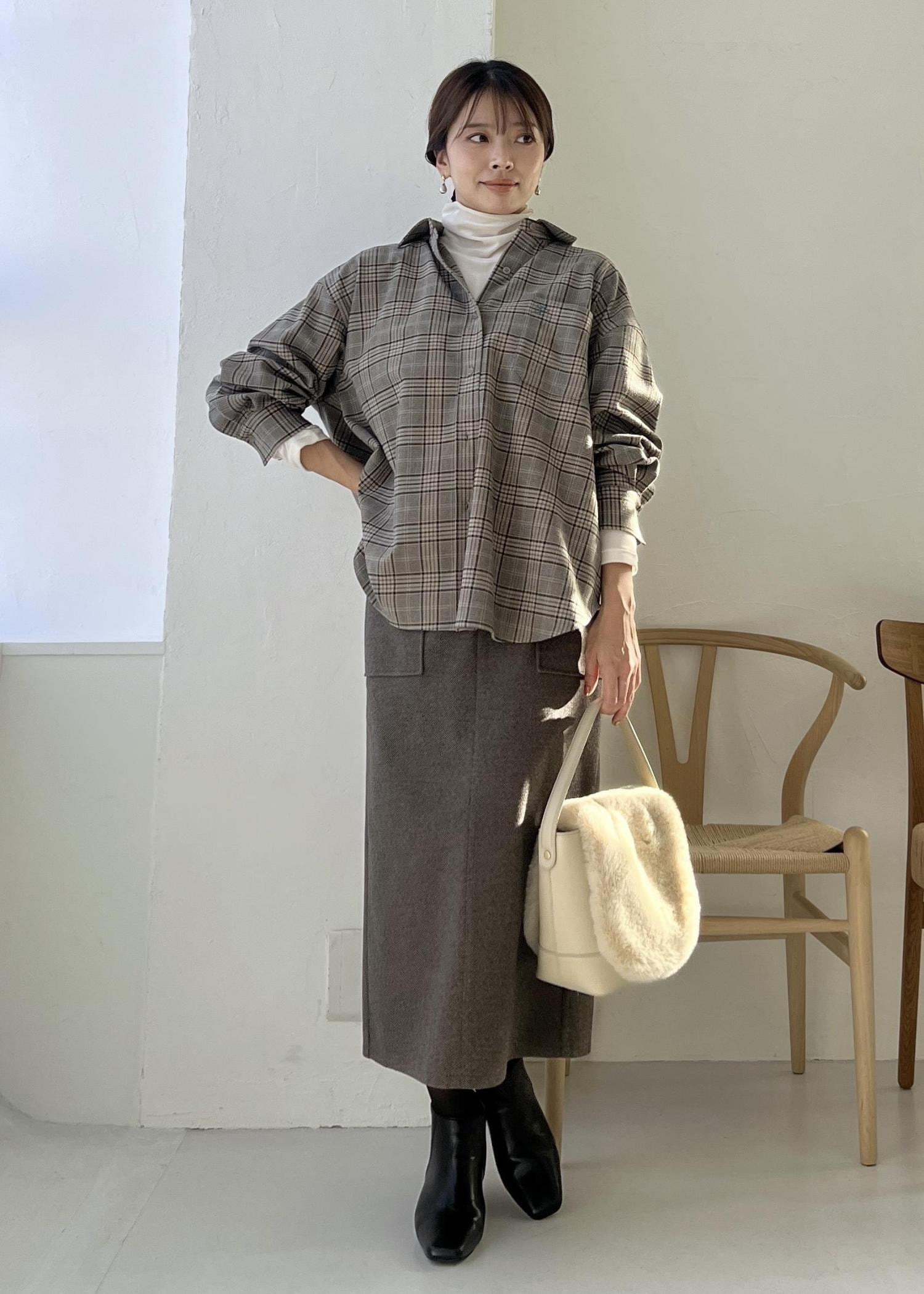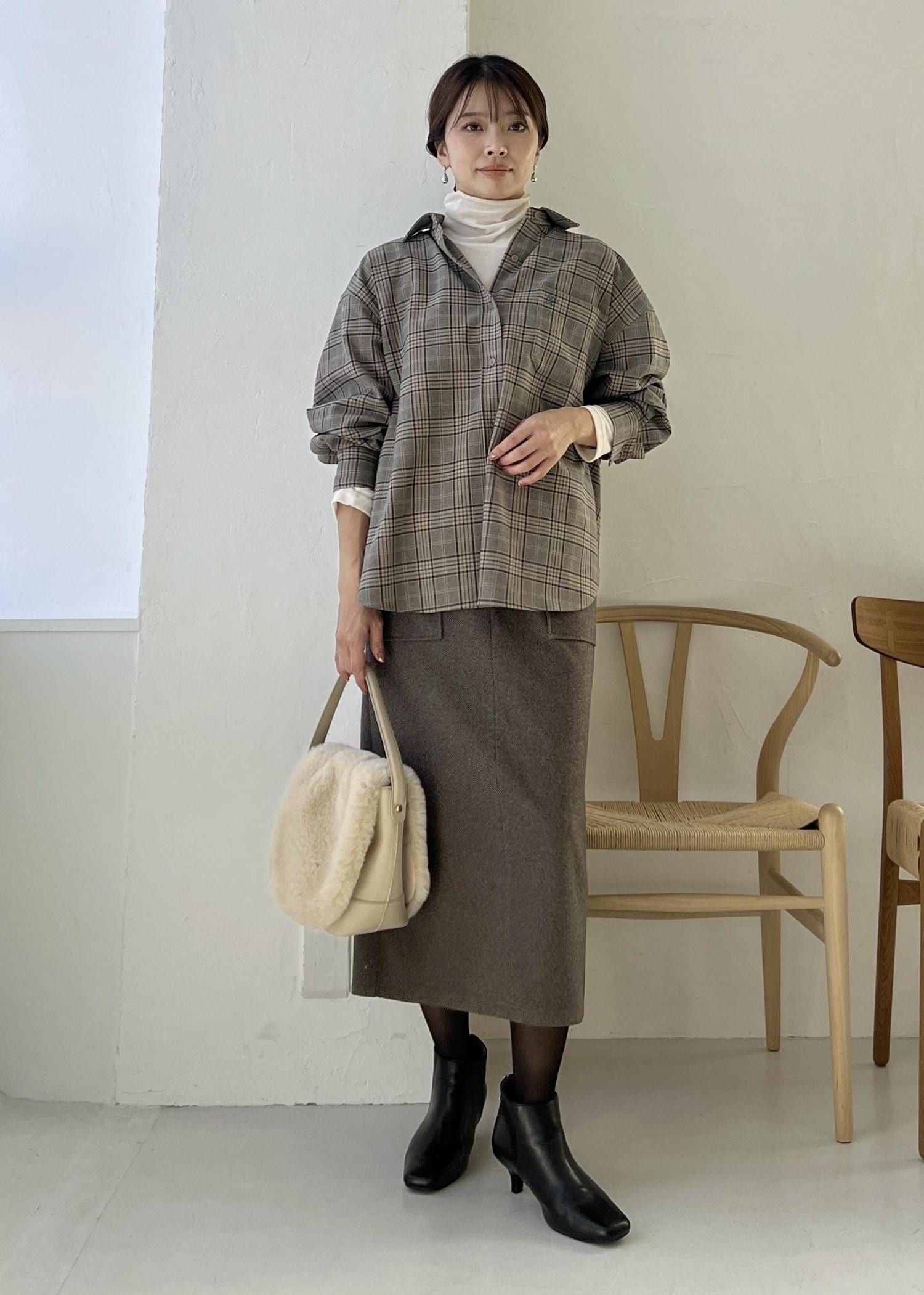 ゆるっと羽織りやすいチェックシャツは、ハイネックのトップスをインしてレイヤードコーデに。