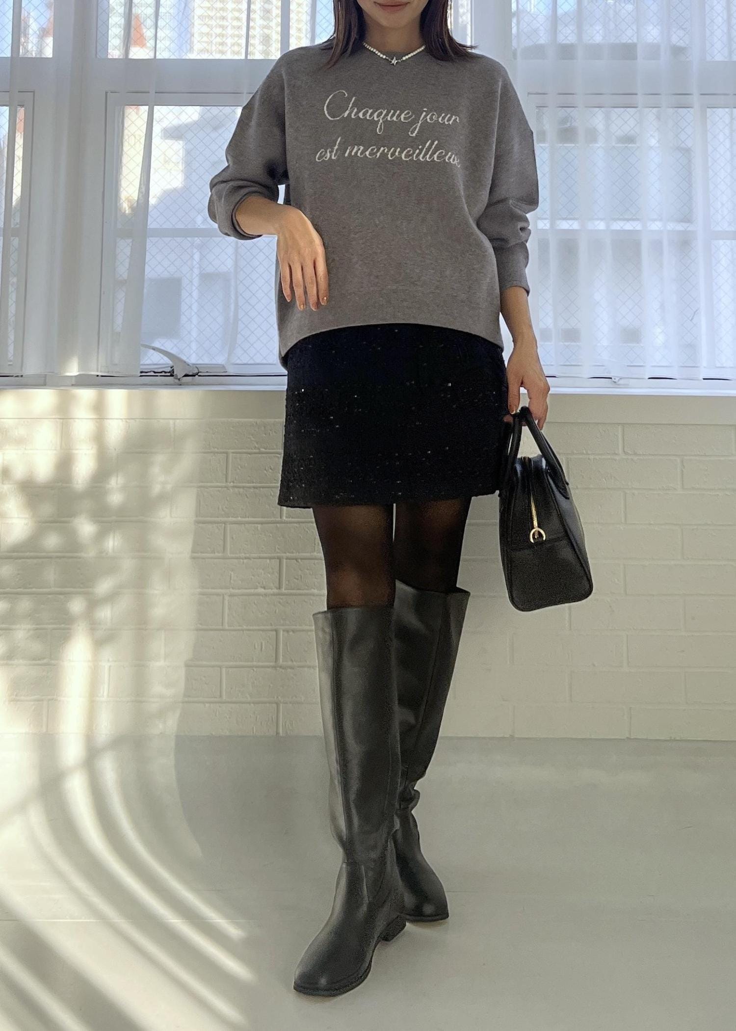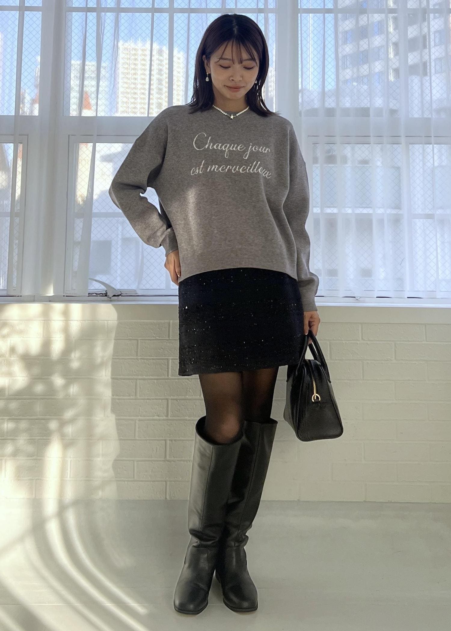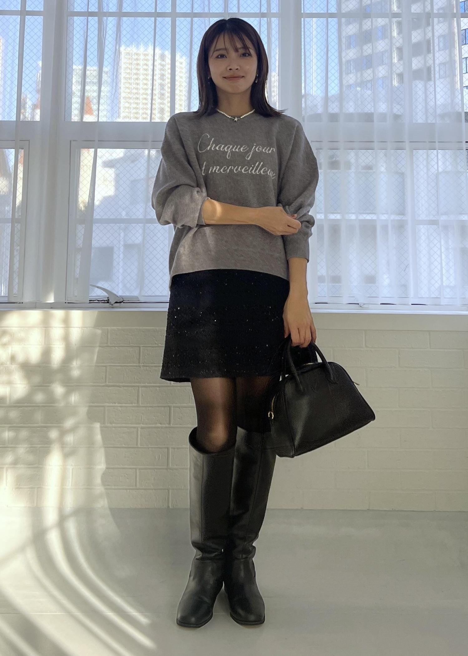 トレンド感のある膝上丈のスカートは、ラメツイードの生地で華やかさのある素材感。
