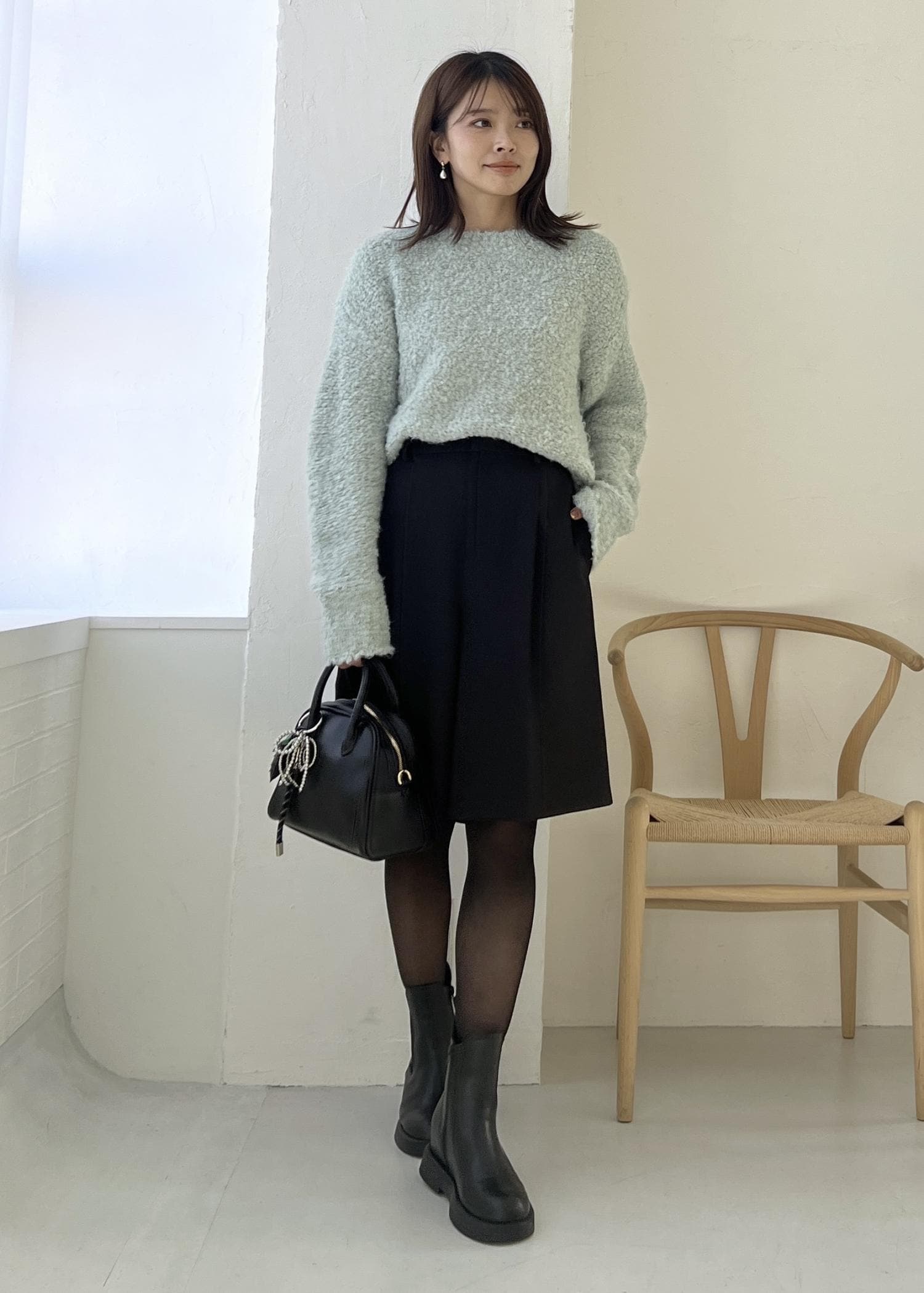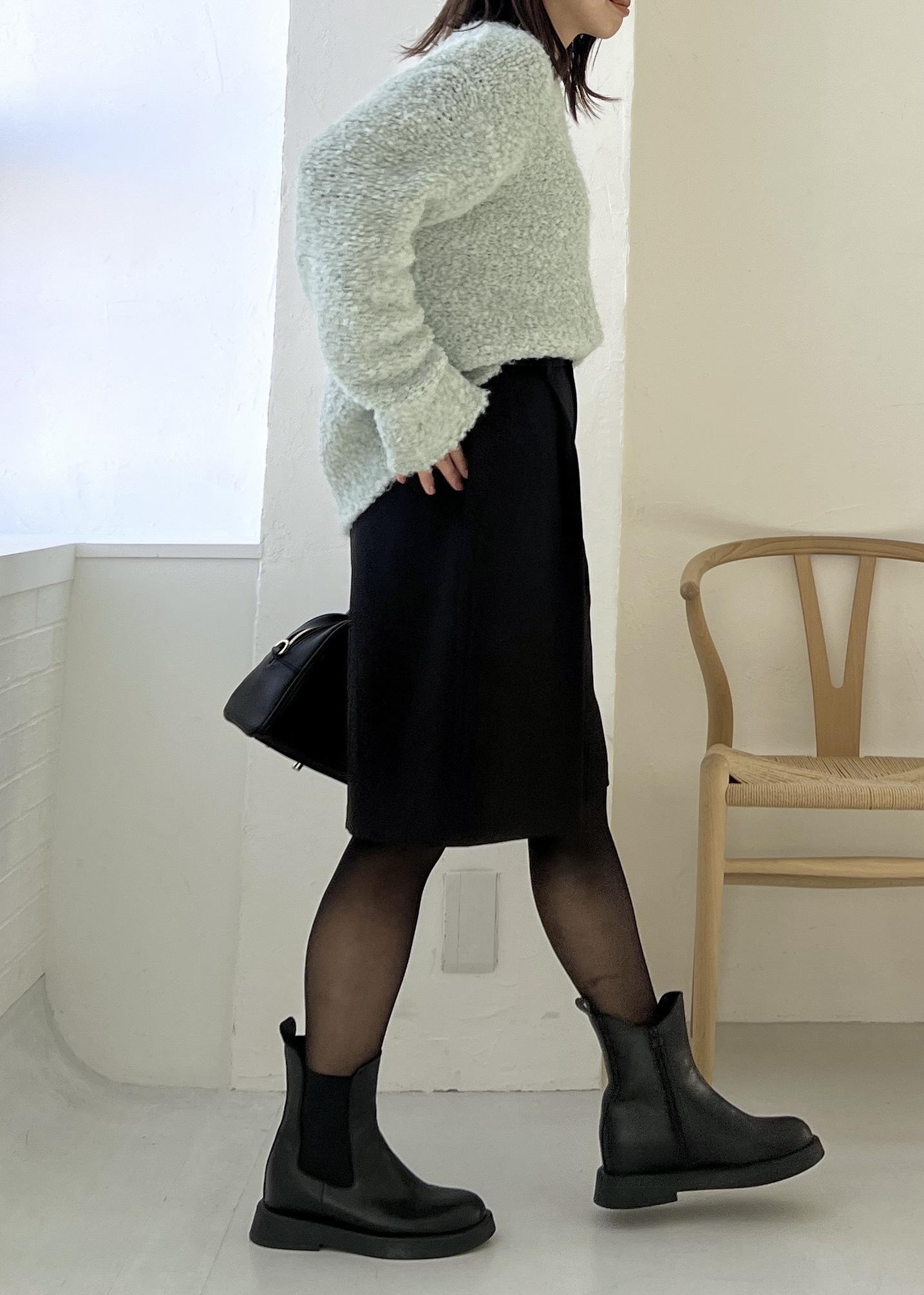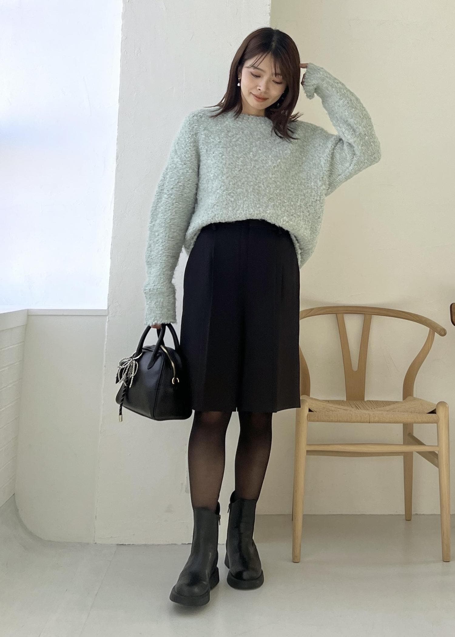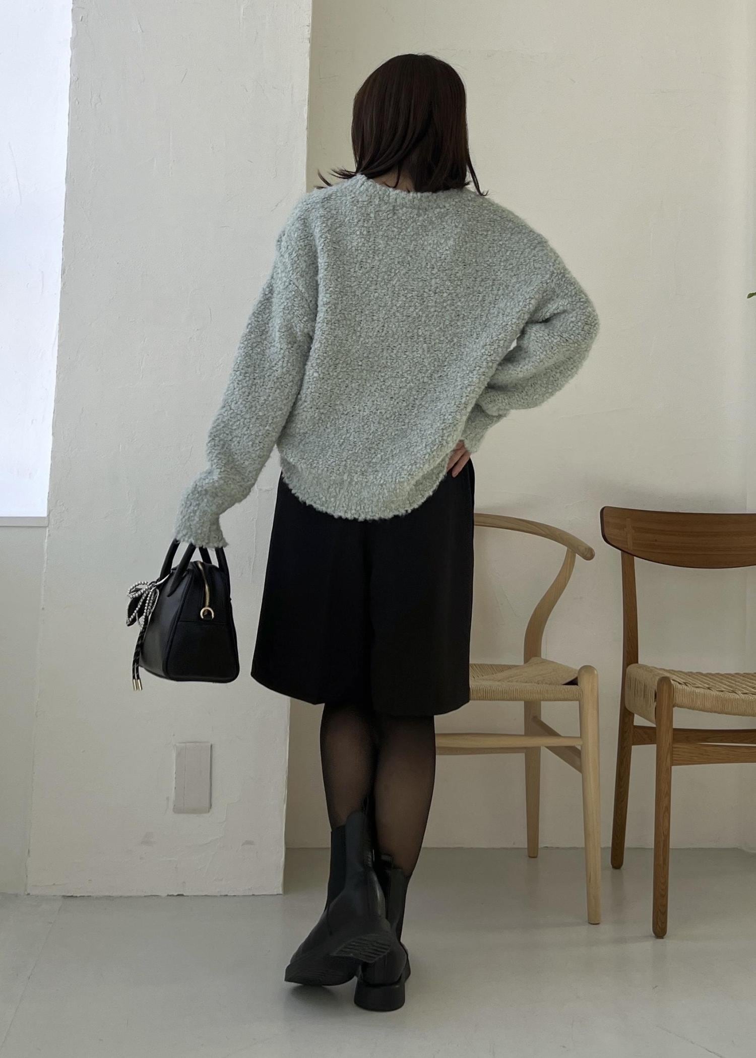 ふわふわした肌触りのブークレーニットは、柔らかいグリーンで明るい雰囲気に。
