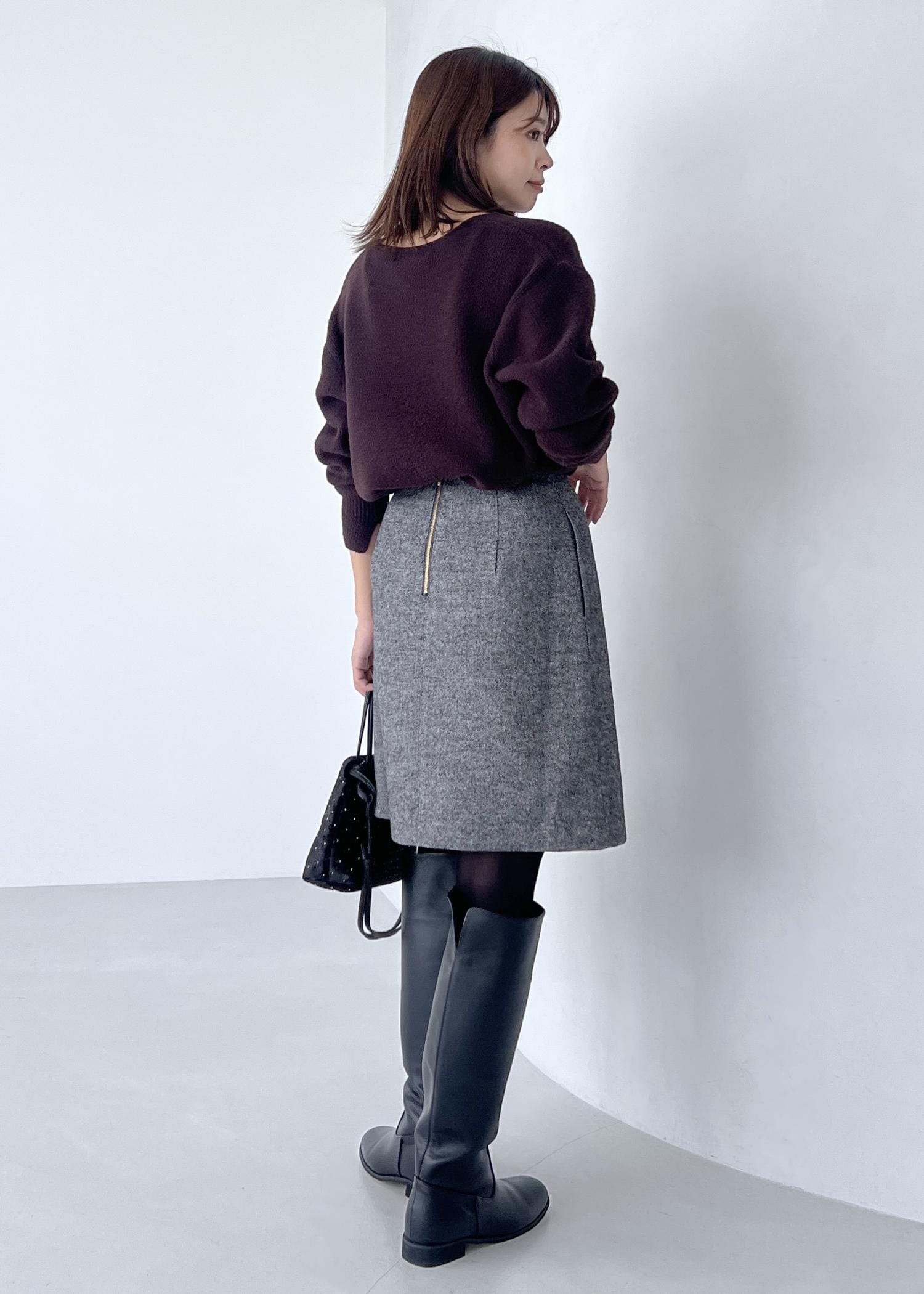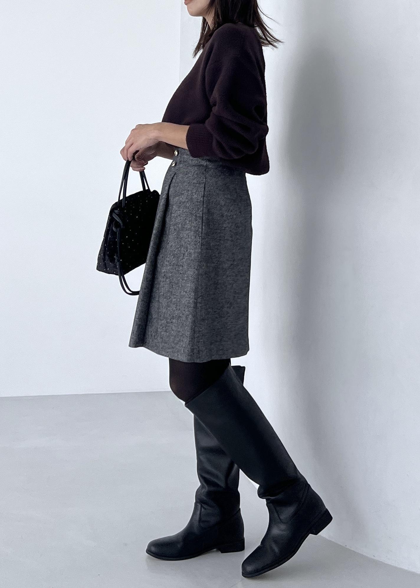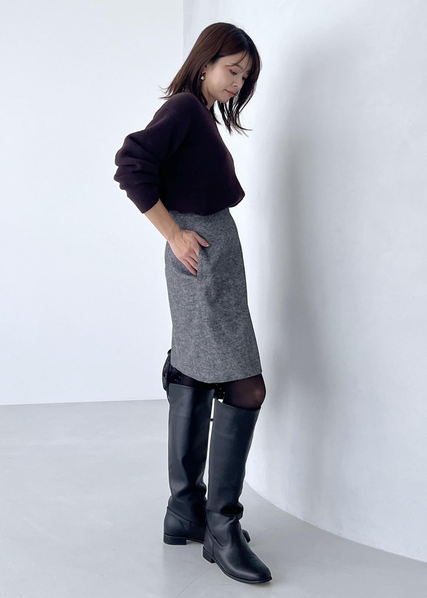膝丈スカートにはロングブーツを合わせて、より今年らしいスタイリングにしました。