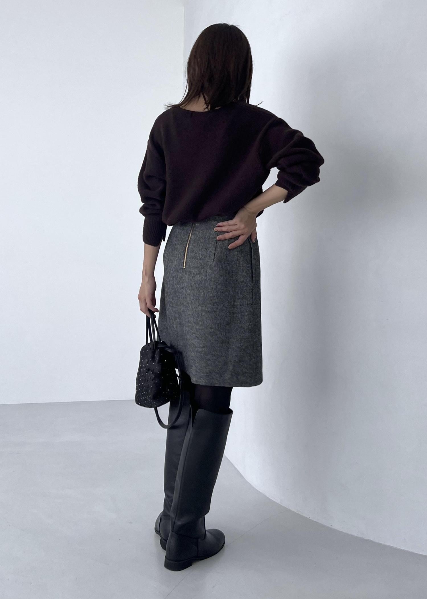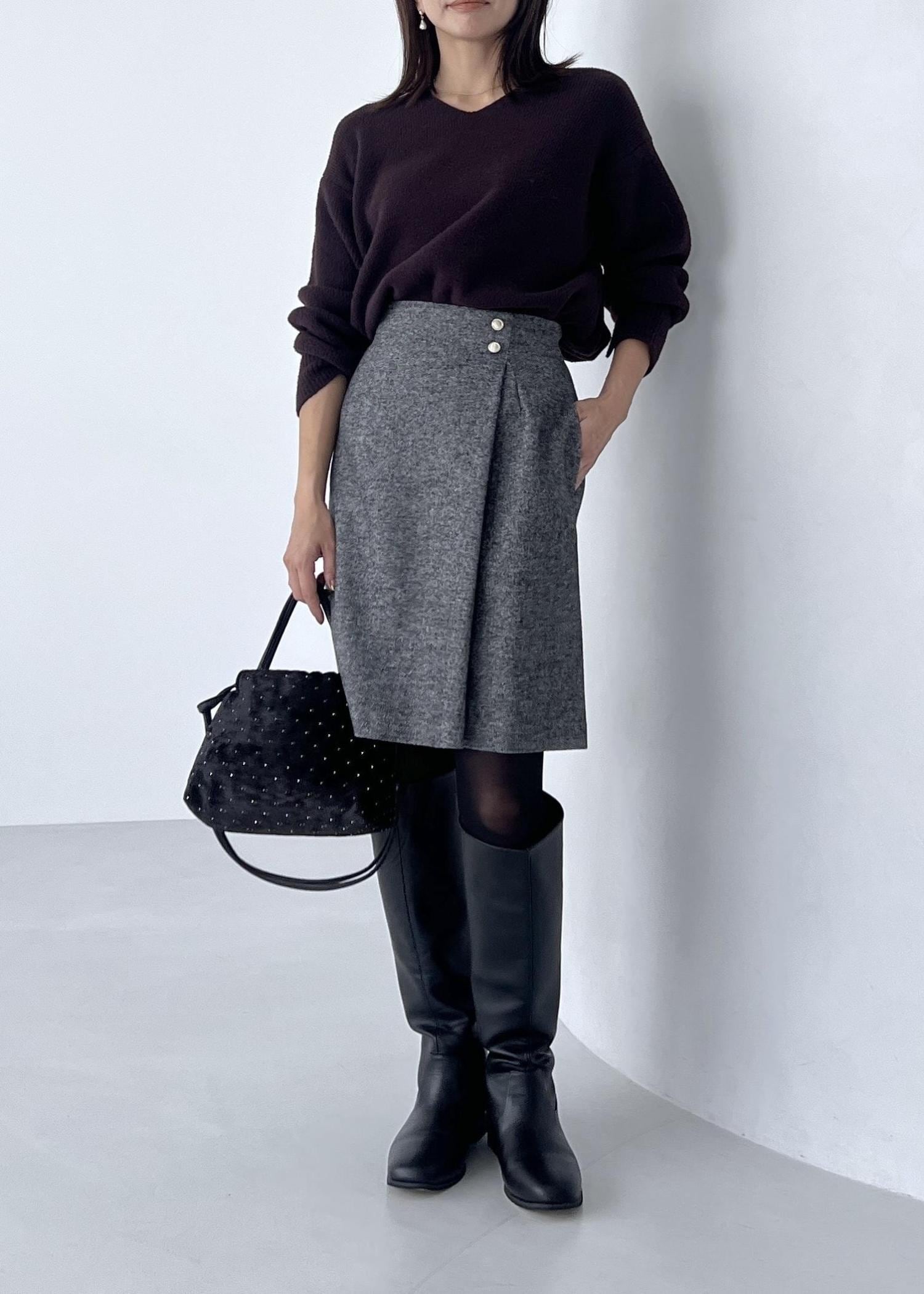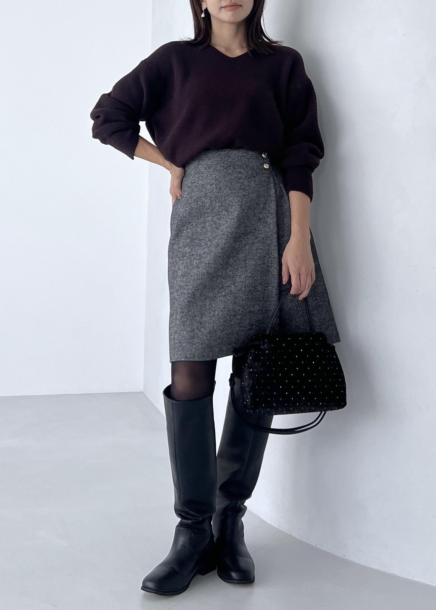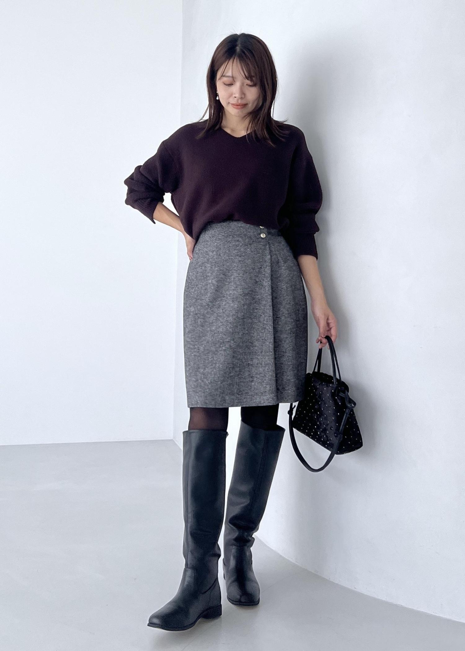 ふわふわした柔らかいニットに、ラップ風デザインのスカートを合わせて大人の冬コーデに。