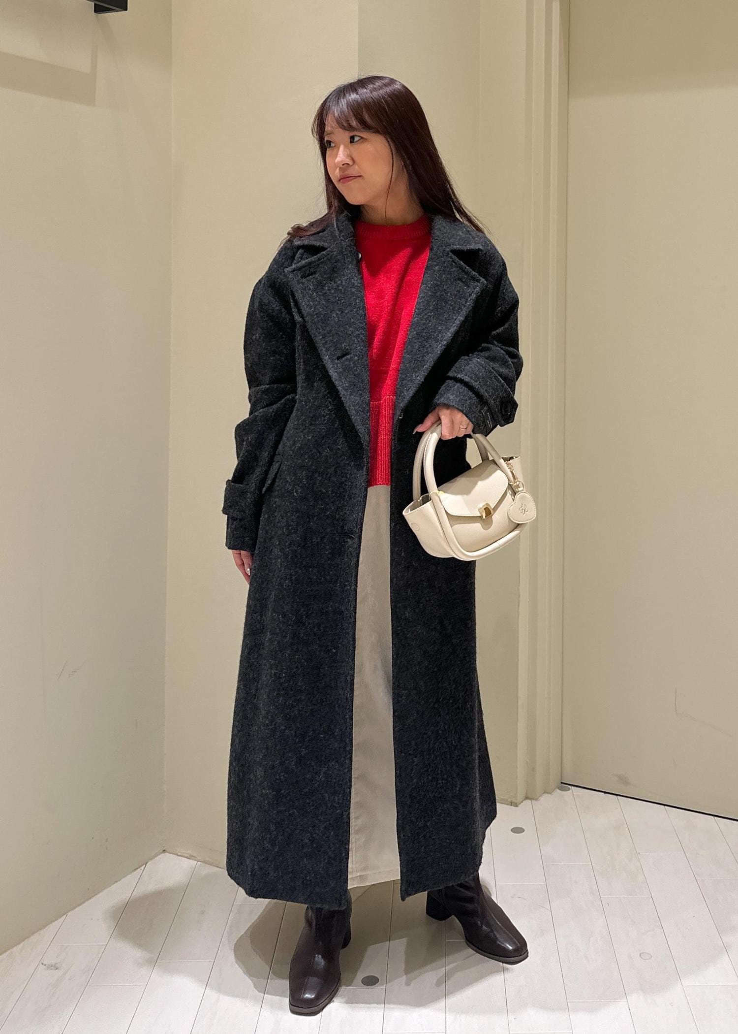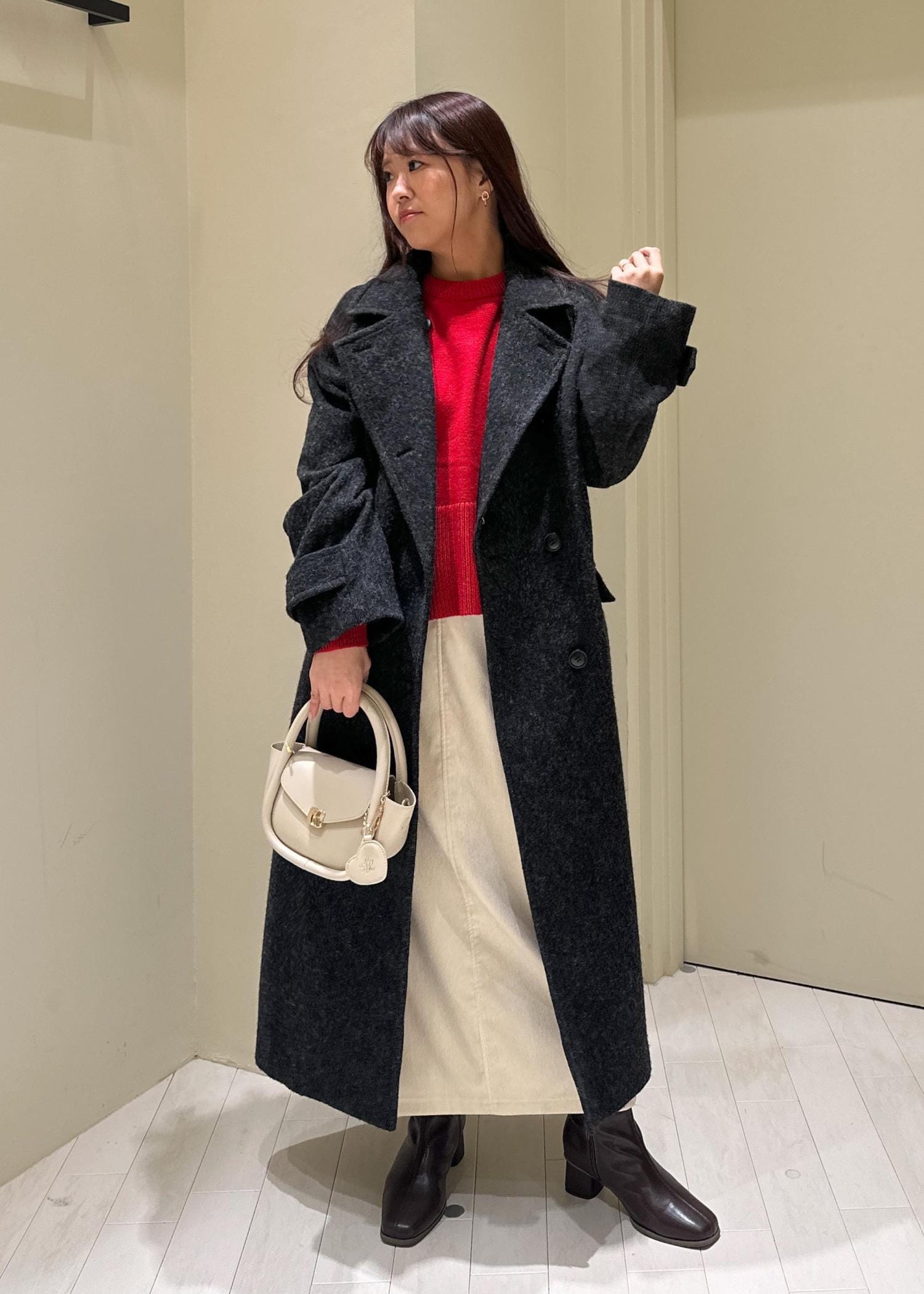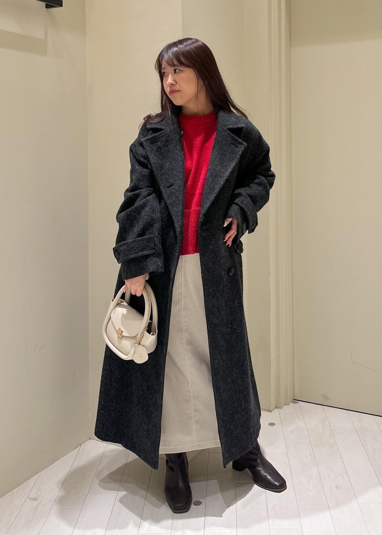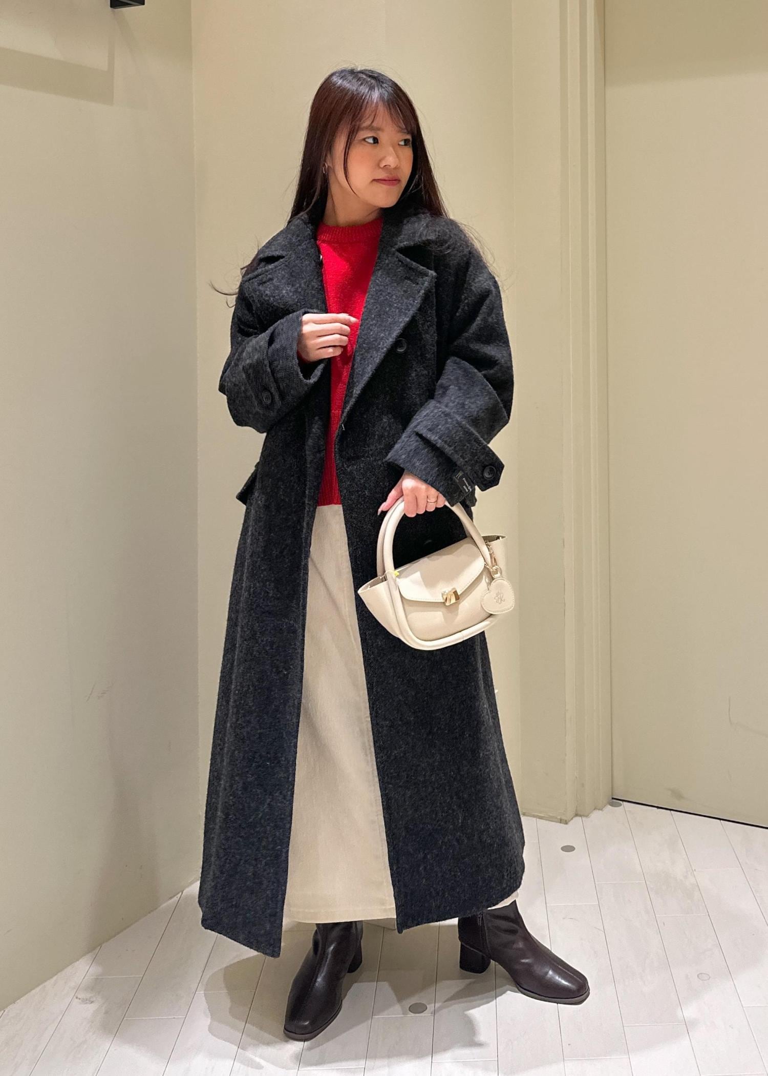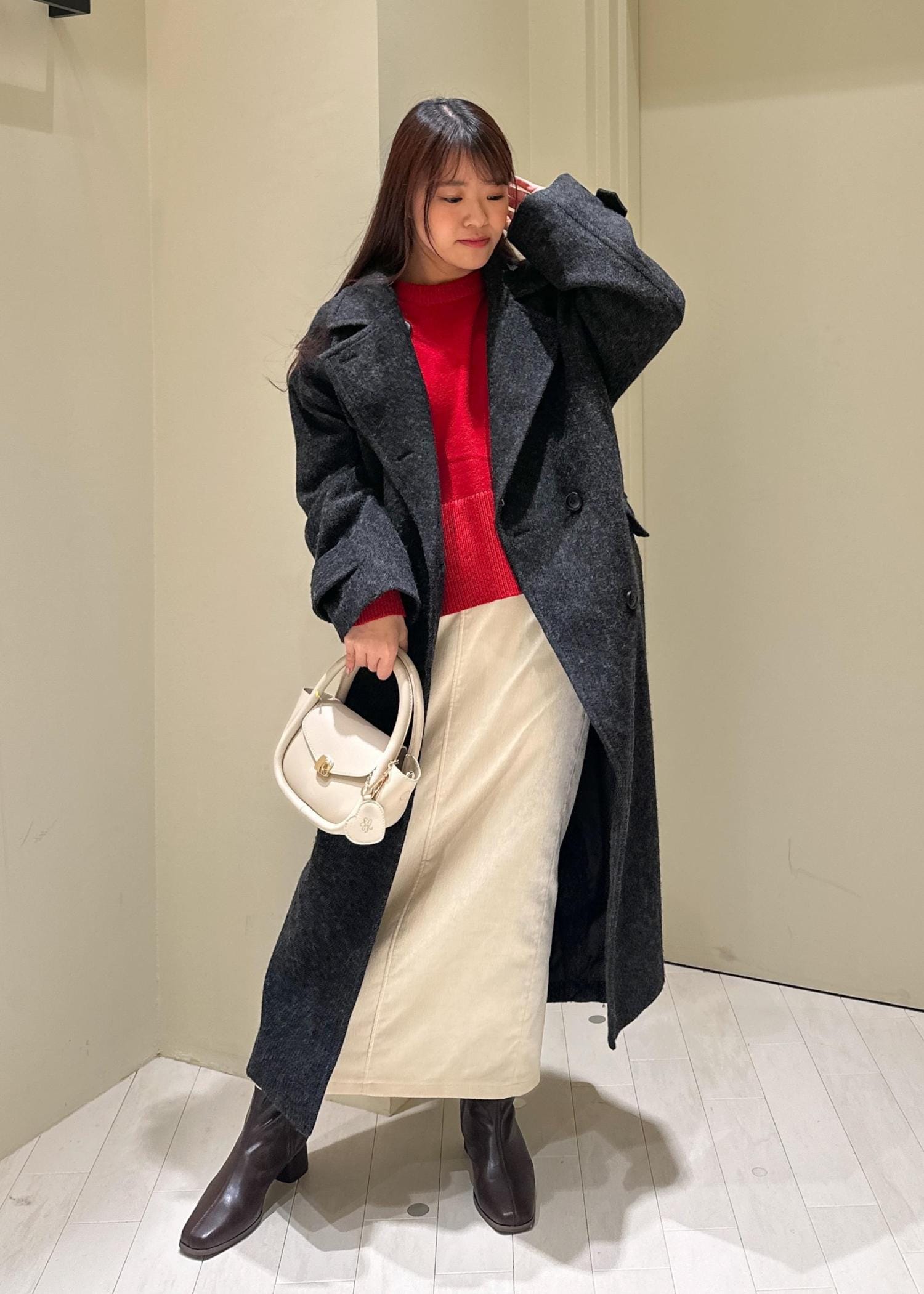 赤ニットに重たくなりすぎないよう、スカートを白にしてアウターはグレーをチョイスしました!