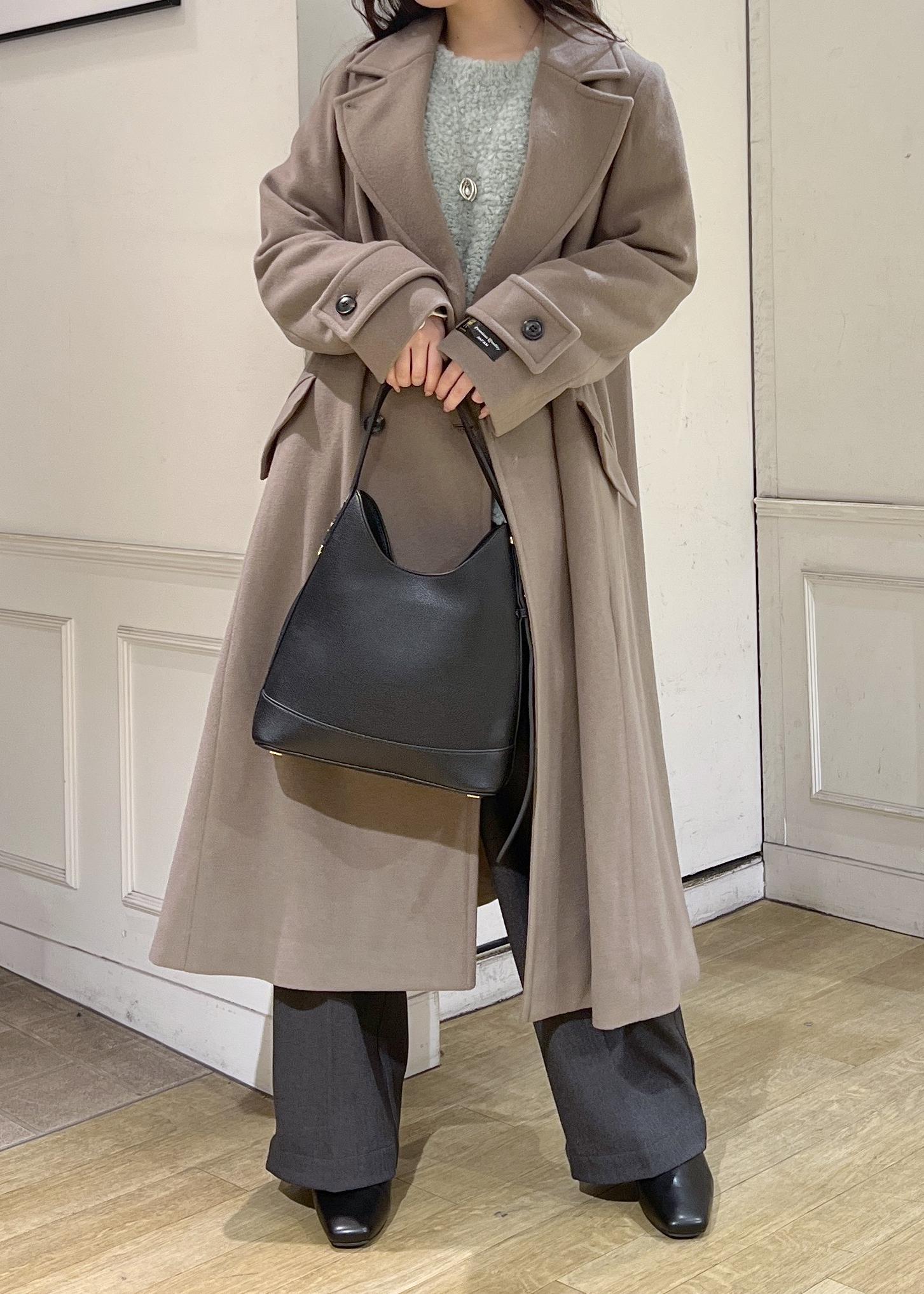 シルエットがキレイなコートに、ライトグリーンのトップスを差し色にしたスタイリングです。