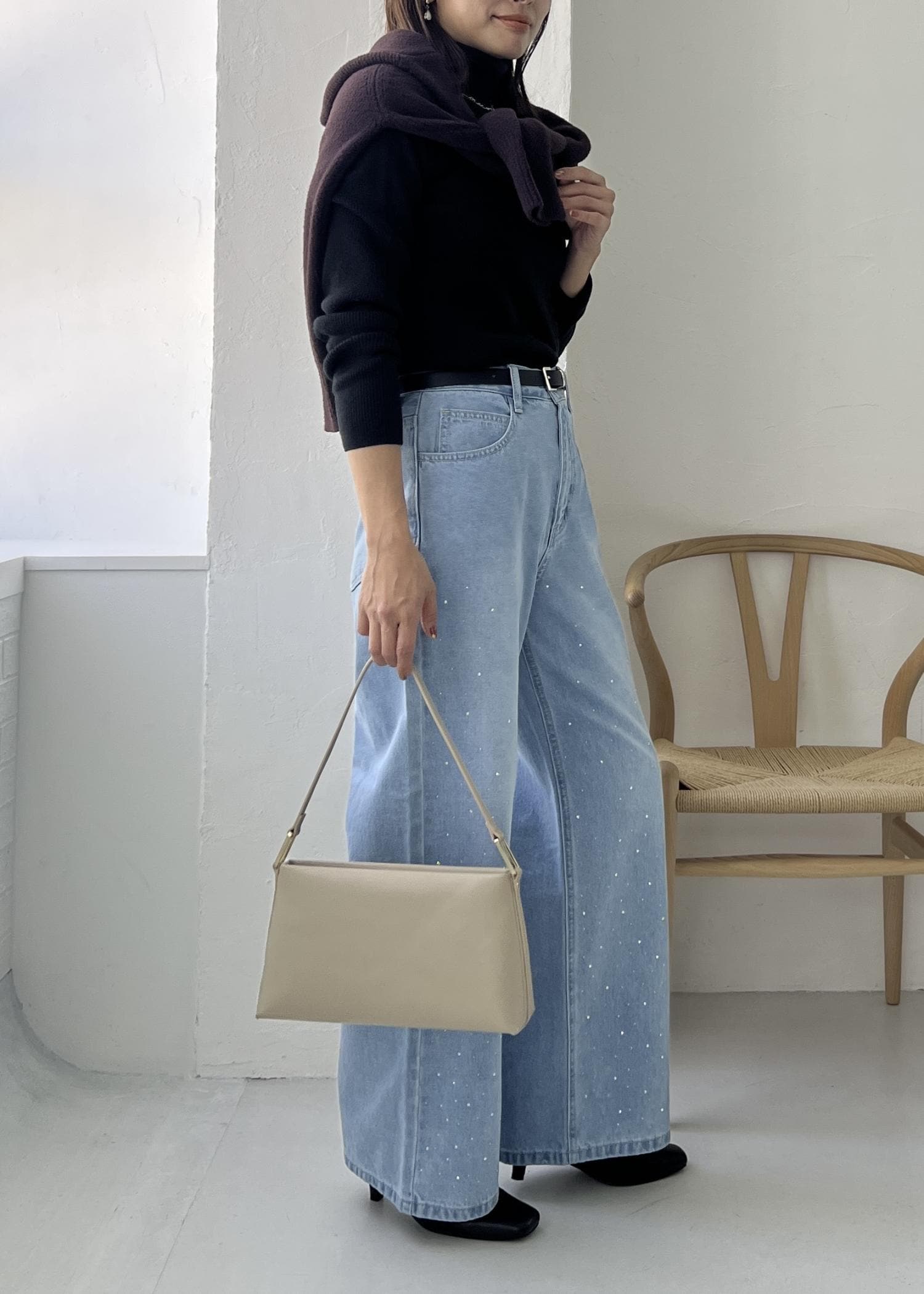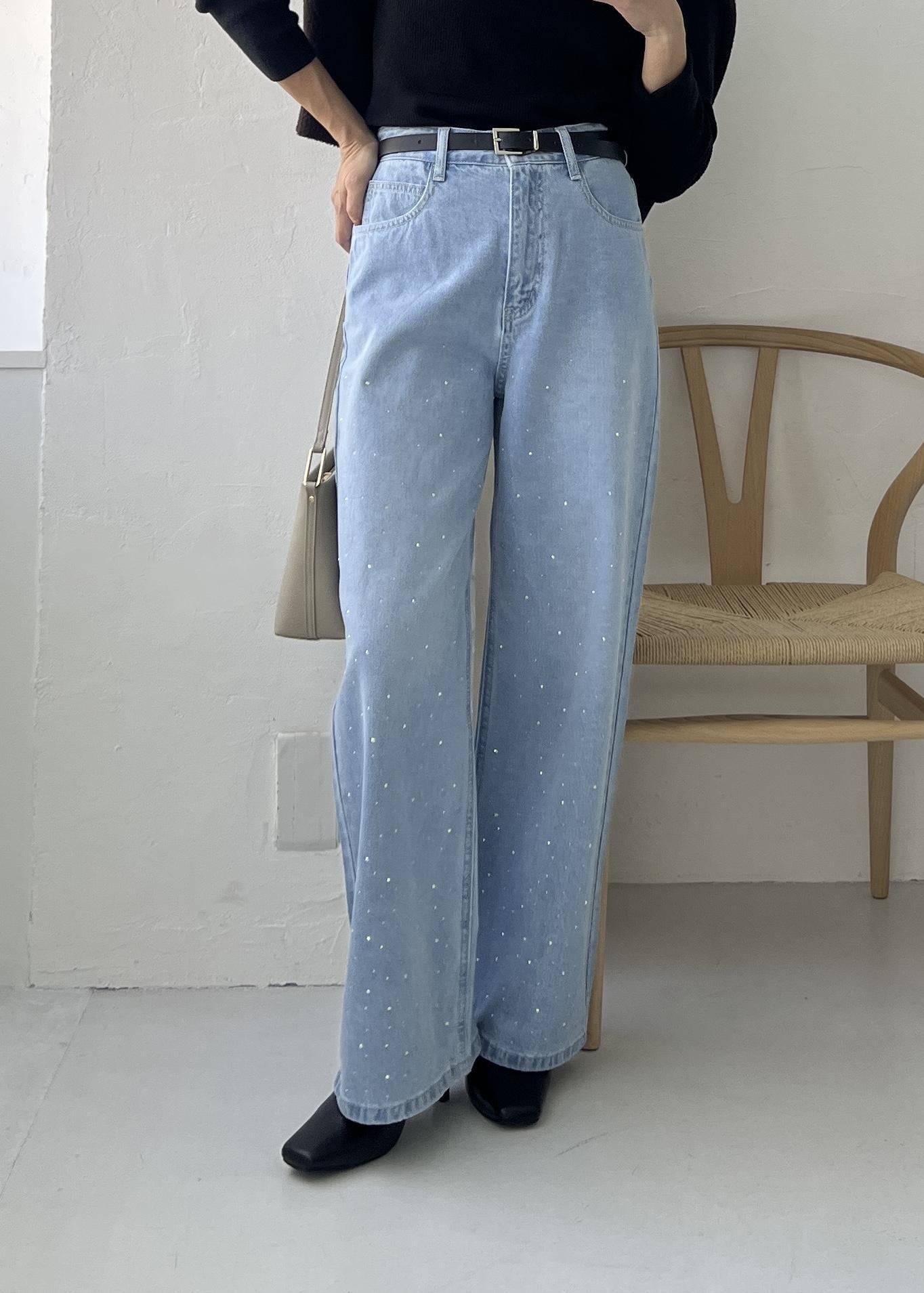 明るい雰囲気のあるビジューデニムは、シンプルなニット合わせなら大人コーデに。