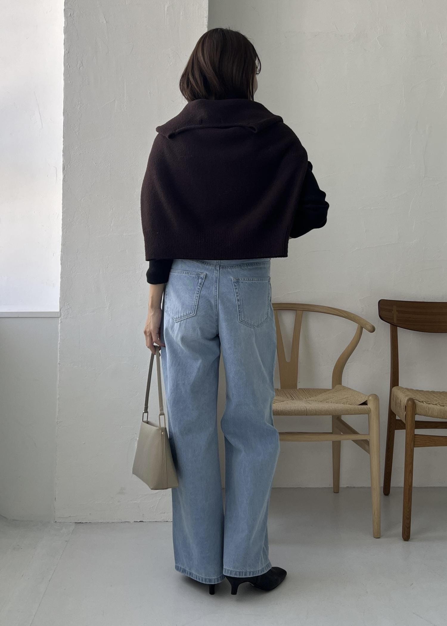ふわふわニットはストール感覚で肩掛けしてワンポイントにしても◎。