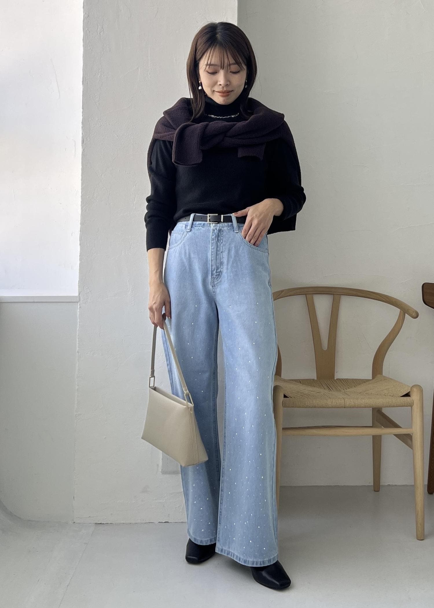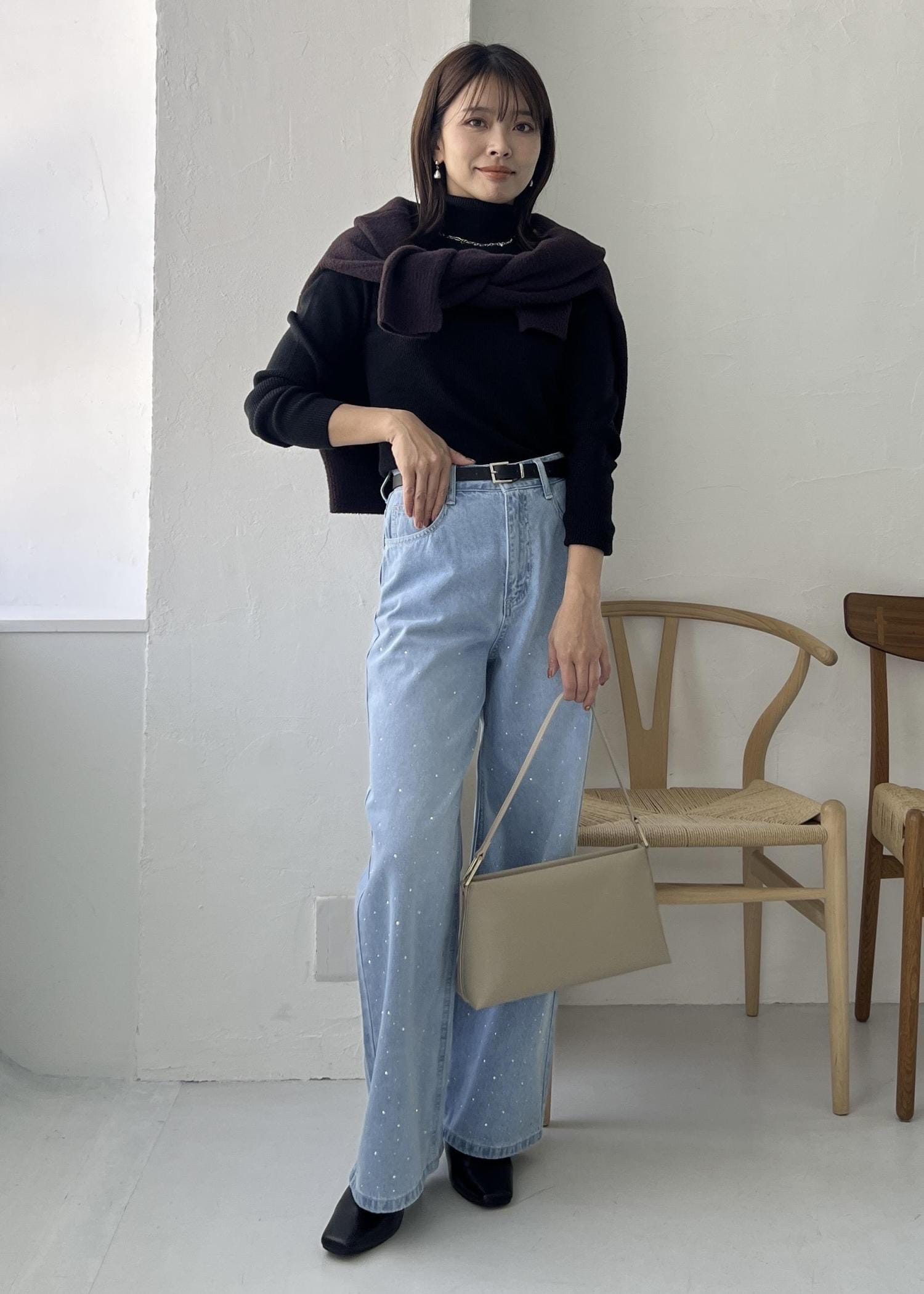 冬の明るいブルーデニムはブラックのタートルネックでシックな雰囲気になります。