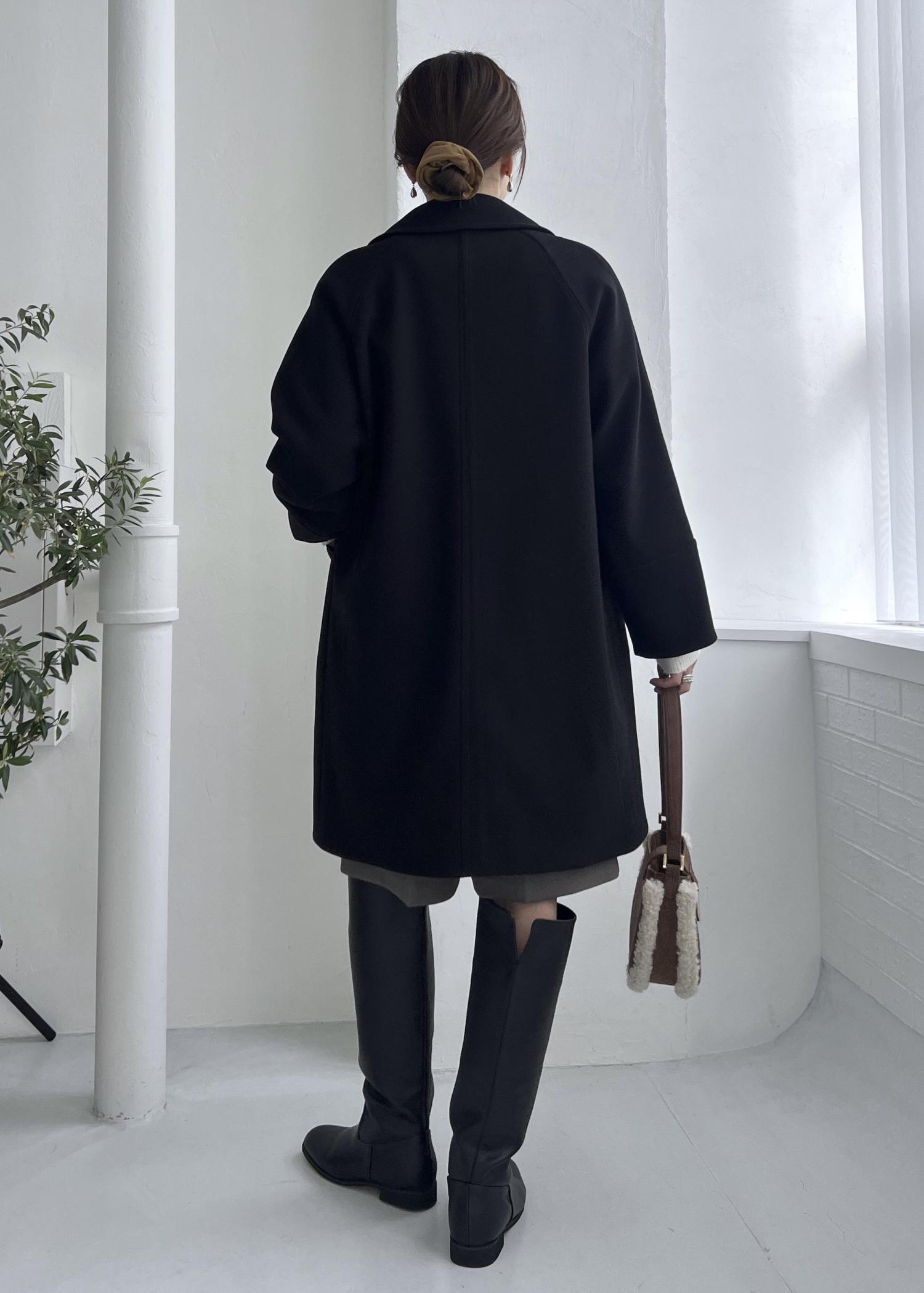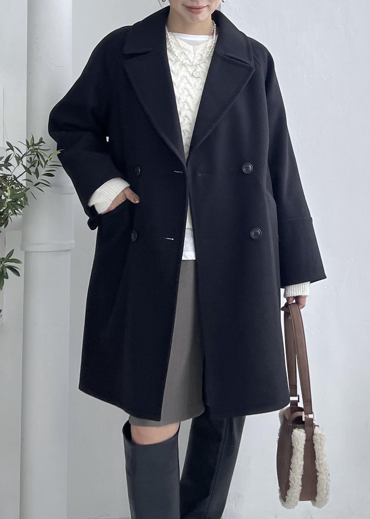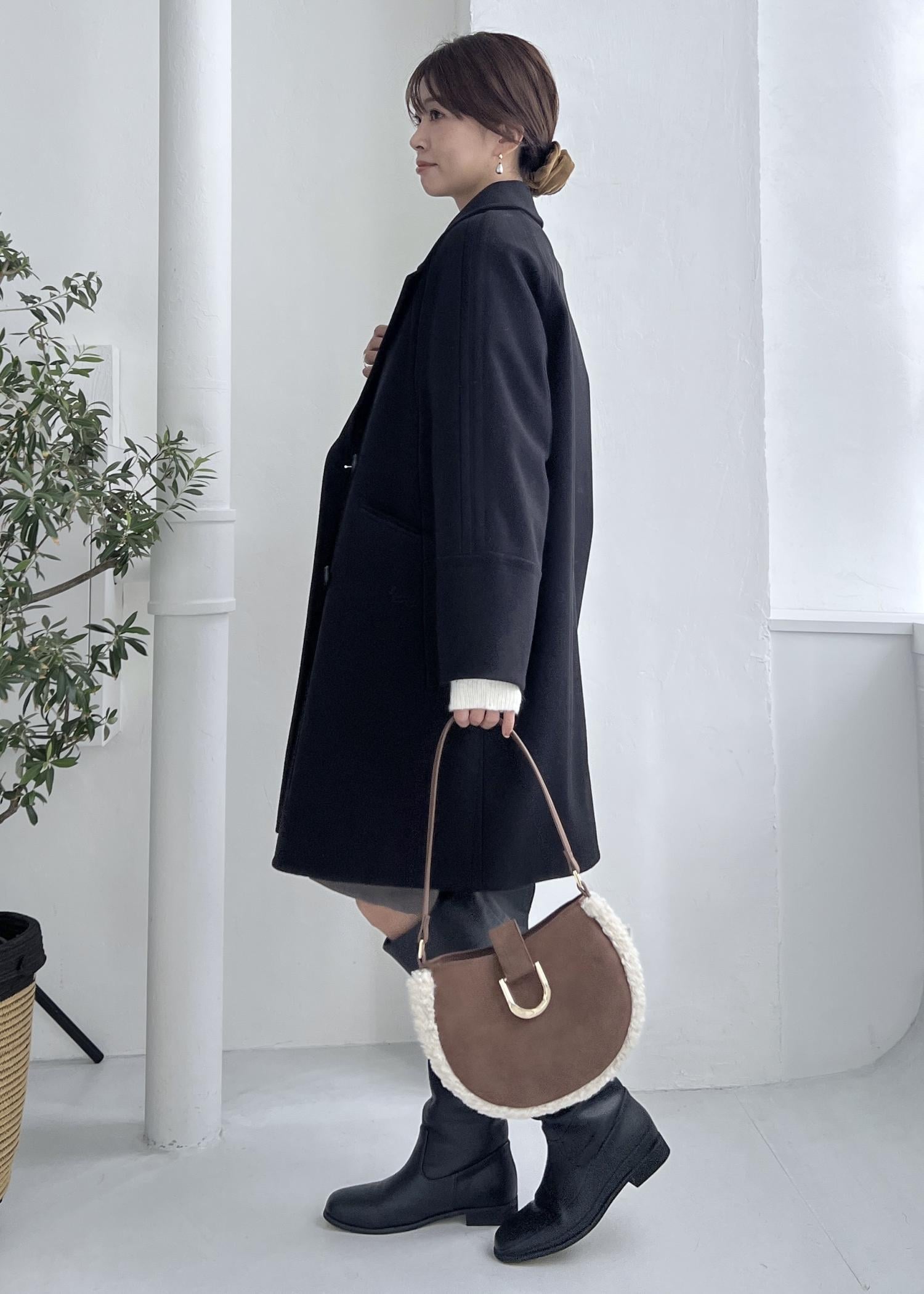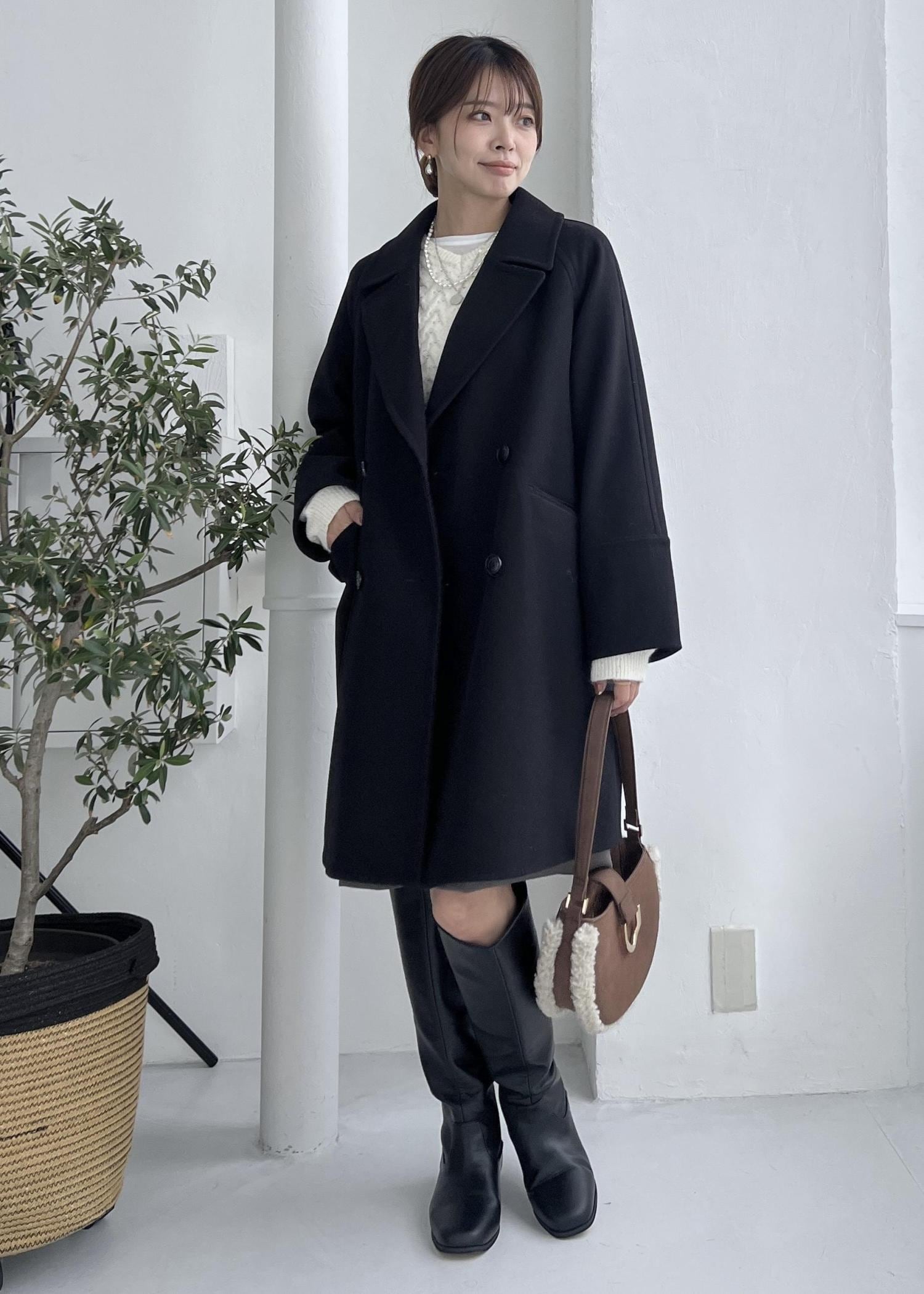 ミドル丈のブラックコートはシンプルなデザインで着回し力抜群。