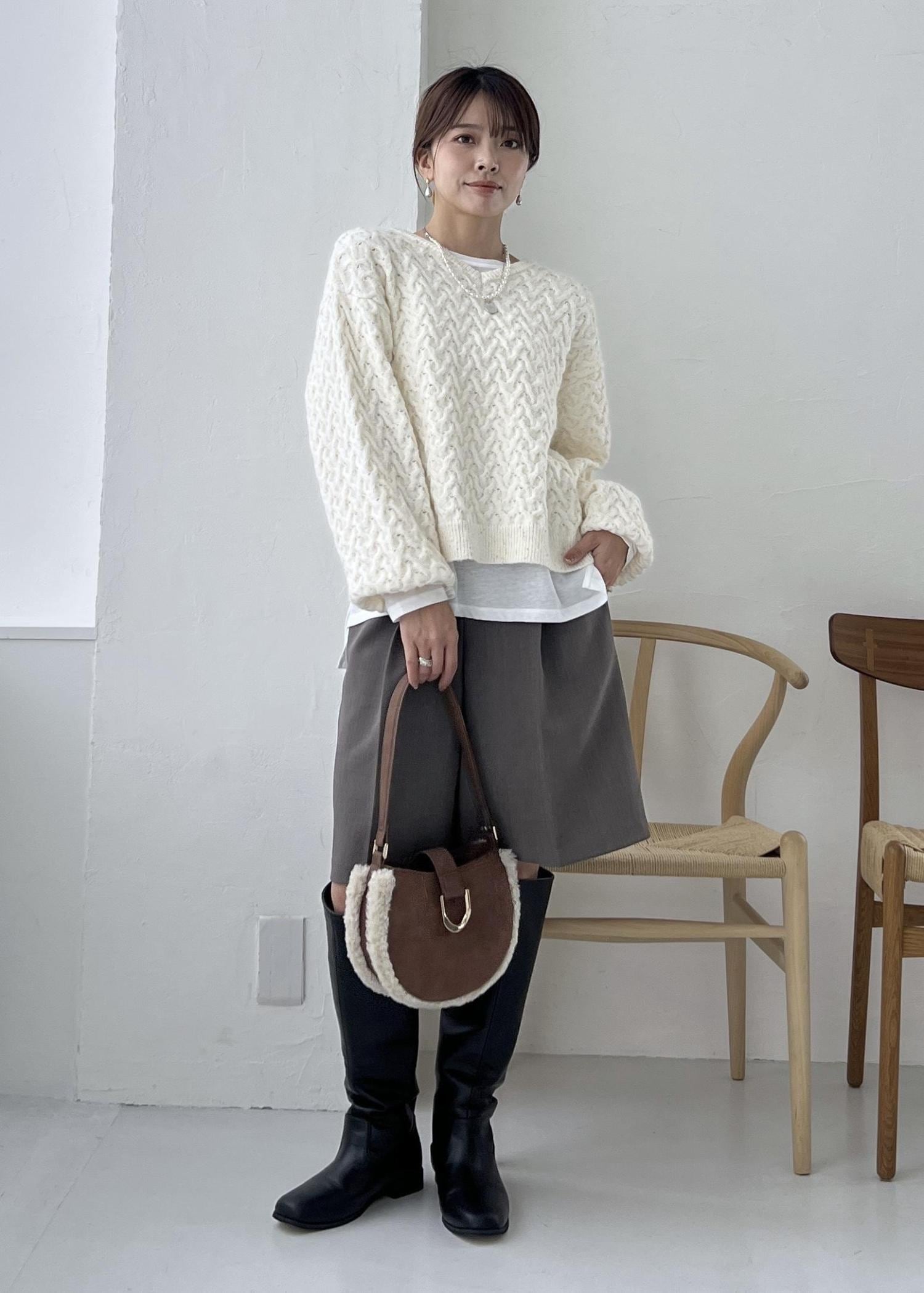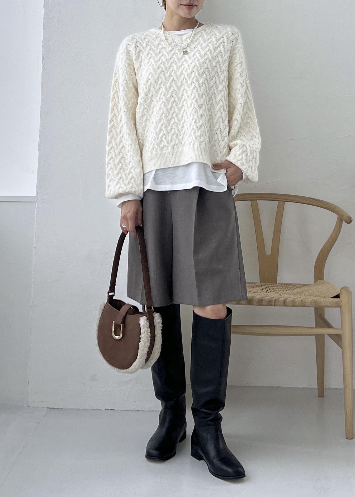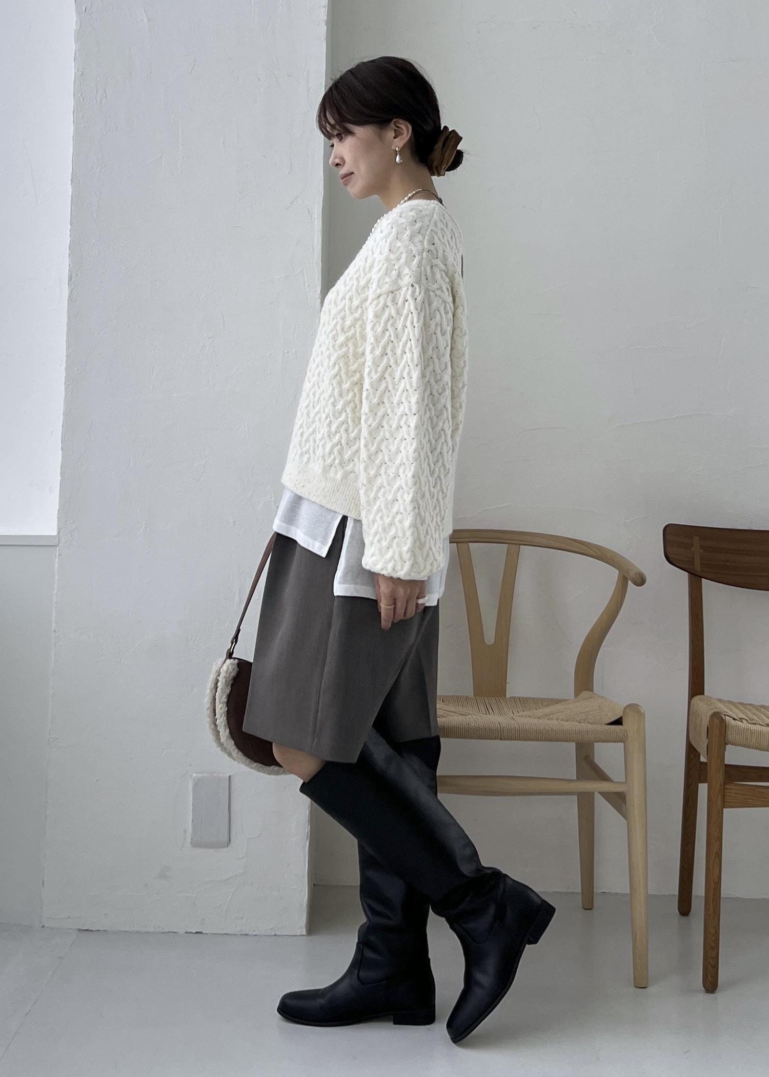 膝にかかるくらいの長さでロングブーツを合わせても◎。 -