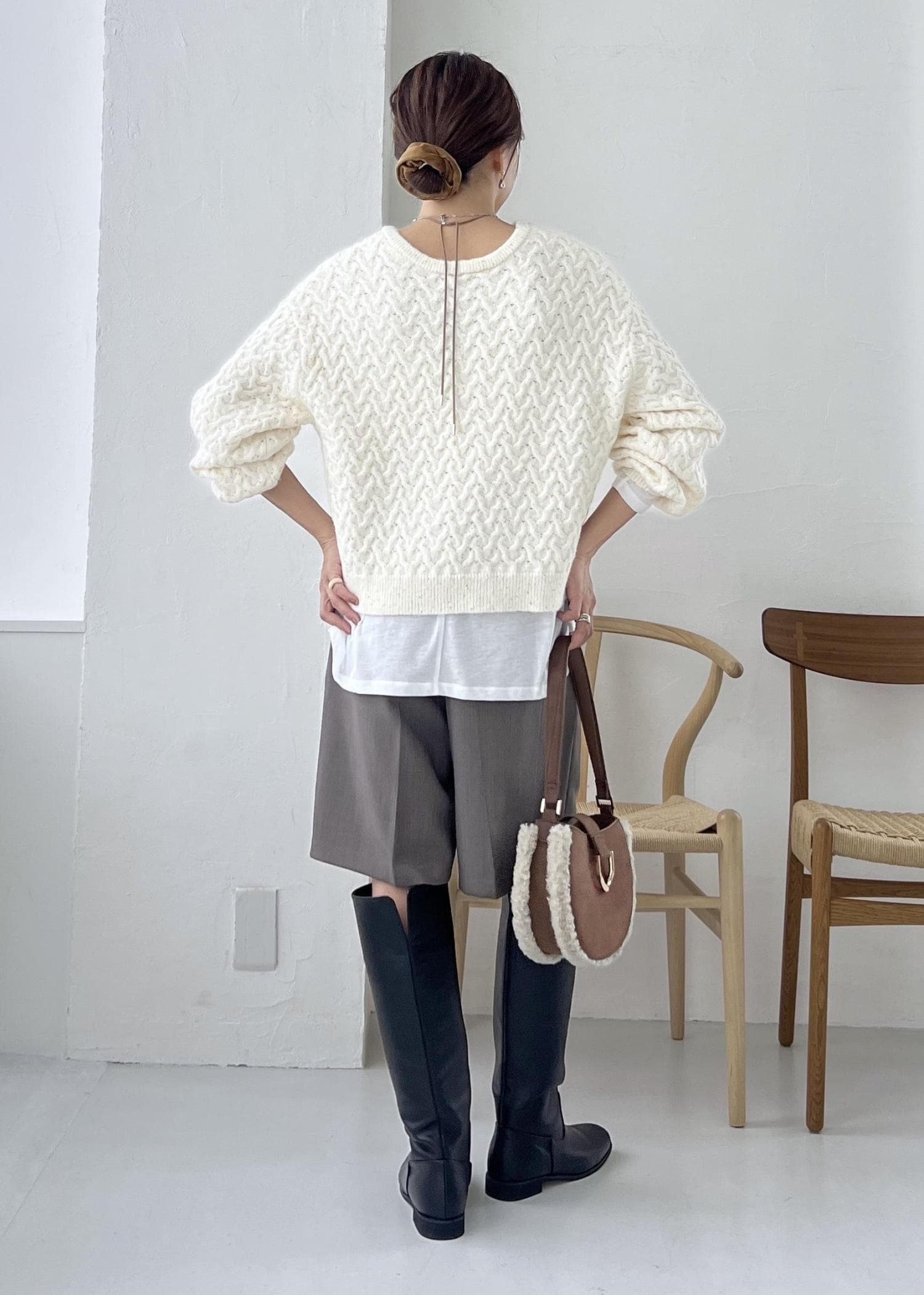 ハーフパンツ×ロングブーツで軽やかに見せるスタイリングにしました。