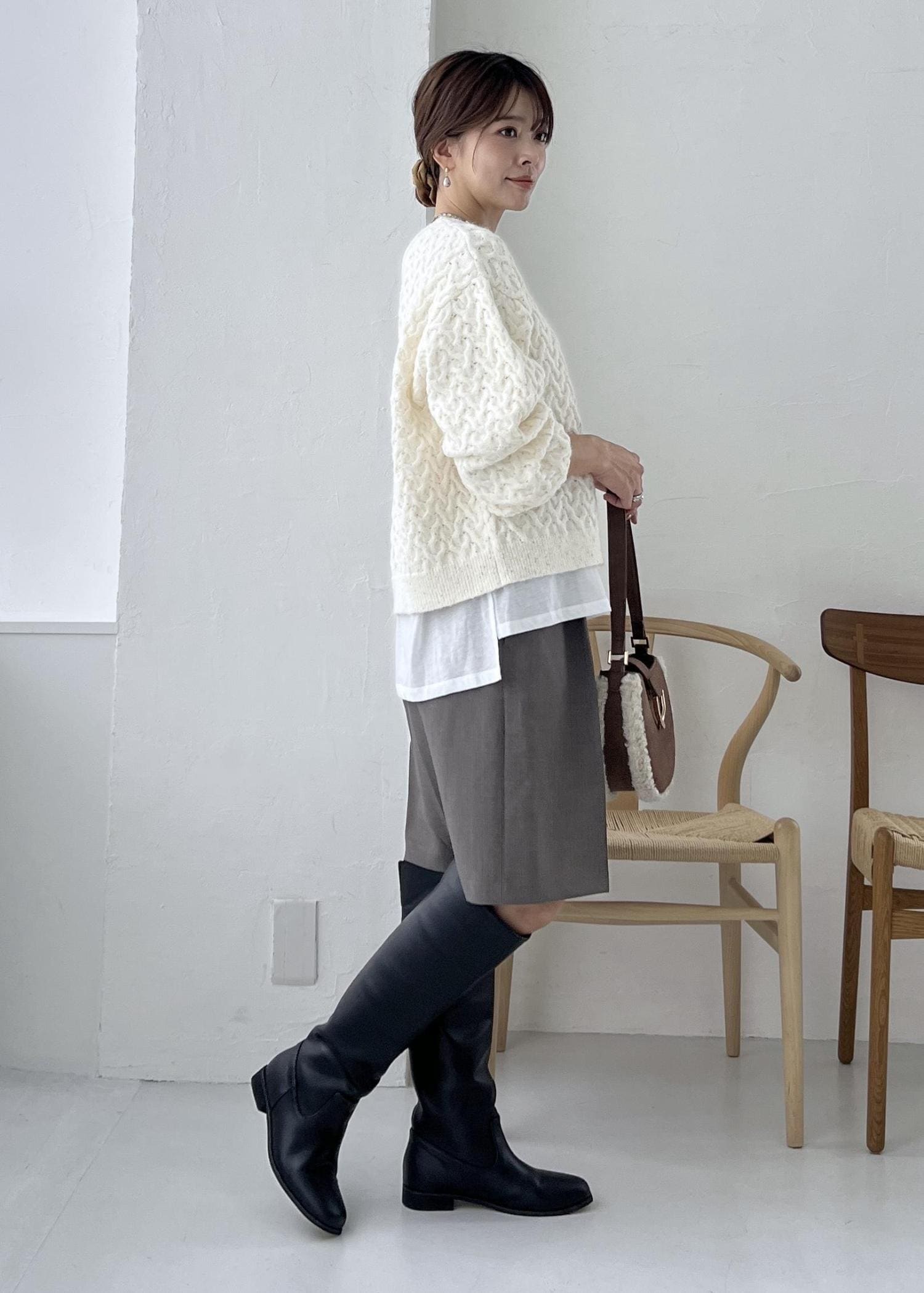 膝にかかるくらいの長さでロングブーツを合わせても◎。 -